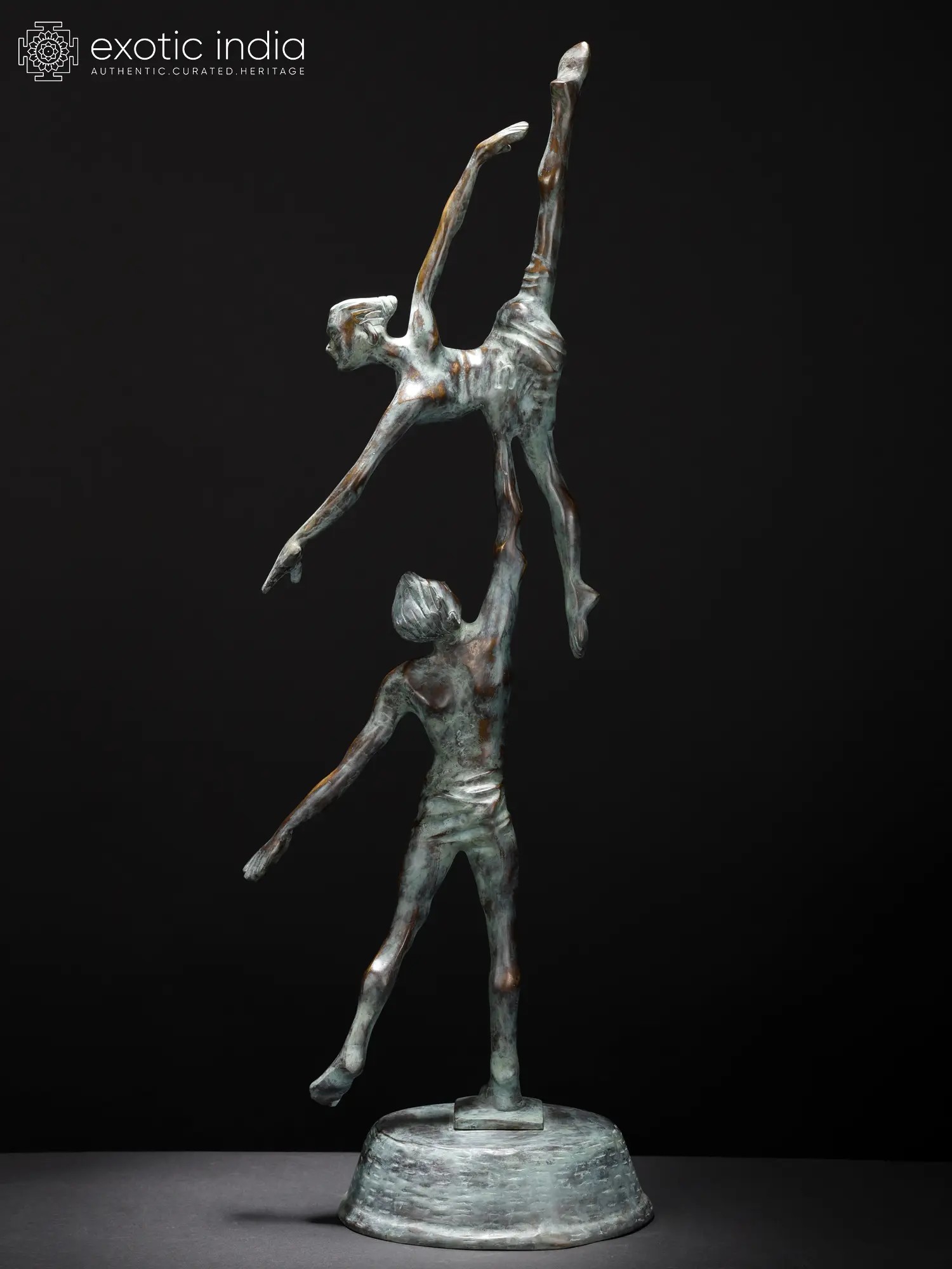 Brass, with its textured patina and shifting light, adds depth to the movement - giving the moment both permanence and motion, solidity and breath. The sculpture becomes an ode to partnership: two beings rising together, each made higher by the presence of the other.