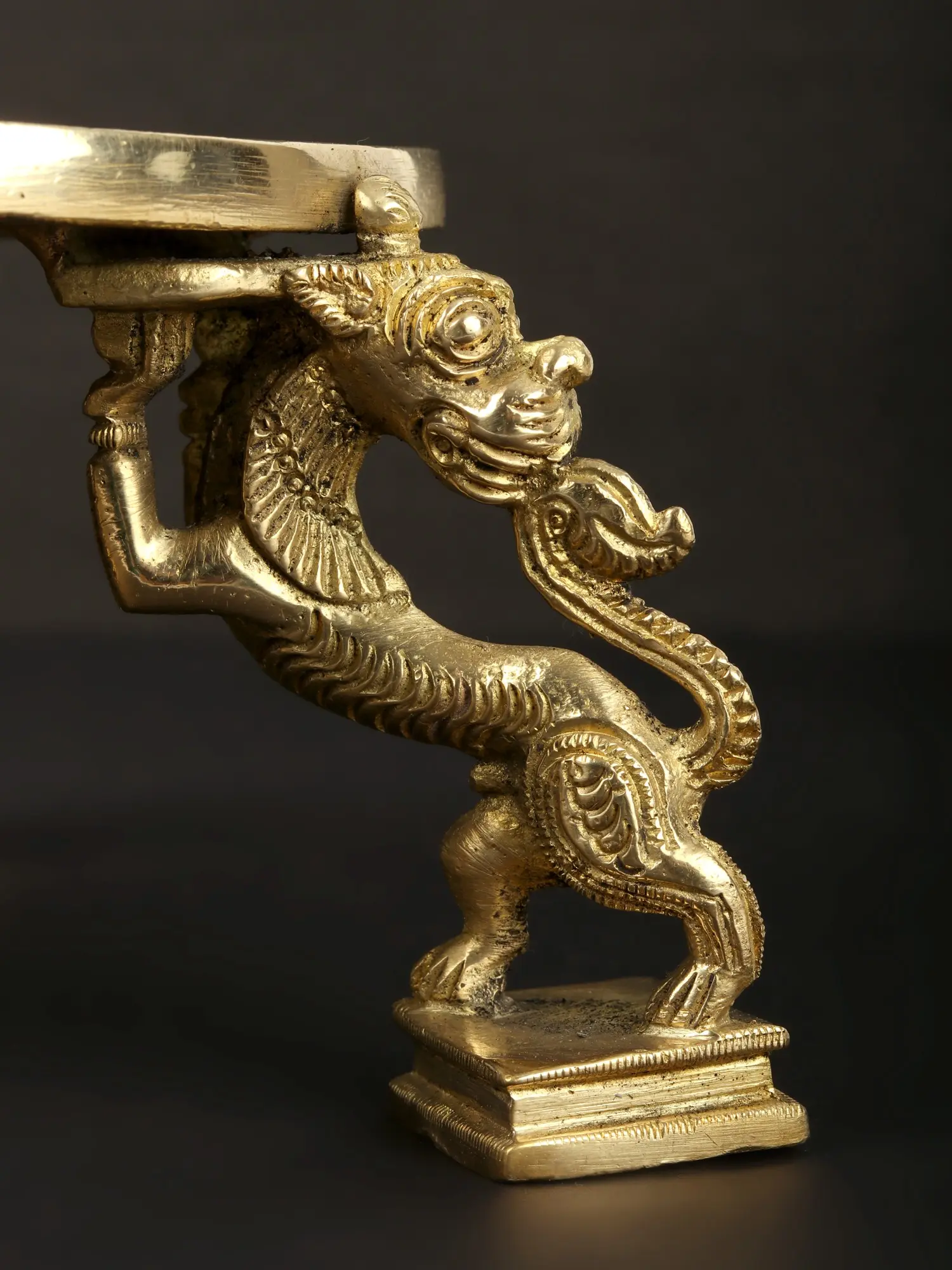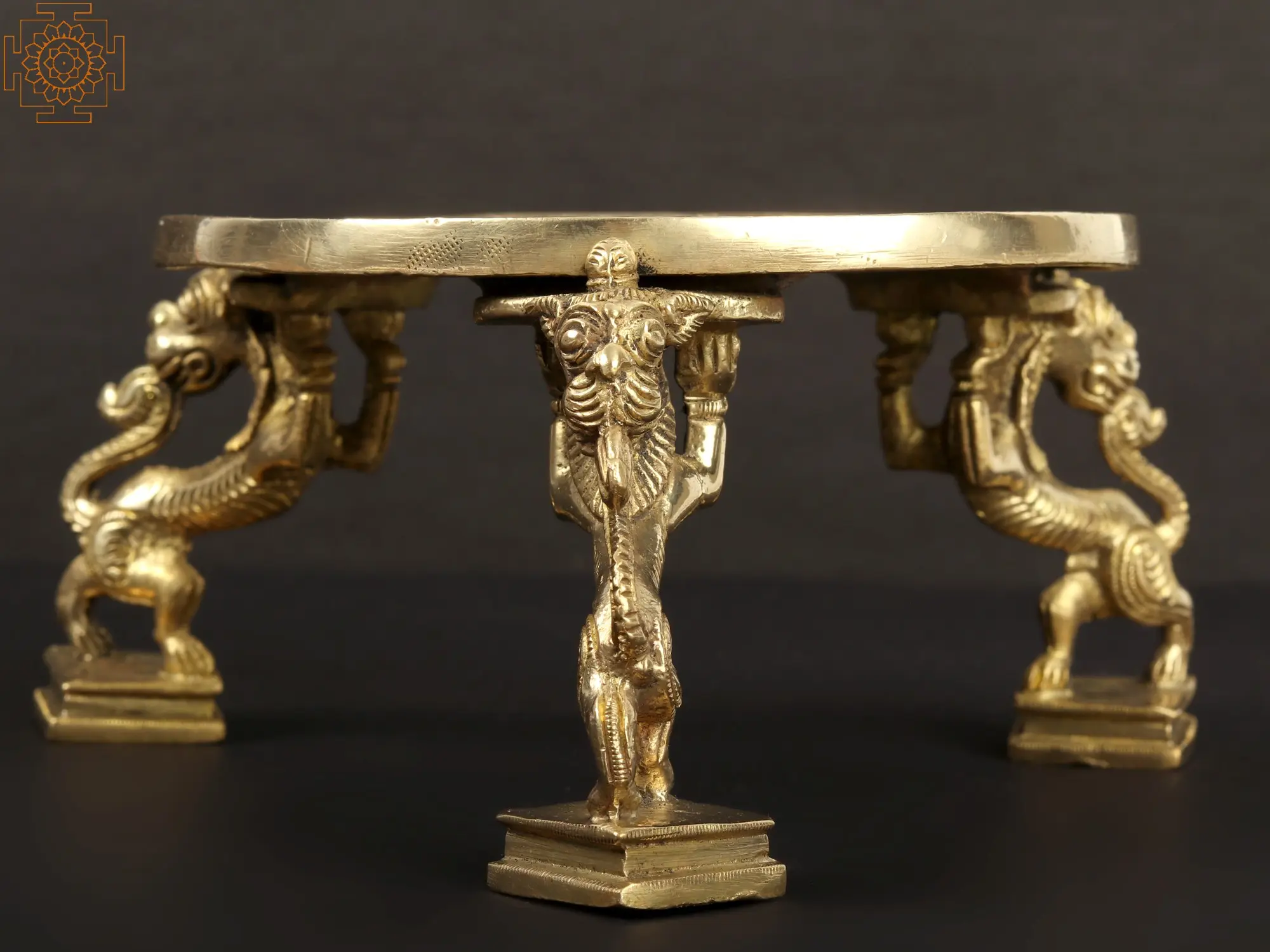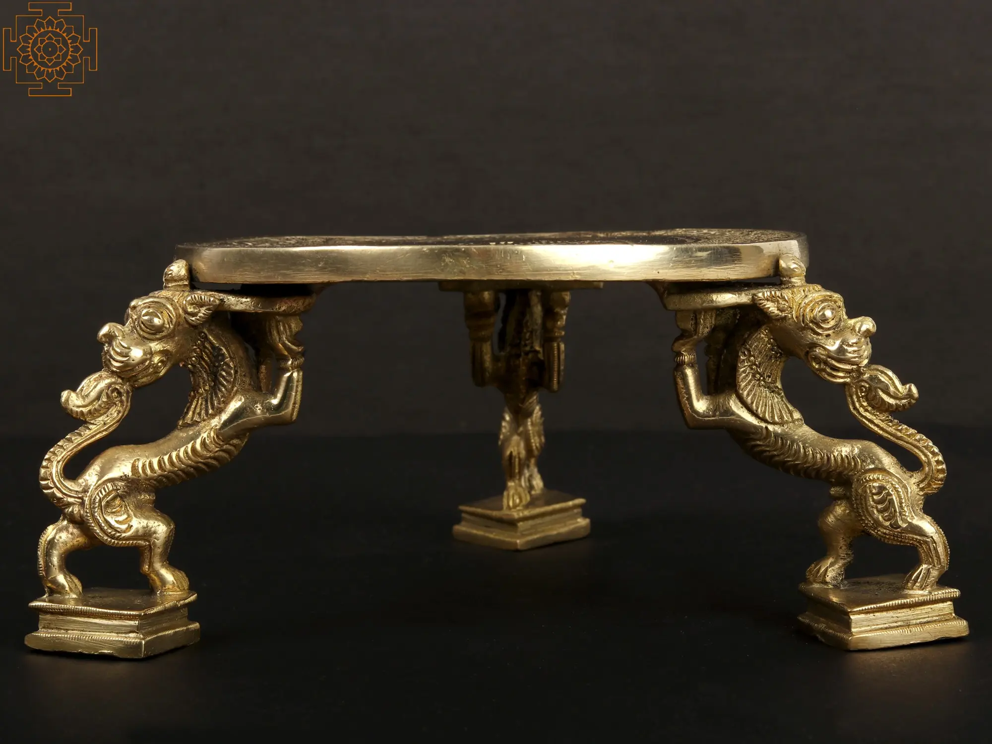 Crafted with meticulous artistry, the Ritual Chowki with Yali Stand harmoniously merges spiritual significance and aesthetic splendor. This sacred pedestal exudes reverence, its surface adorned with intricate carvings and delicate detailing. Atop rests the Yali, a mythical guardian revered in Hindu tradition for its protective symbolism. Its regal posture and precise craftsmanship add an air of majesty, invoking a sense of awe and veneration. Every curve and motif in this piece speak of devotion and artistic mastery, weaving a visual tapestry of profound spiritual resonance. Beyond its aesthetic allure, the Yali imparts a divine presence, signifying not only protection but also a conduit for spiritual connection. Embrace the sacred elegance of this masterpiece, inviting timeless grace into your sacred space.