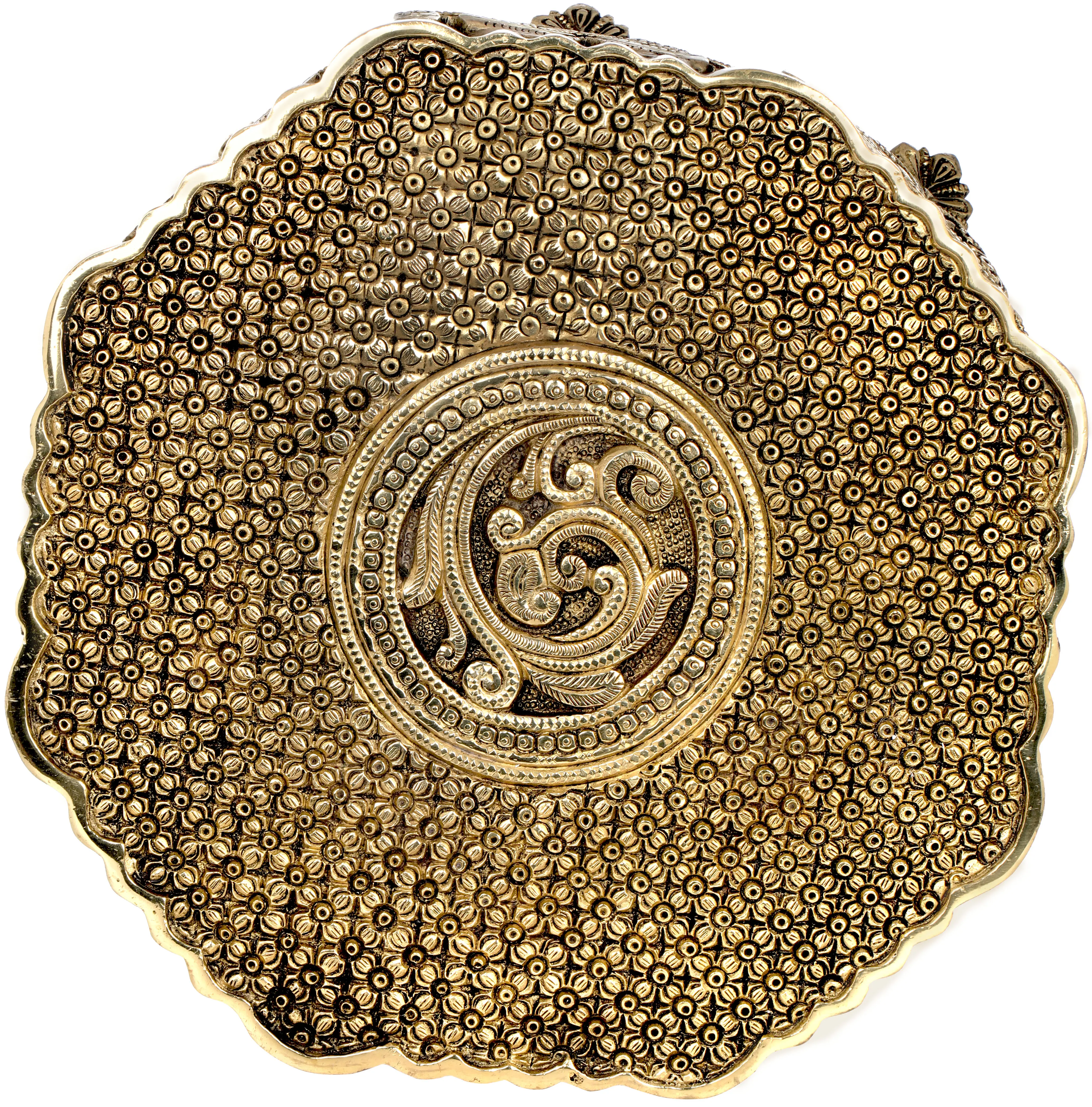 This Ritual Chowki is a decorated pedestal for placing small statues of offerings made to the Gods and Goddesses. This brass ritual chowki is beautifully designed, with traditional flower motifs arranged meticulously. They look like a jaal pattern from afar. The stands of the chowki are designed inspired by the Hoysala-style coiled vines. There has been the use of a black patina in some places to bring drama to the piece. This Ritual Chowki is a very useful object that carries a sense of beauty and art.