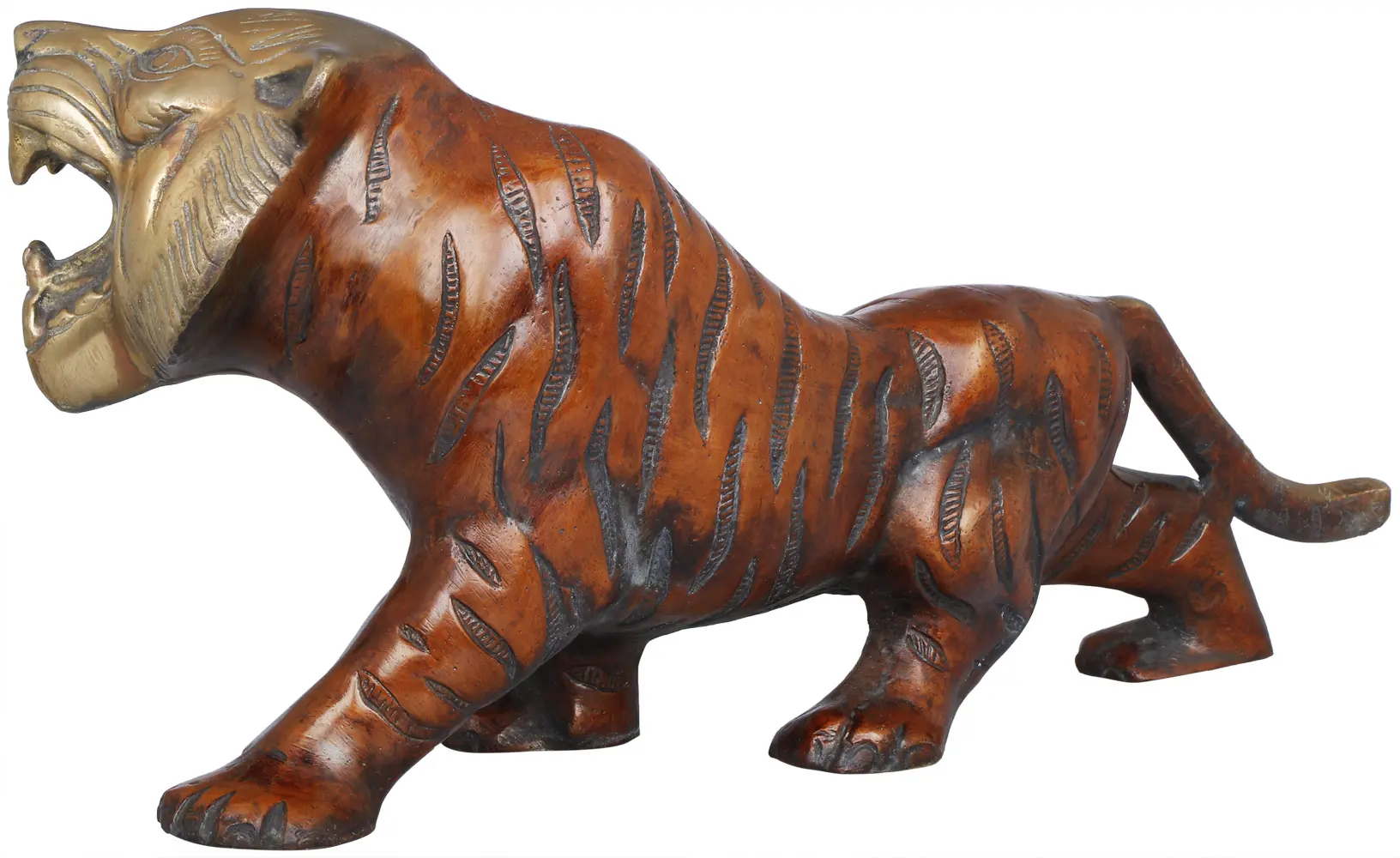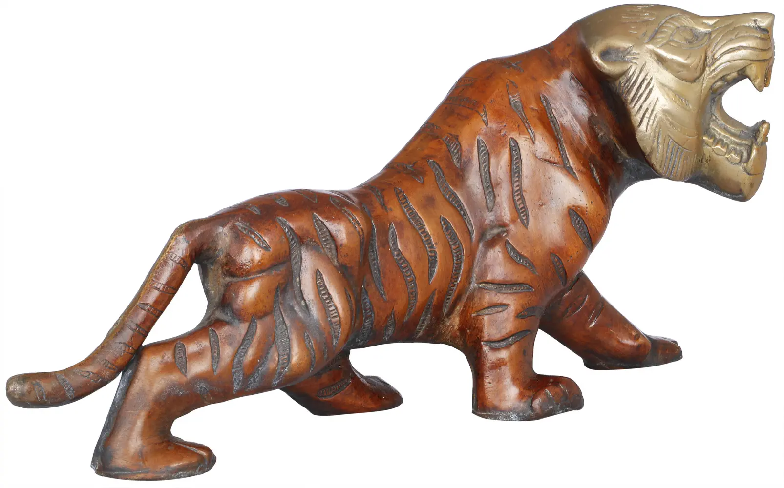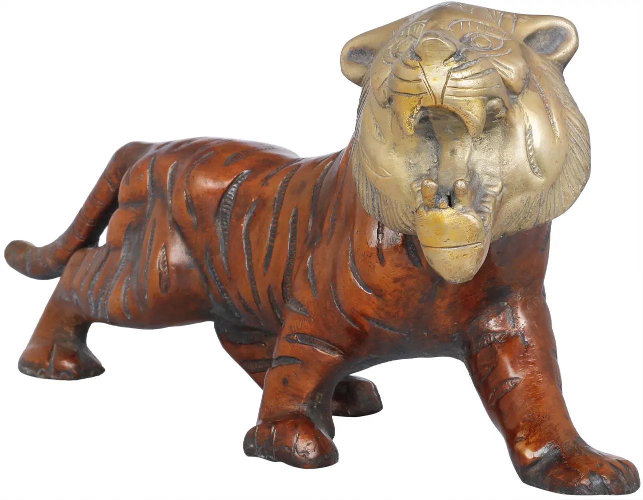 Crafted from brass, this piece showcases exceptional skill and attention to detail. The smooth, lustrous finish accentuates the contours of the tiger's form, highlighting the intricate details of its anatomy. The deliberate contrast in color lends depth and realism to the overall appearance, enhancing the visual impact of the sculpture. The careful artistry and high-quality material used in the creation of this piece ensure its durability and longevity. It is an investment in fine art that will be appreciated for generations to come. The artistry and craftsmanship of the piece ensures that it can withstand the test of time.