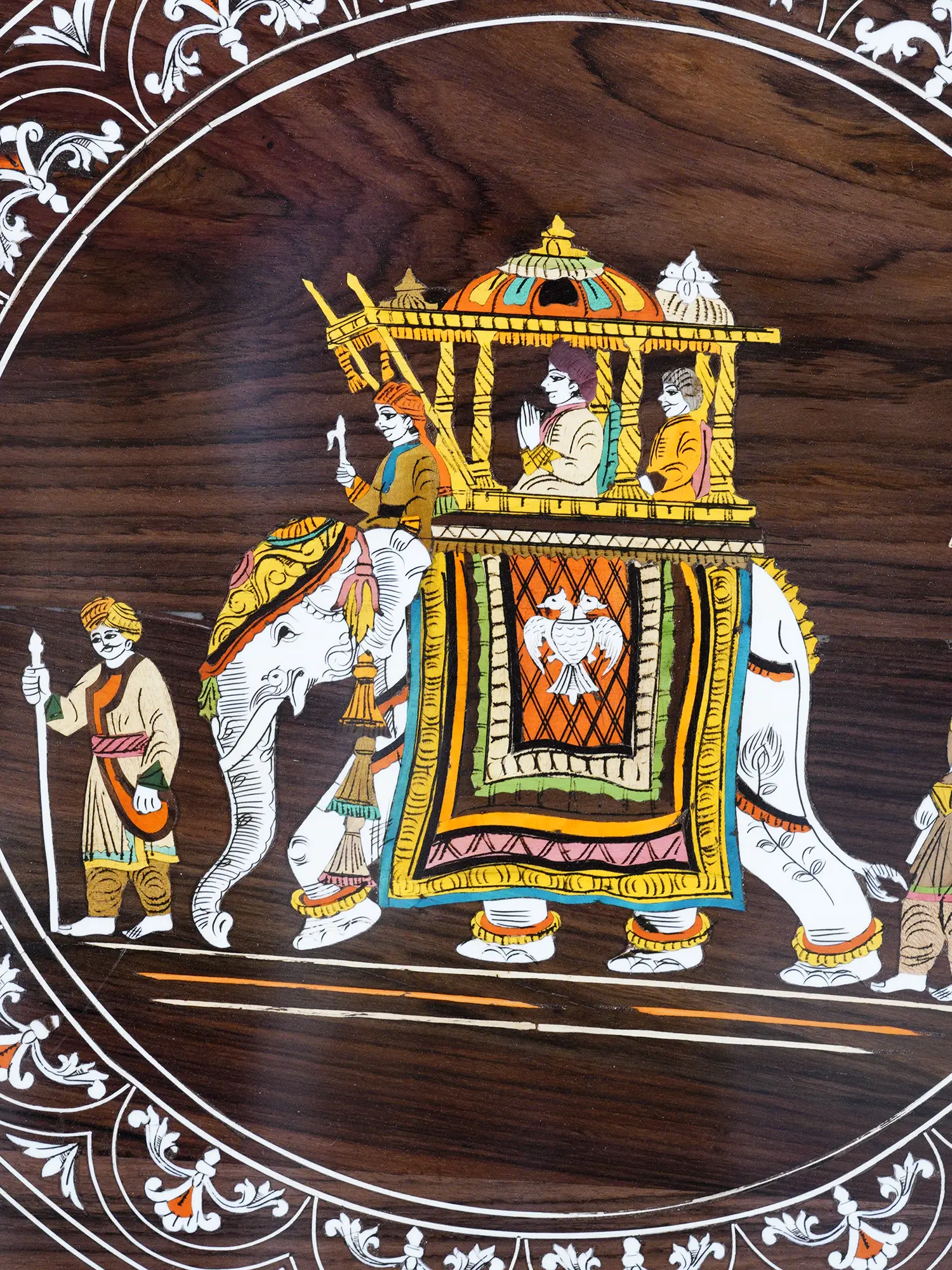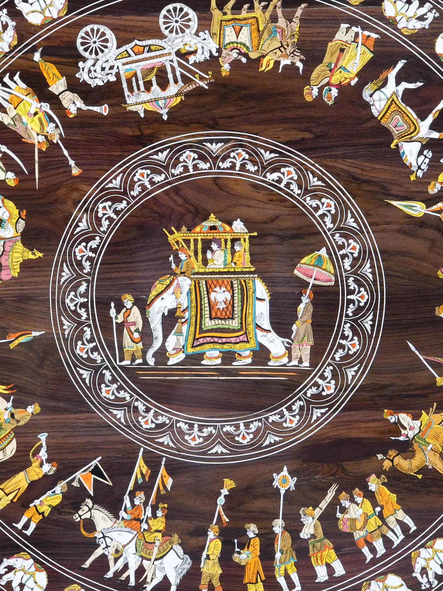 Features a detailed circular inlay depicting a royal procession, complete with elephants, attendants, and cavalry.