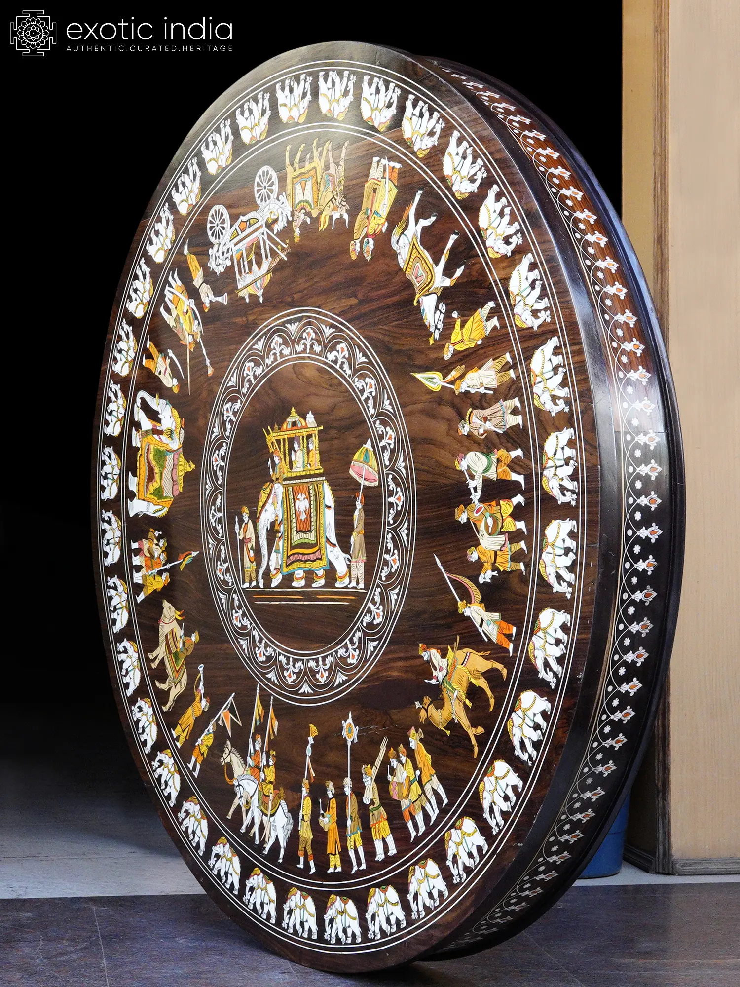 The generous forty-eight-inch diameter provides a magnificent canvas for the detailed "Royal Procession of the King" motif. You'll appreciate the intricate depictions of attendants, cavalry, and the central elephant bearing the royal presence, all rendered with vibrant pigments and masterful inlay work. The deep, rich tones of the rosewood serve as the perfect backdrop, making the vivid storytelling of the procession truly come alive.