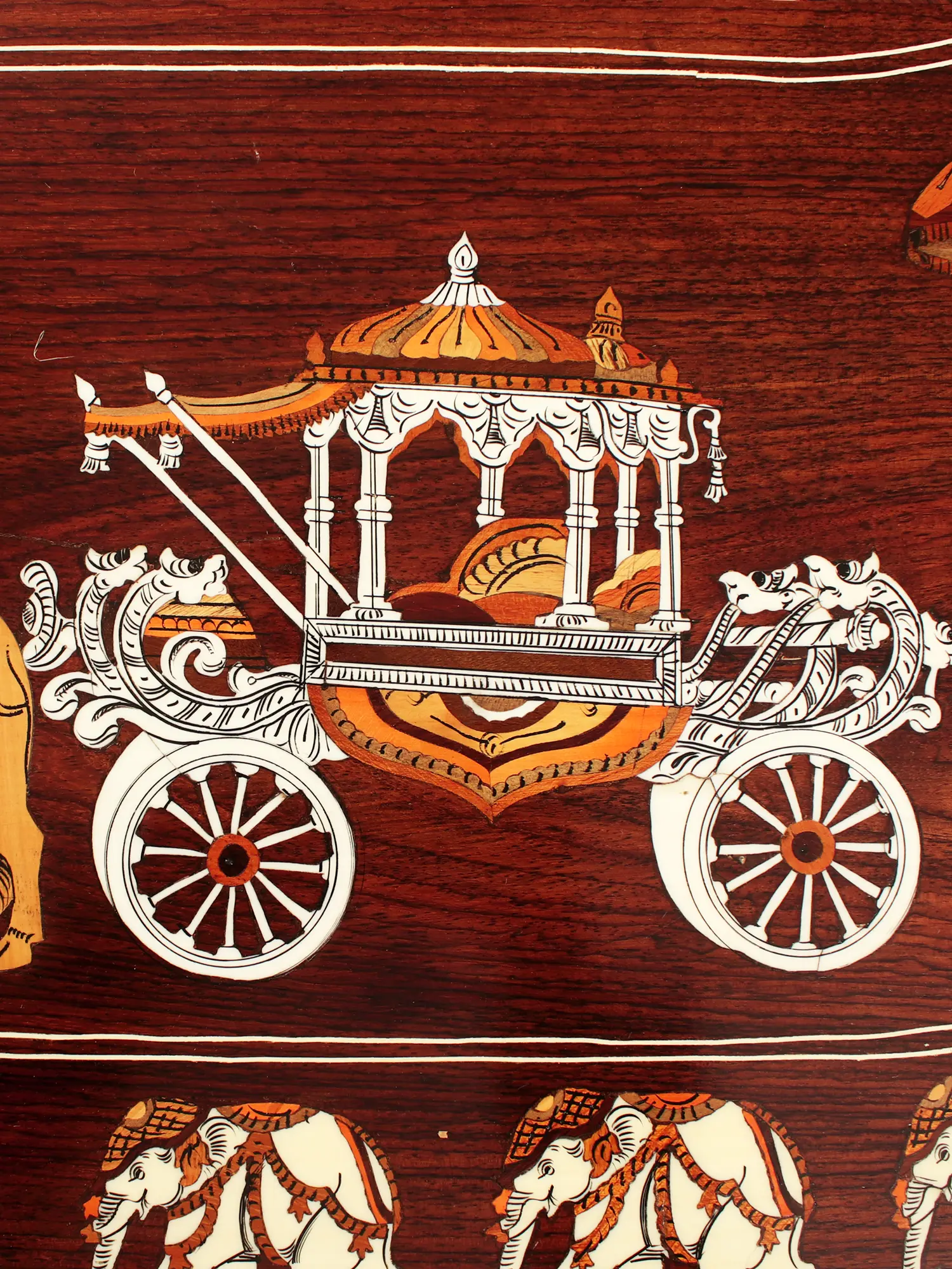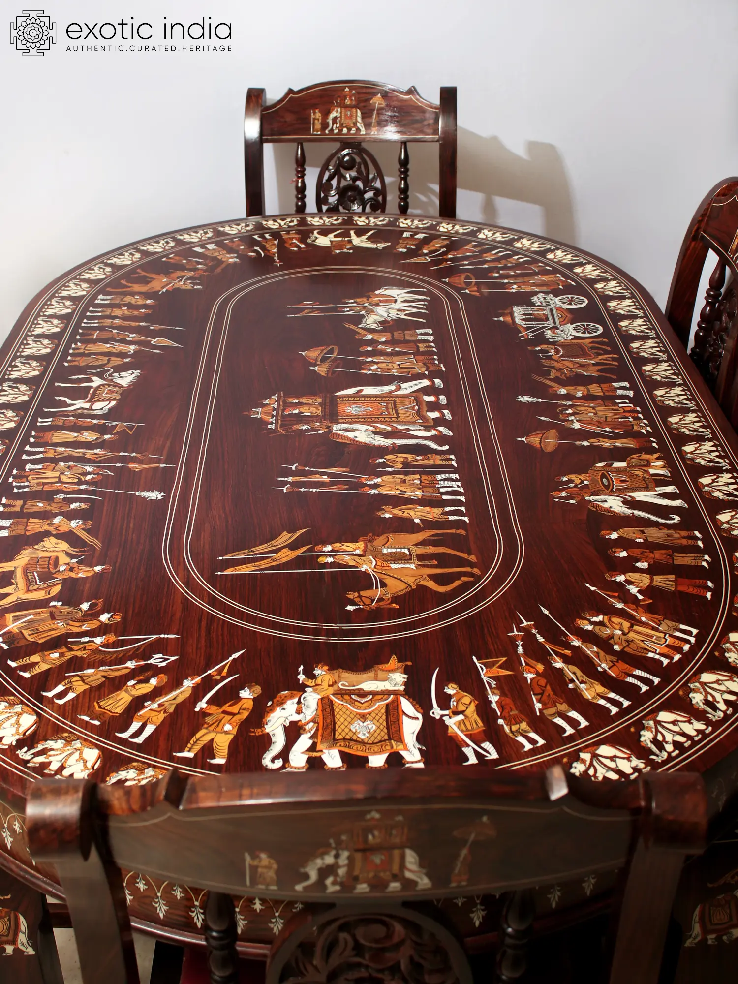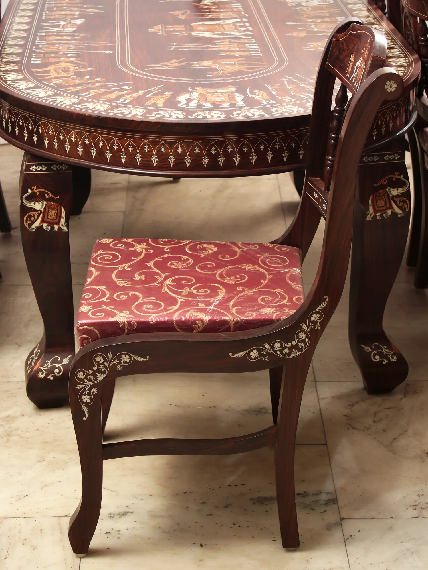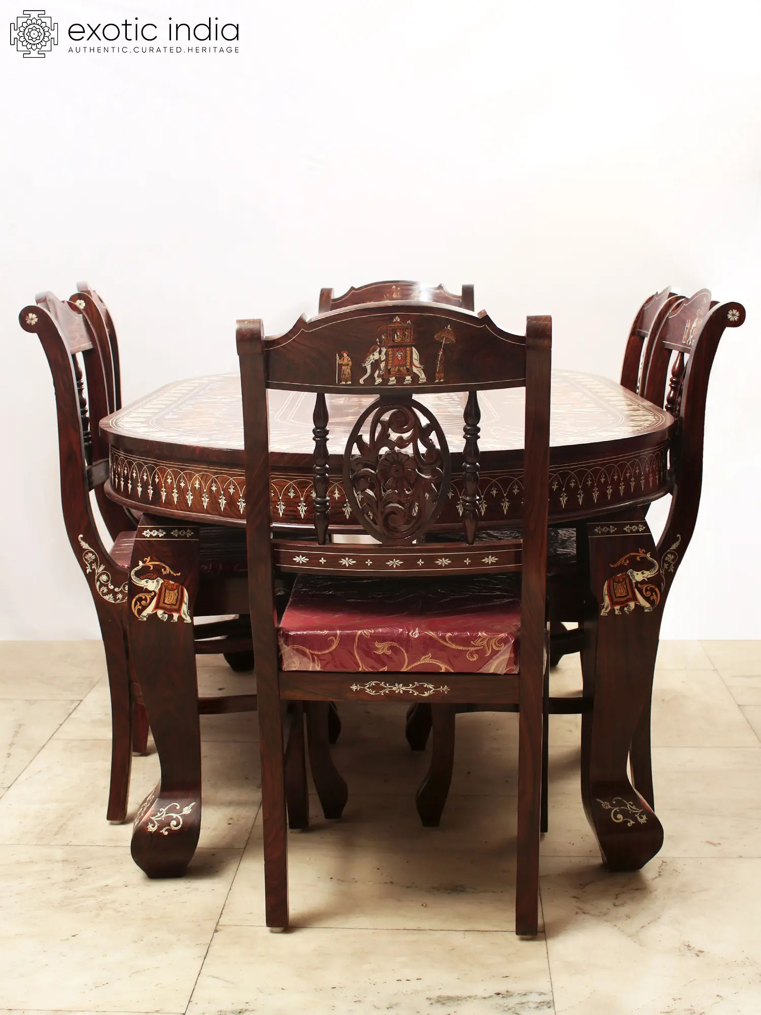 This Rosewood Six-Seater Dining Table Set, adorned with images of a Royal Procession in Inlay Work, transcends its utilitarian purpose, transforming the dining space into an opulent haven and creating the most suitable environment for having food and getting enriched by it. The table, featuring a resplendent inlay work tabletop, becomes the centerpiece, radiating regal charm and elevating the overall aesthetic. The chairs, embellished with inlay work on legs, backrest, and European-style floral frames, exude sophistication. Maroon brasso cushions complement the dark brown chair frames, adding a touch of luxury.