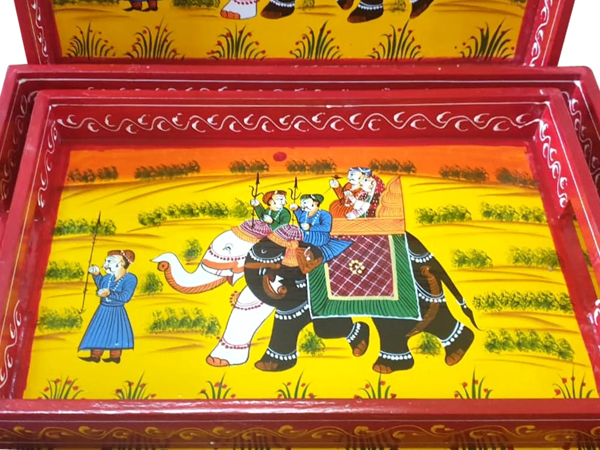 The beauty of these trays lies not only in their stunning imagery, but also in the meticulous craftsmanship that brings them to life. Skilled artisans have carefully hand-painted each scene, capturing the essence of royal heritage with every brushstroke. The intricate details of the elephant's adornments, the expressions of the figures, and the lush landscapes are all rendered with exceptional precision and care. This dedication to artistry ensures that each tray is a unique and valuable addition to your home.