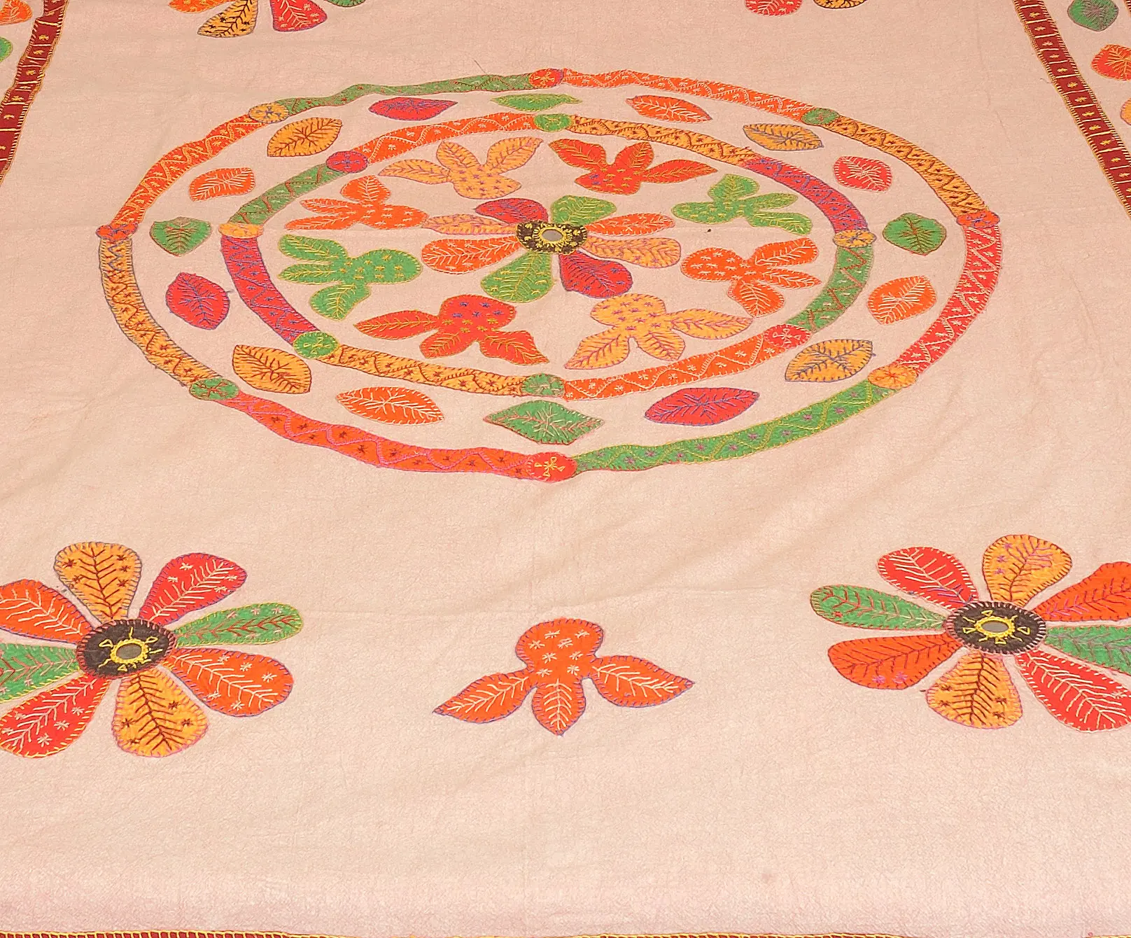 The bedspread is decorated with beautifully arranged floral designs created using the appliqué technique. This intricate process involves carefully sewing pieces of fabric onto the base cloth, resulting in a stunning layered effect. The vibrant colors of the flower petals, ranging from warm reds and oranges to refreshing greens and yellows, create a visually captivating display. Adding to the unique charm of this bedspread are delicate mirrors, strategically placed within the floral patterns. These mirrors catch the light, creating a subtle shimmer that adds a touch of glamour and sophistication. Each mirror is carefully secured, ensuring durability and long-lasting beauty.