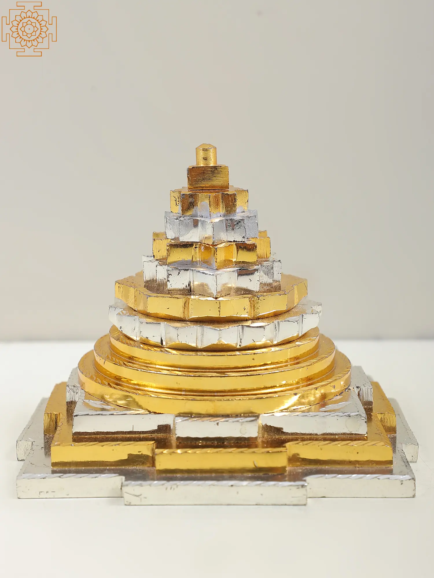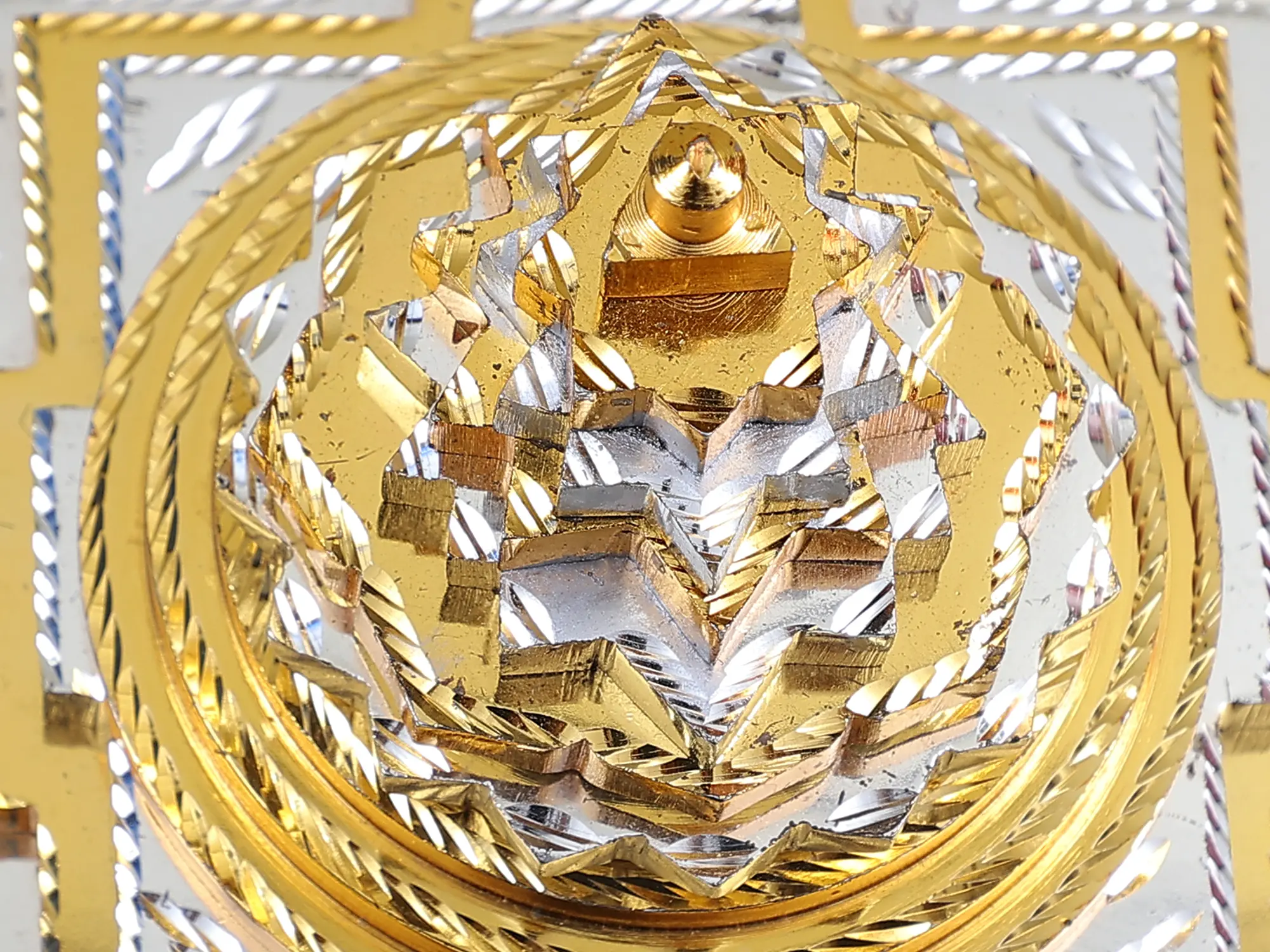 This panoramic, sacred multi-pyramid Brass Sri Yantra in its 3- Dimensional form is known as the Maha Meru Shree Yantra. Because of its nine triangles, Shri Yantra is also known as the Navayoni Chakra. The Mandala rises from the three squared bases to the Lotus Petals in various circles and the interlocked Triangles rise to a peak like the Sumeru Mountain. Triangles are symbolic of energies. The skilfully handmade golden-plated Shree yantra gives Peace, Prosperity, Happiness, Wealth, and Success to the worshiper and is considered the most potent Yantra in the Kalyug time.