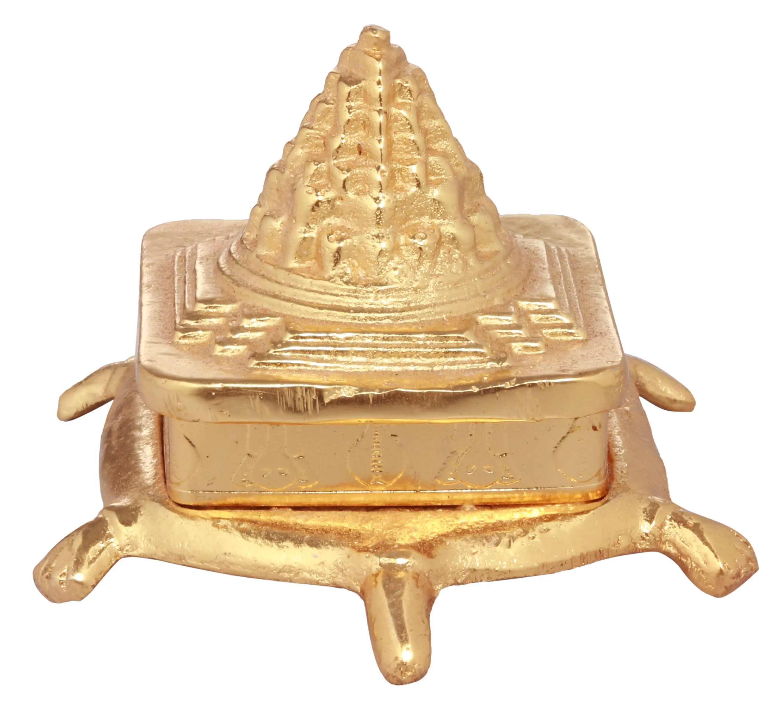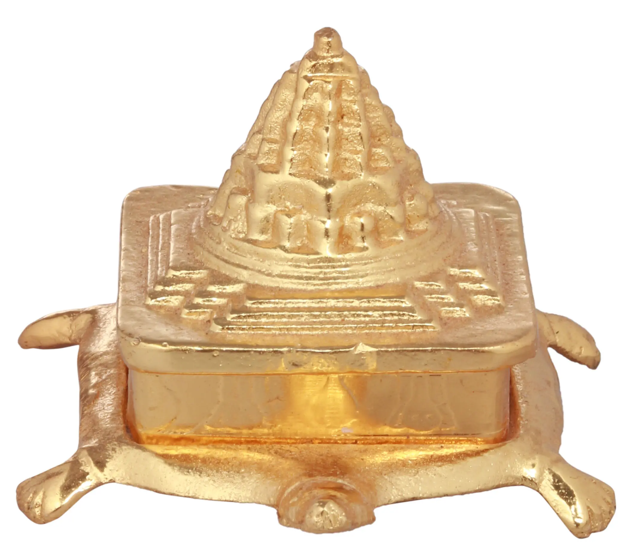 This stunning, sanctified multi-pyramid Brass Sri Yantra cast in The Mandala rises from the three squared bases to three circular bases to the Lotus Petals in various circles and the interlocked Triangles, rising to a peak of a mountain, atop which is placed a spherical stupa. The Yantra is positioned over the solid box cast on the squarely-plated back of the magnificent golden tortoise, out with his fine organs, extended handsome face, and tail. The proficiently handmade cheery golden shades of Shree yantra would fascinate the Inner peace, Prosperity, and Success of the worshiper.