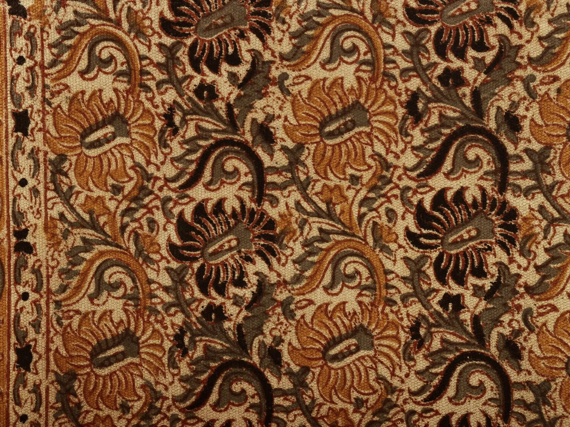 Introduce the charm of Telangana's artistic heritage to your space with our Sand Kalamkari Dhurrie. This handwoven masterpiece features intricate Kalamkari detailing in a warm sand hue, complemented by delicately printed floral vines. The fusion of traditional craftsmanship and contemporary design creates a rug that not only adds a touch of cultural richness but also serves as a testament to the enduring beauty of Indian textiles. Elevate your home with this unique piece, where every thread tells a story of skilled artistry.