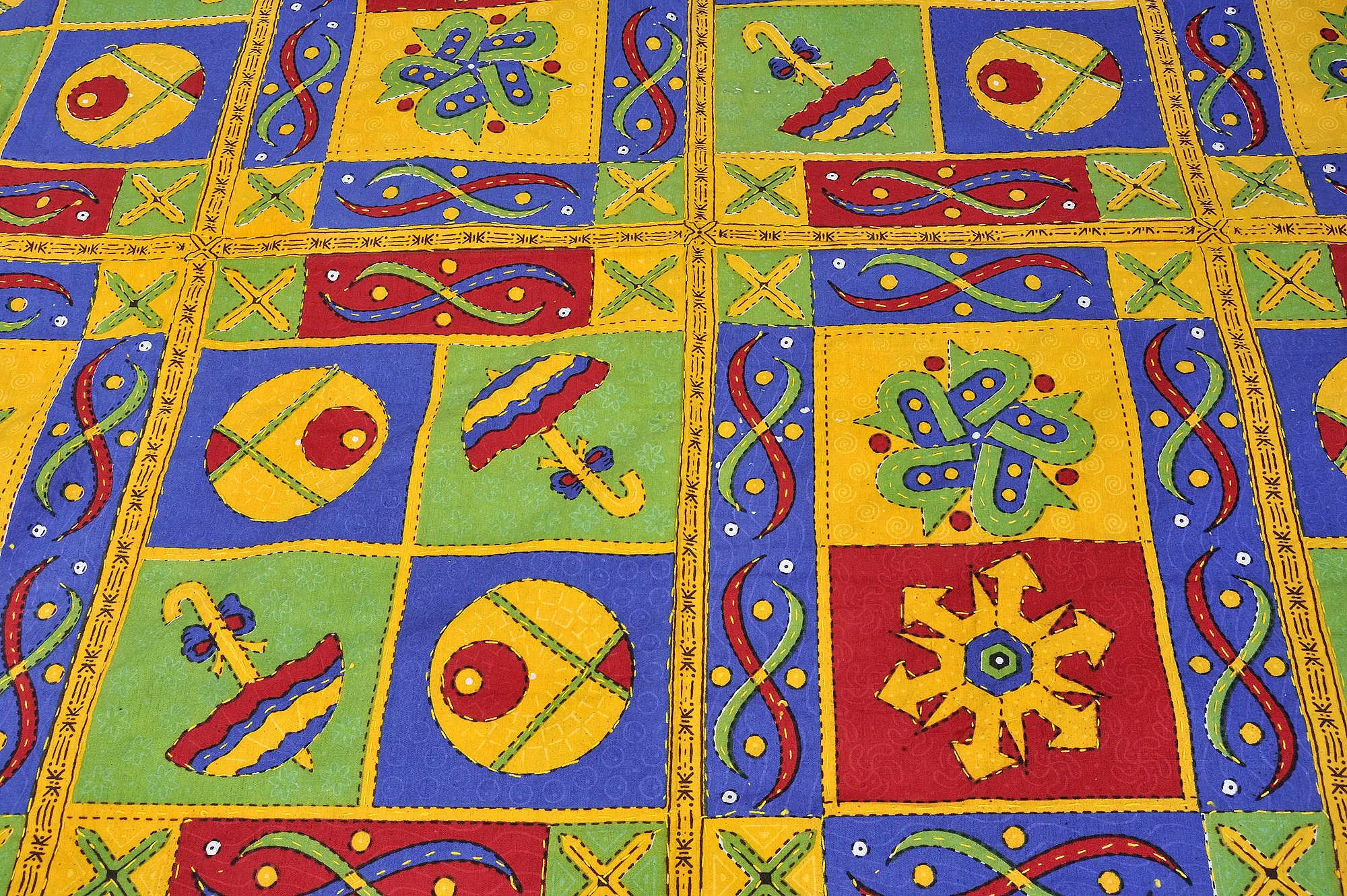 The Sanganeri Bedspread is a masterpiece of elegance and culture. This luxurious bedspread features the whimsy of printed umbrellas and the exquisite detail of Kantha stitch embroidery, transforming your bed into a canvas of opulence. Crafted to perfection, it combines art and comfort. Drift into a world of dreams and relish the soft embrace of this premium bedspread. Its uses are not limited to your bed; it doubles as an exquisite wall hanging. Experience the charm of tradition and the allure of luxury with this bedspread.