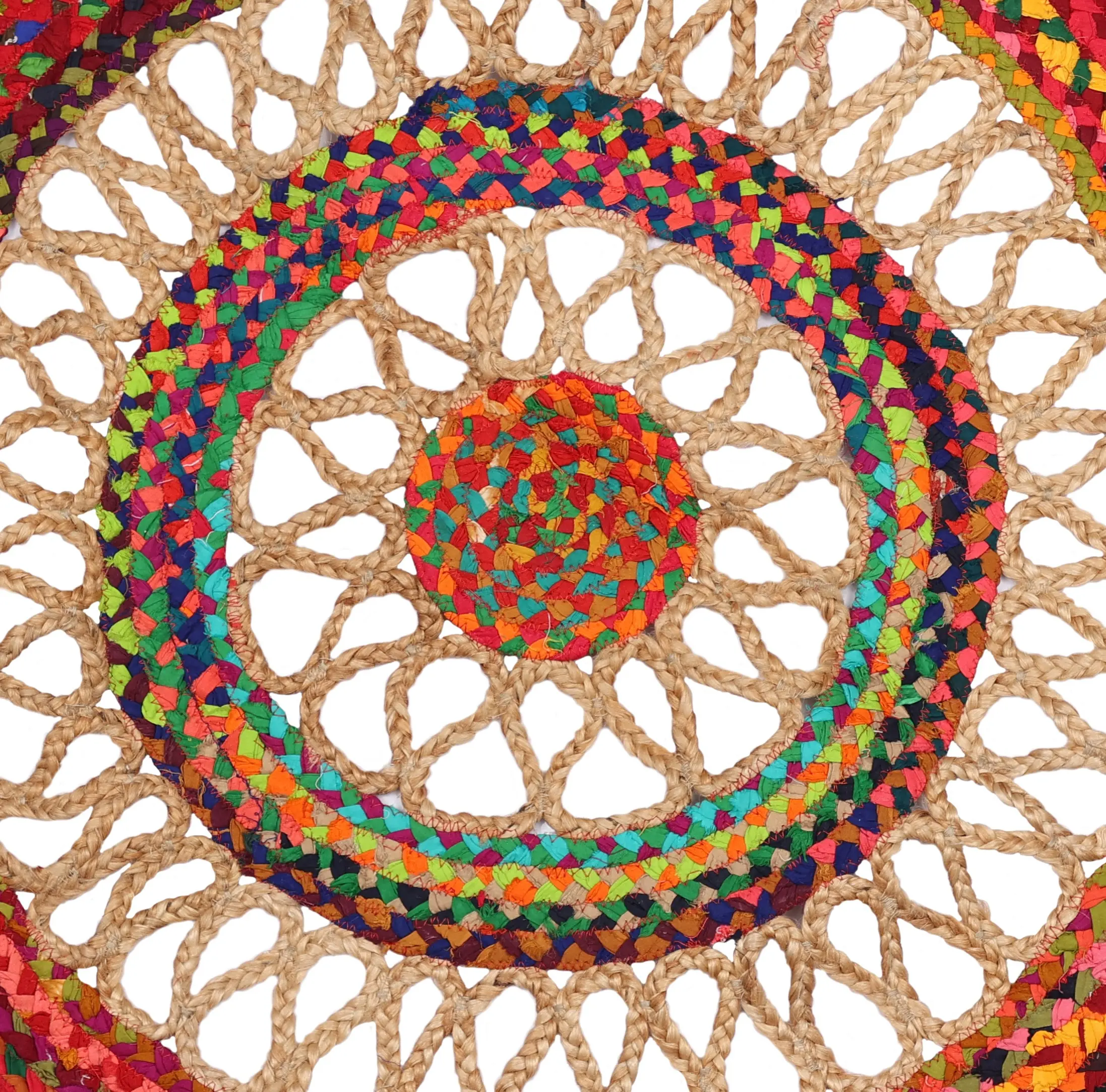 Infuse your living space with vibrant energy and a touch of bohemian flair with this unique, circular floor covering. The intricate design features a captivating blend of upcycled cotton and natural jute, creating a textural masterpiece that is as visually appealing as it is eco-conscious. The skillful handcrafting is evident in every detail, promising a durable and long-lasting addition to your home décor.
