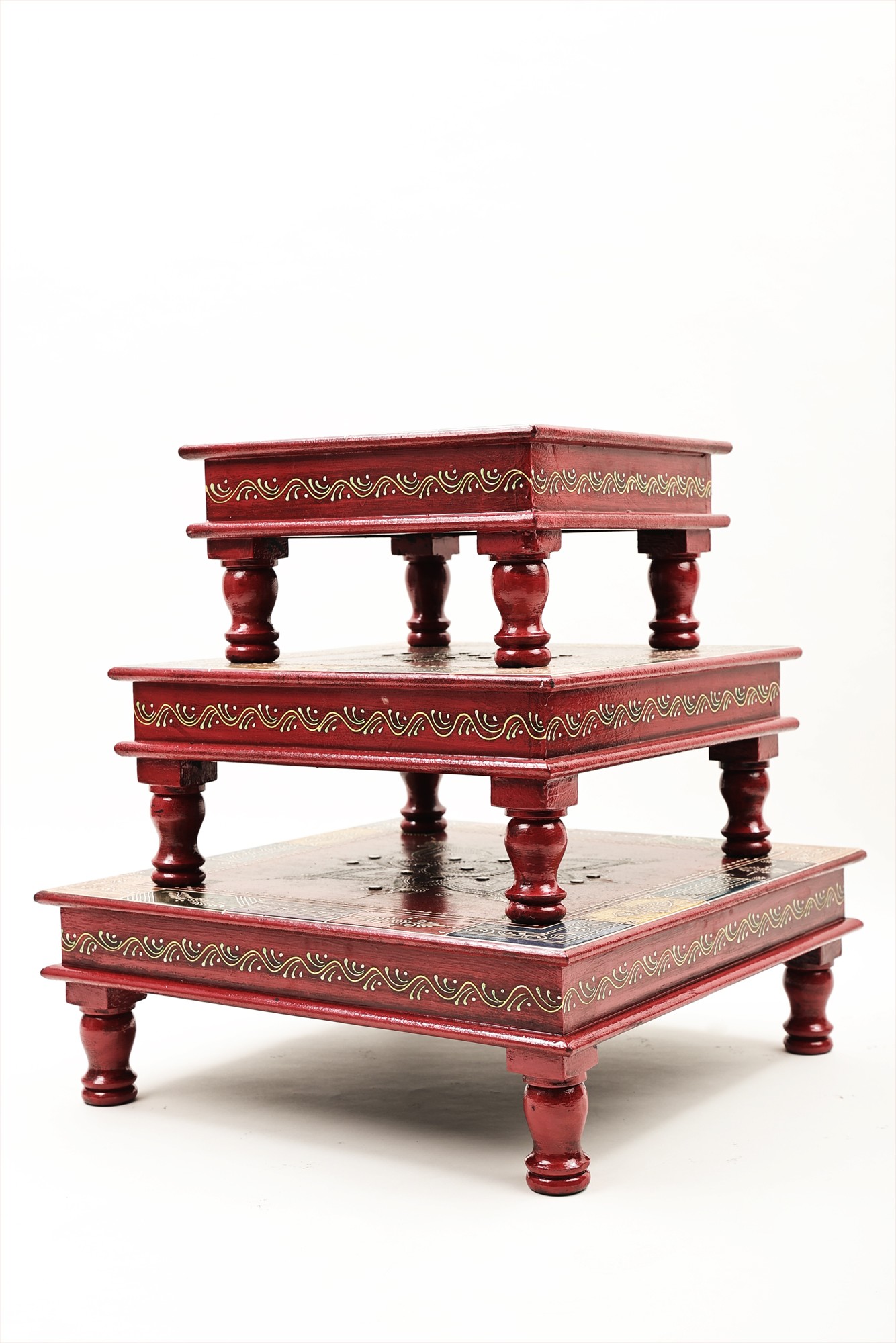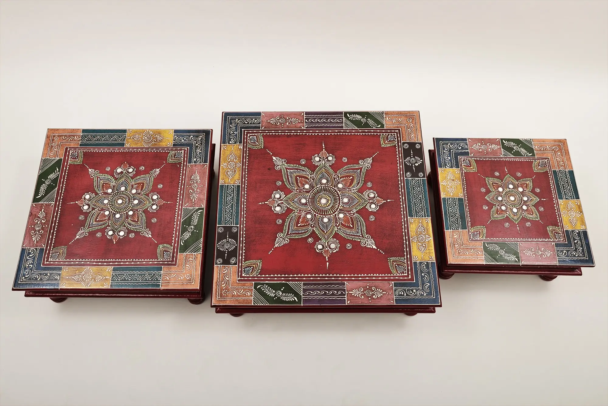 These versatile chowkis seamlessly adapt to various décor styles, from bohemian chic to eclectic modern. Use them to create a captivating focal point in your living room, bedroom, or even your outdoor space. The varying sizes allow for creative arrangements, whether stacked together for a layered effect or displayed separately throughout your home. Imagine placing a potted plant atop one, displaying a collection of candles on another, and using the third as a stand for your favorite books. Let your imagination run wild and discover endless possibilities with these delightful and functional art pieces. Transform ordinary spaces into extraordinary showcases of personal style with this set of artfully crafted chowkis.