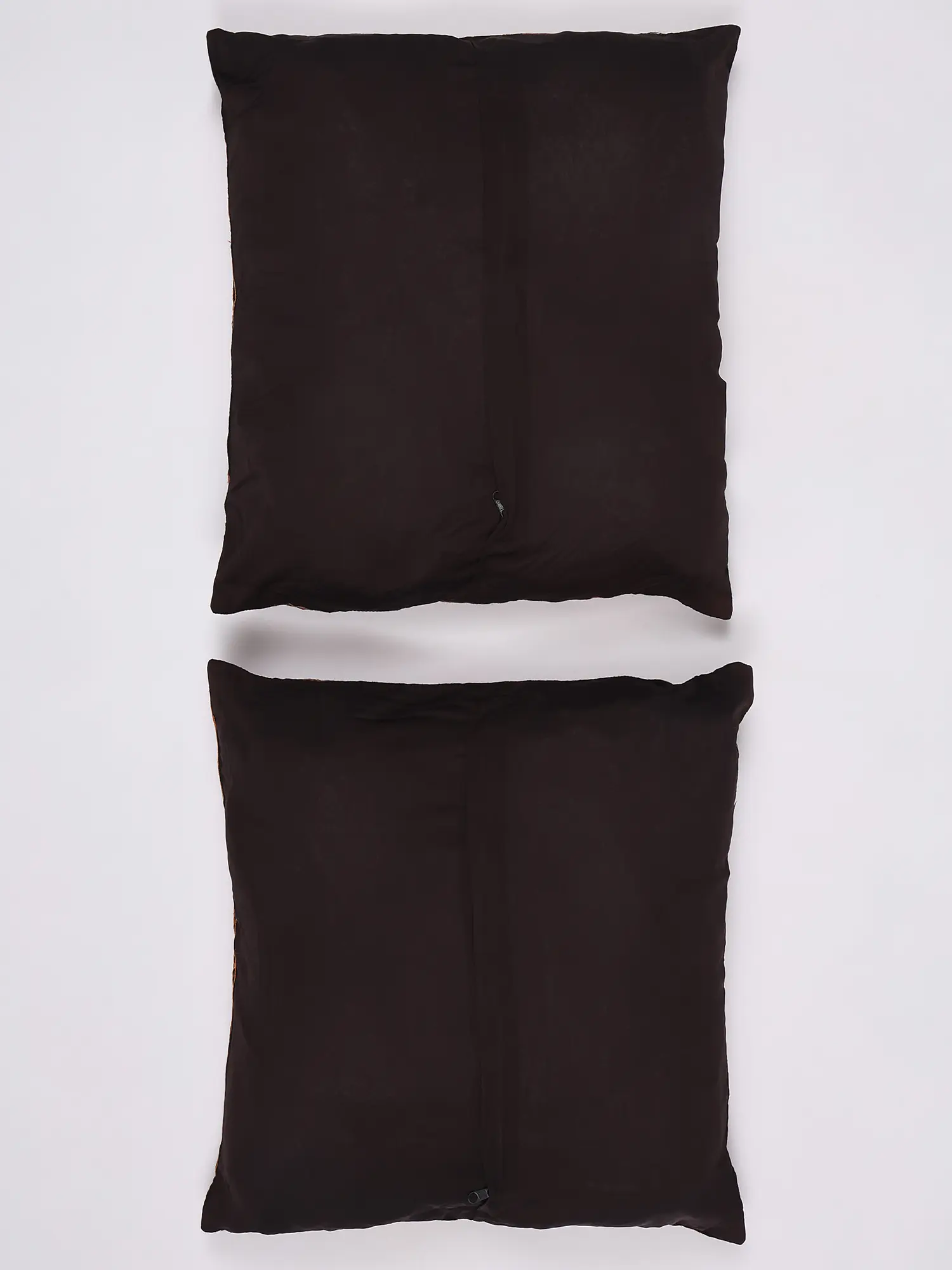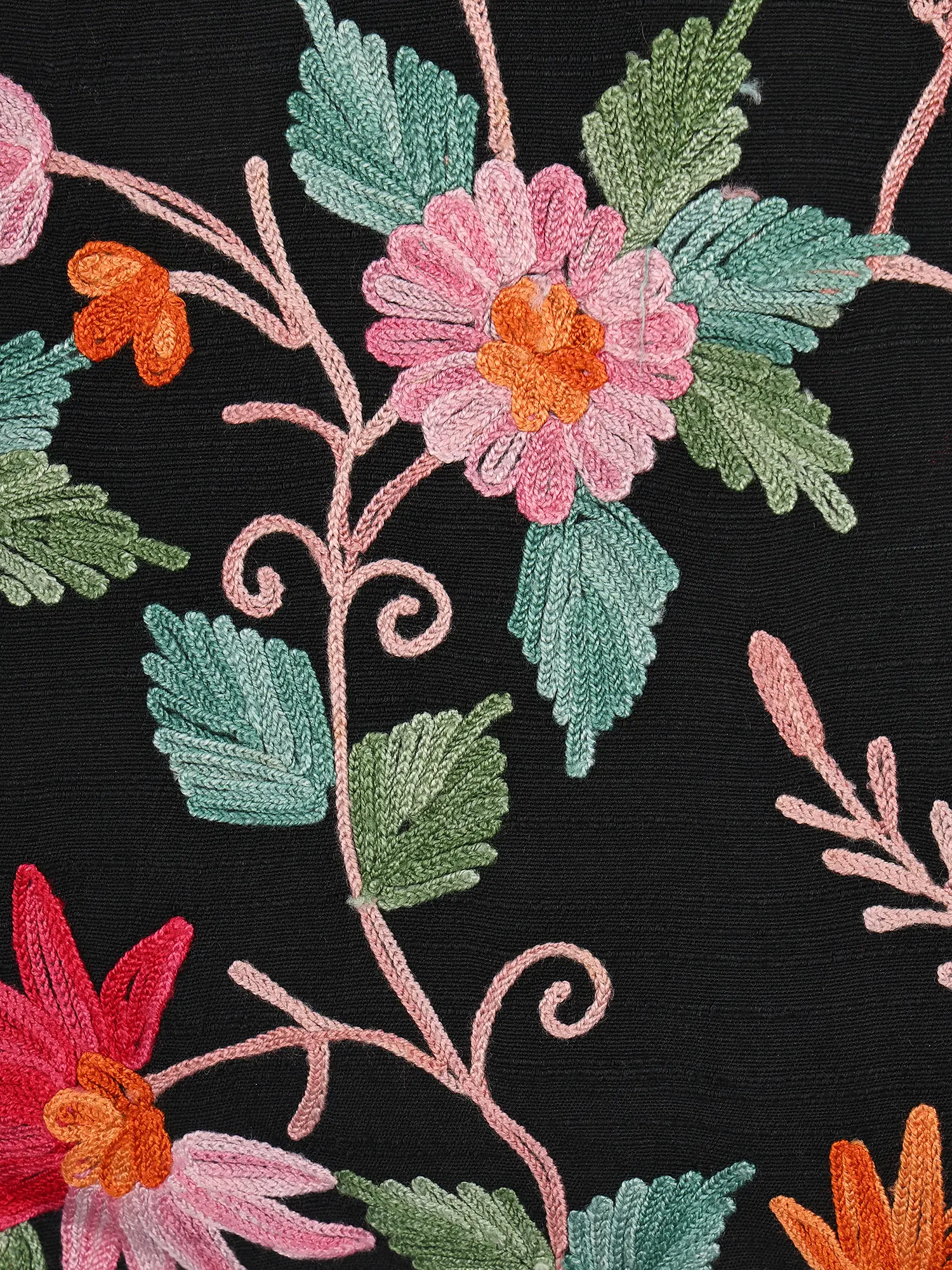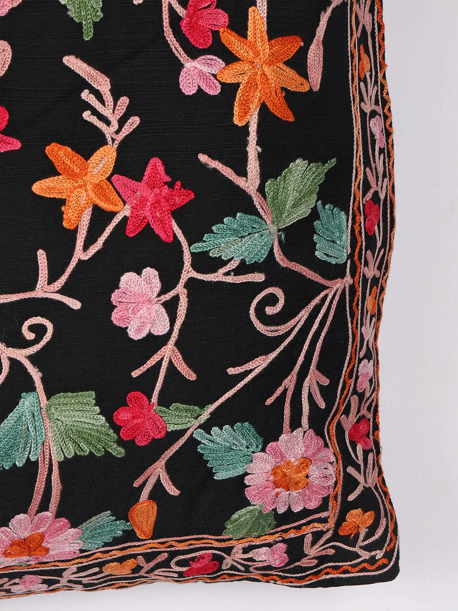 The art silk fabric offers a subtle sheen that beautifully complements the intricate floral embroidery. You'll appreciate the detailed rendering of blossoms and swirling vines in a palette of vivid hues, creating a captivating contrast against the deep black background. The generous 17-inch by 17-inch dimensions ensure they will grace any standard cushion, providing an immediate uplift to your décor.