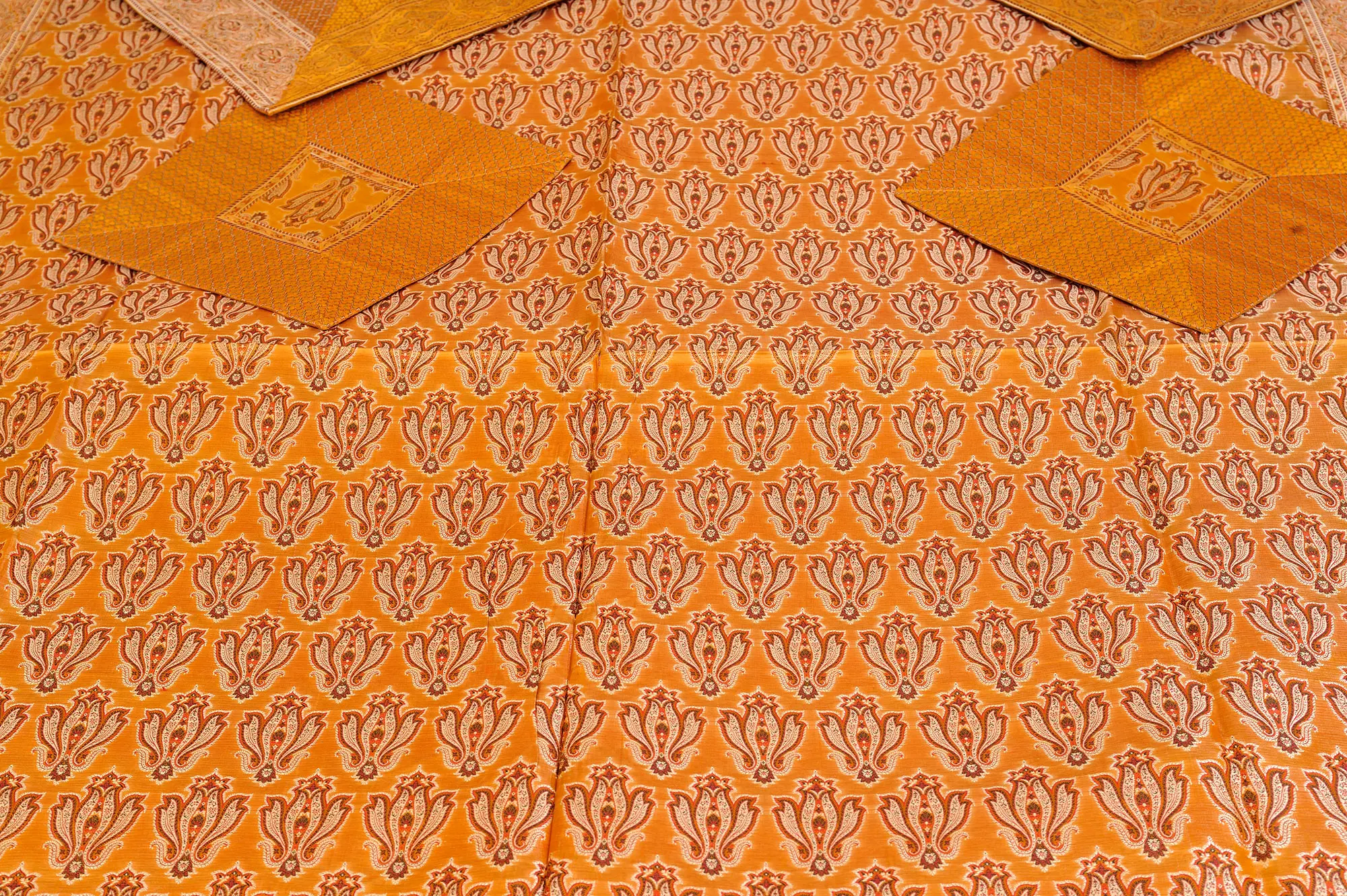 An inky Prussian blue or a resplendent natural gold, both colours suggest a bridal newness. The field is densely packed with embroidery, the skill and precision of which is best admired by zooming in on the same. The border comprises of multiple brocaded panels, which is a signature of Banarasi fashion. The bedspread comes with a set of pillowcases and two sets of cushion-cases of varying sizes, which you may use to furnish the couch. Dressing up your bedroom in this would ensure you get to retreat into luxury after a long, hard day.