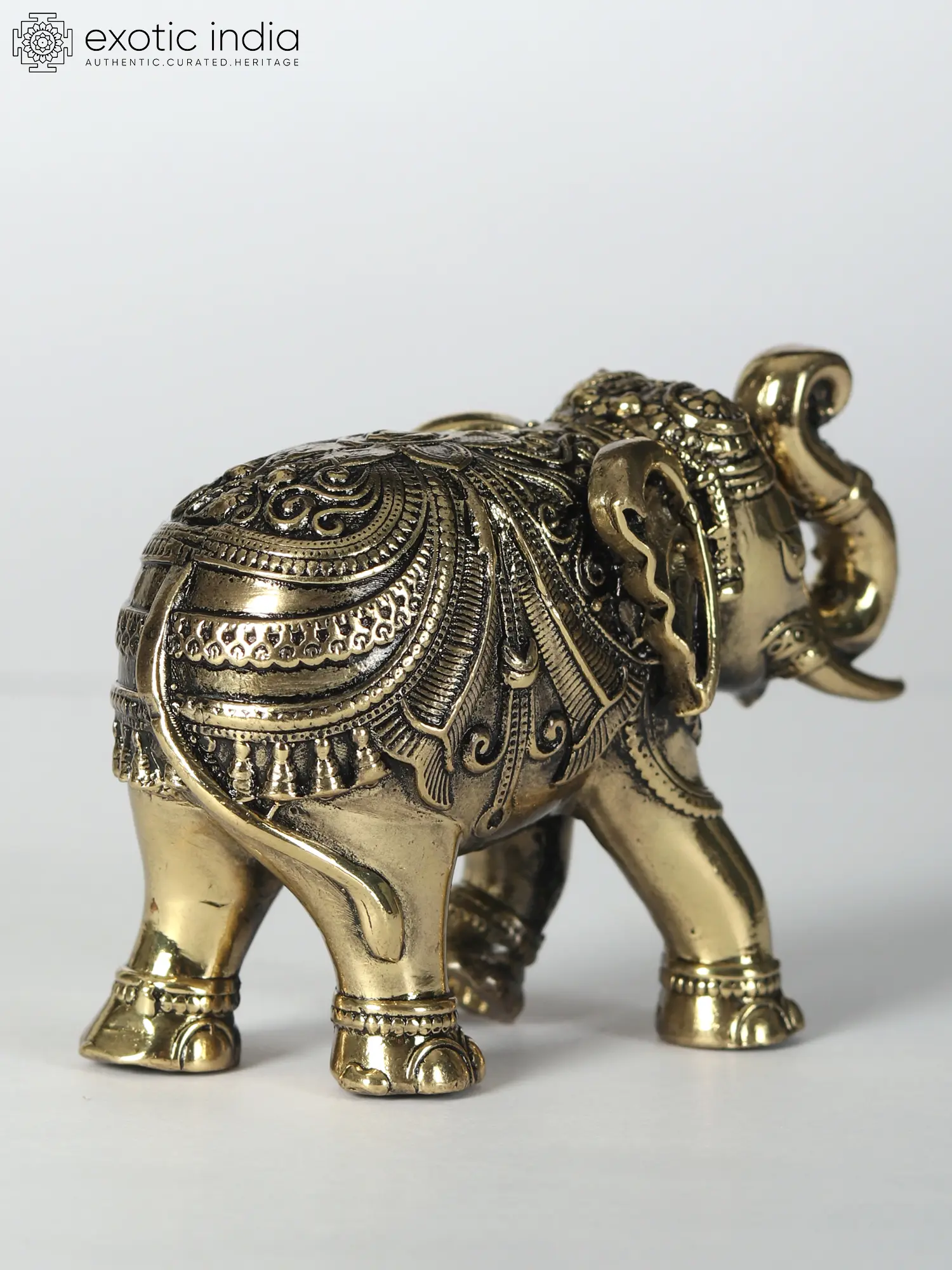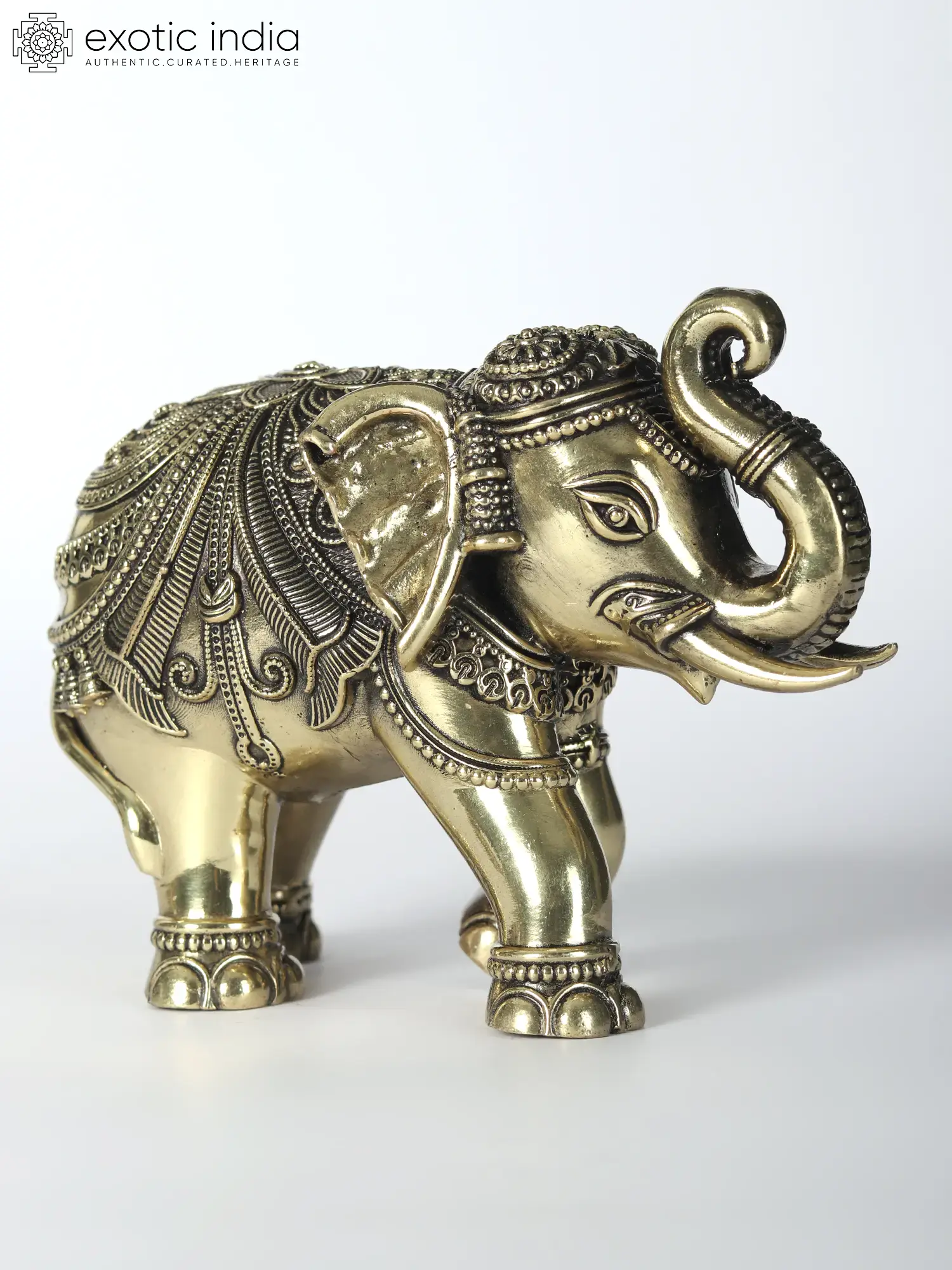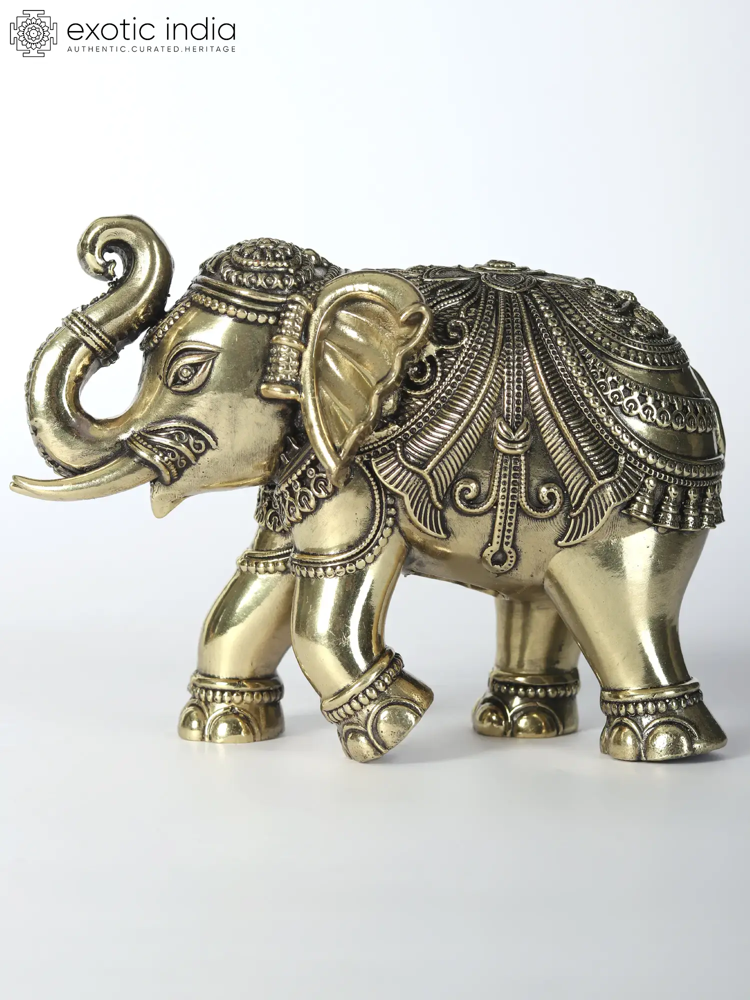 This brass statue of the decorative elephant symbolizes strength, power, and triumph. With its upraised trunk in a charging stance, it embodies a symbol of victory, resonating with historical and cultural contexts. Elephants, revered for their intelligence and resilience, represent overcoming obstacles.