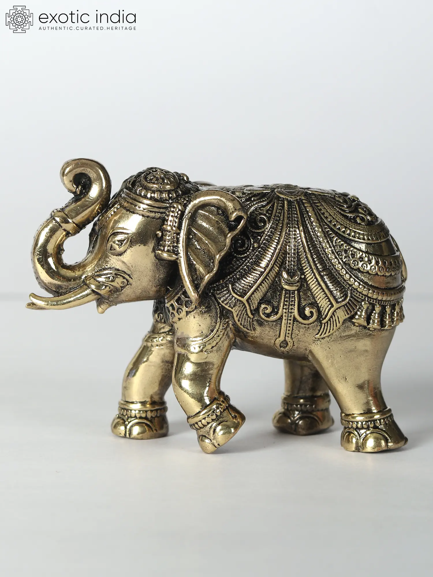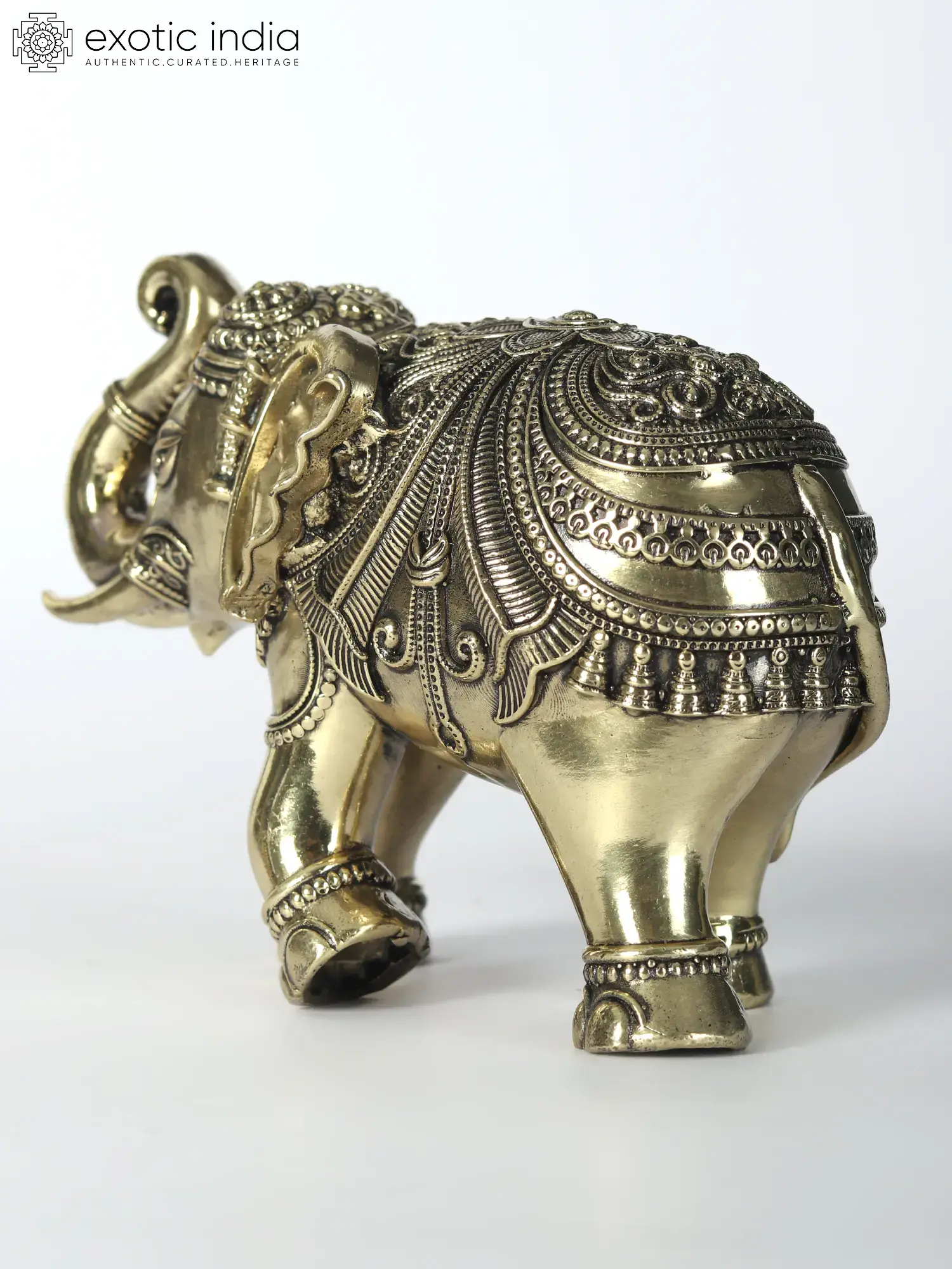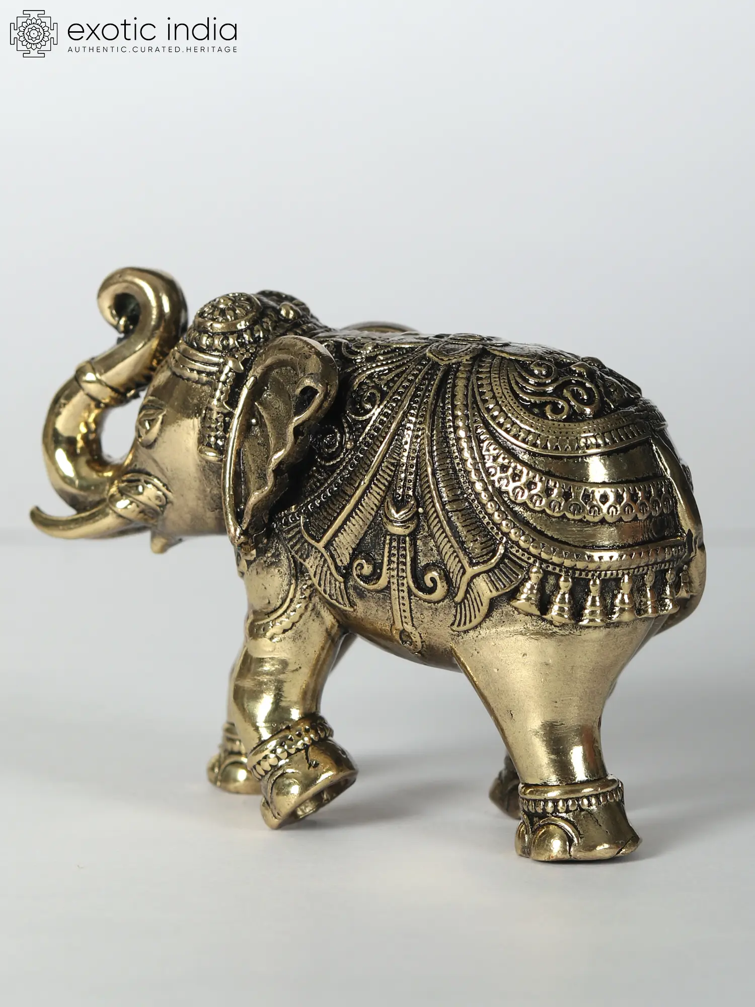 This brass statue of the decorative elephant symbolizes strength, power, and triumph. With its upraised trunk in a charging stance, it embodies a symbol of victory, resonating with historical and cultural contexts. Elephants, revered for their intelligence and resilience, represent overcoming obstacles.