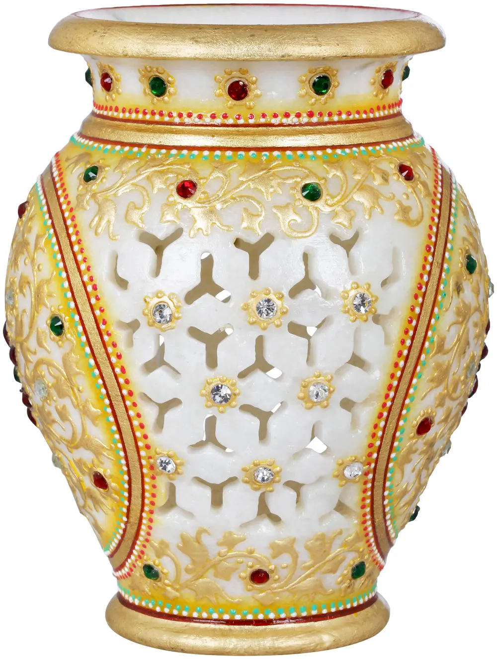 A vase is used as an ornamentation to accentuate the beauty corner of your house or office by placing flowers in it or by just keeping it as it is. The one we are offering is carved in the most unique patterns, having symmetric cuts on one side and decorated with gold and silver stone flower motifs all over in extreme elegance applauding the sculptor’s unmistaken skills. Have a look at the similar top and bottom thick floral borders of the centre bulging out part of the vase, designed in a three-dimensional look and colorful stones to highlight it. A similar style can be found just below the brim along with a painted combination of red, green and white dotted borders. Having such a piece as your interior décor is like adding another royal beauty to your handpicked collections, so grab before it runs out.