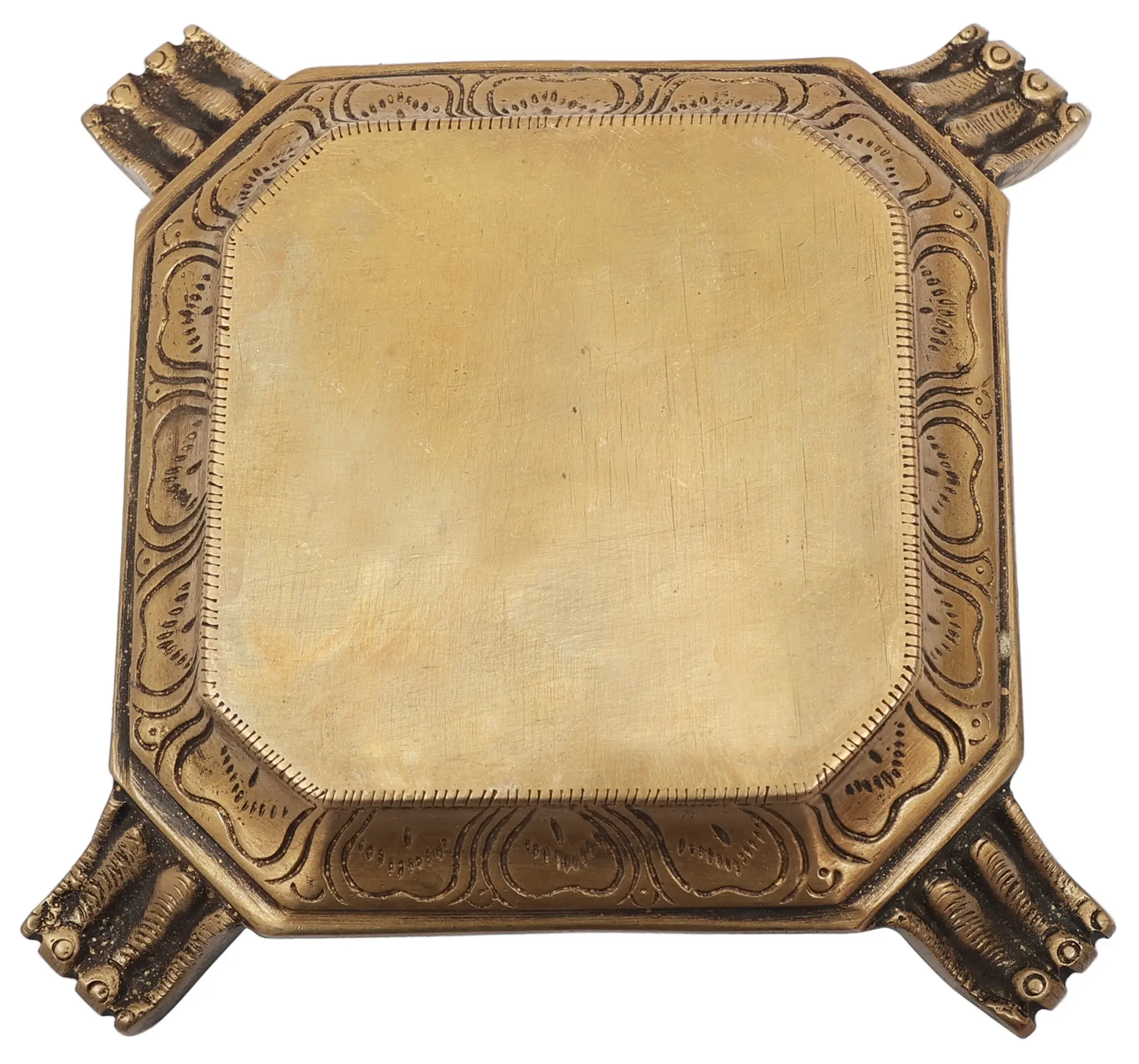 This piece is fashioned from durable brass, known for its enduring quality and captivating sheen. The surface offers a stable and level plane, while the sides feature a delicate, stylized pattern. Each detail is carefully executed, adding depth and visual interest. The elegantly designed legs provide both stability and a touch of artistic flair. They are intricately designed which elevates the overall aesthetic of this unique stand.