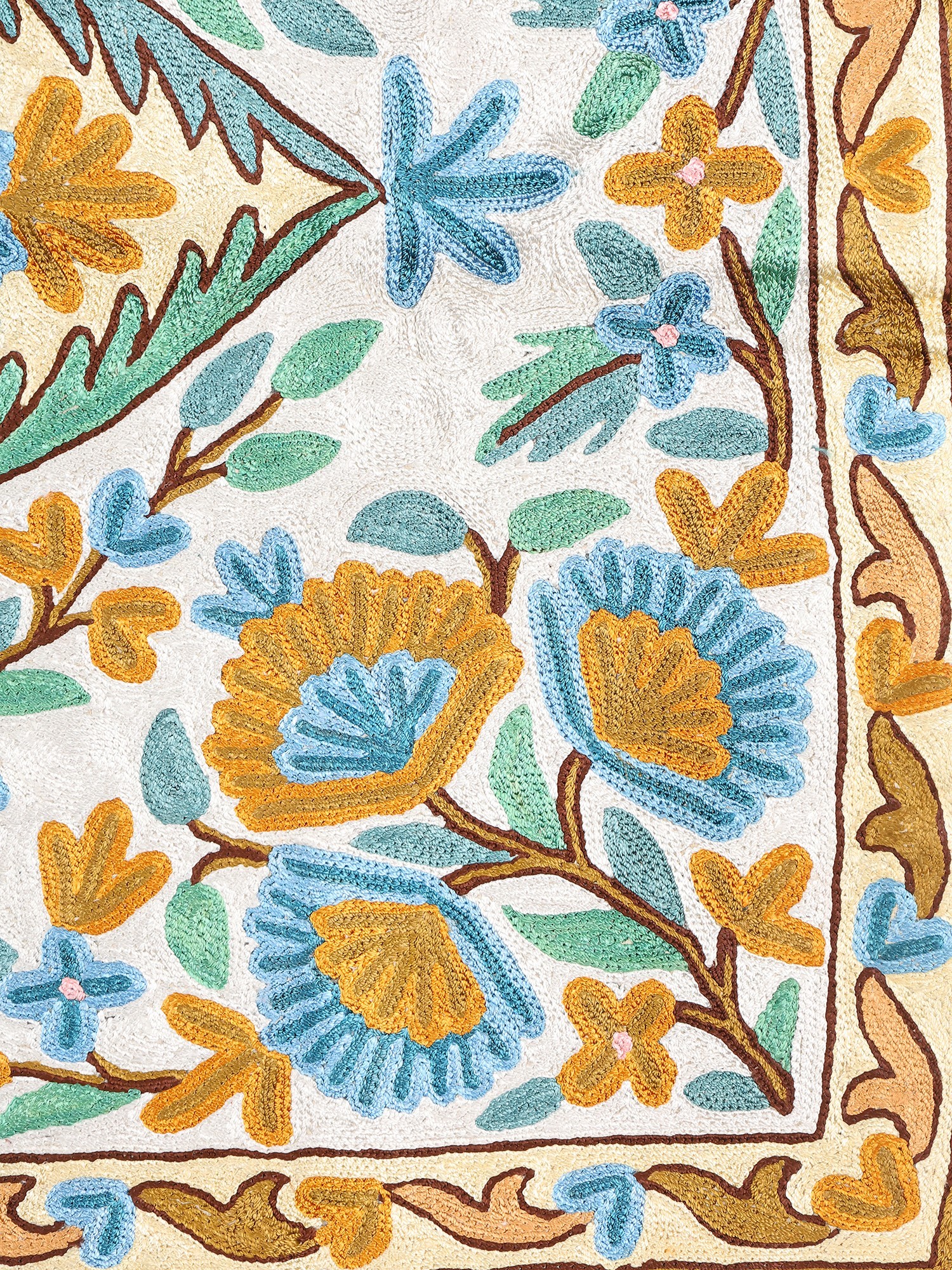 Cream and Blue Kashmiri Carpet with Floral Intricate Chain Stitched Aari Embroidery on All-Over