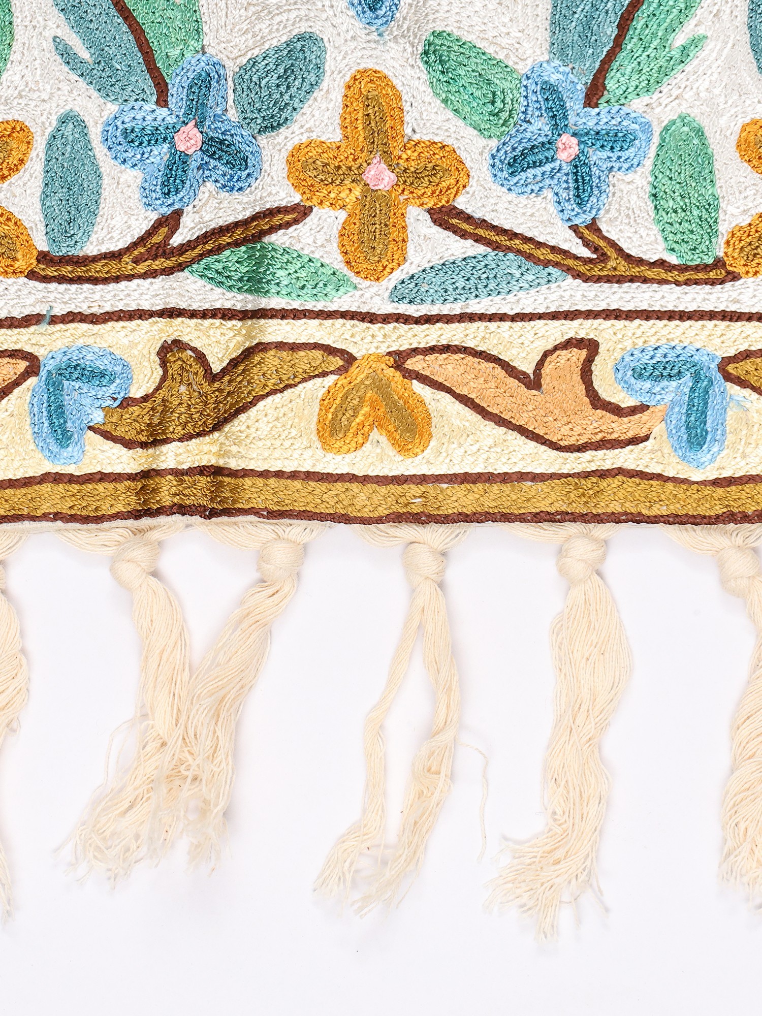 Tri-Color Floral Chain Stitched Aari Embroidered Carpet with Tassels from Kashmir