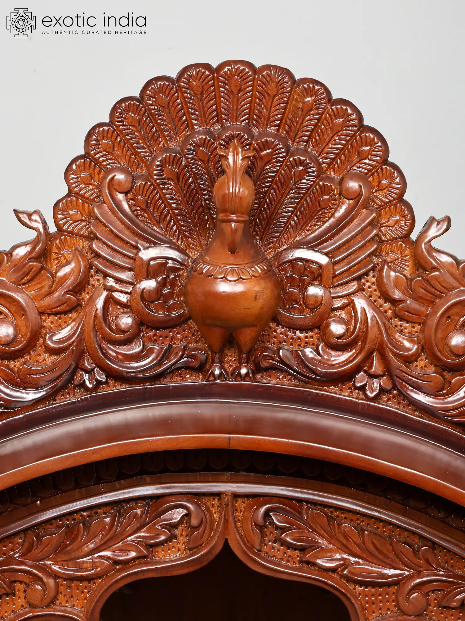 Standing at an impressive 43 inches in height, this piece offers a generous width of 30 inches and a depth of 17 inches, providing ample space for your deities and devotional items. The commanding presence is further enhanced by the breathtaking carvings that adorn its surfaces, from the majestic peacock at its apex to the finely detailed figures and floral motifs that surround its structure. You will discover a beautifully carved half-fan motif at the back, adding a focal point of serene beauty. Below, you'll find a convenient drawer, its facade adorned with ornate scrollwork, perfect for storing your puja essentials discreetly.