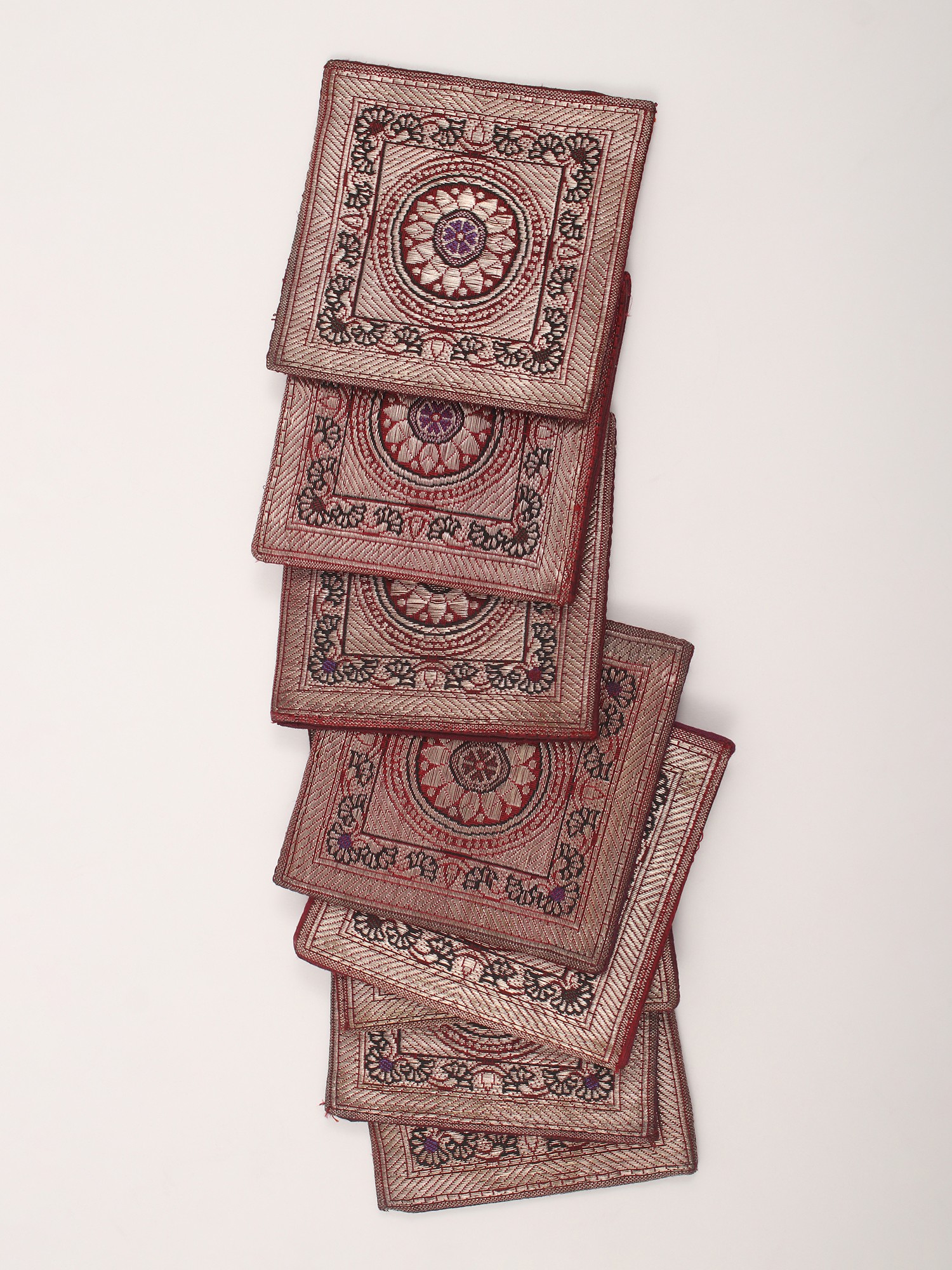 The choice of vibrant colors and meticulous detailing showcases the artistry inherent in the craft. Functionality meets aesthetics, as these coasters not only protect surfaces but also serve as beautiful pieces of traditional art. Perfect for adding a touch of Banarasi heritage to any table setting, these coasters are both practical and aesthetically pleasing.