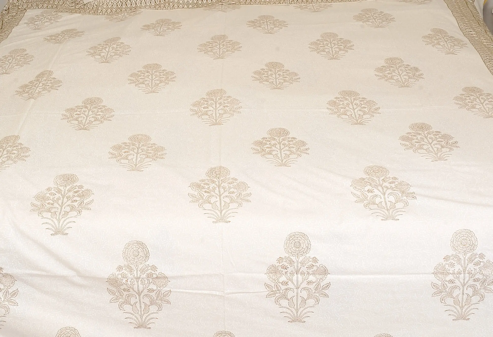 Snow-White Floral Pattern Gold Handblock Printed Cotton Queen Size Bedsheet With Two Pillow Cover