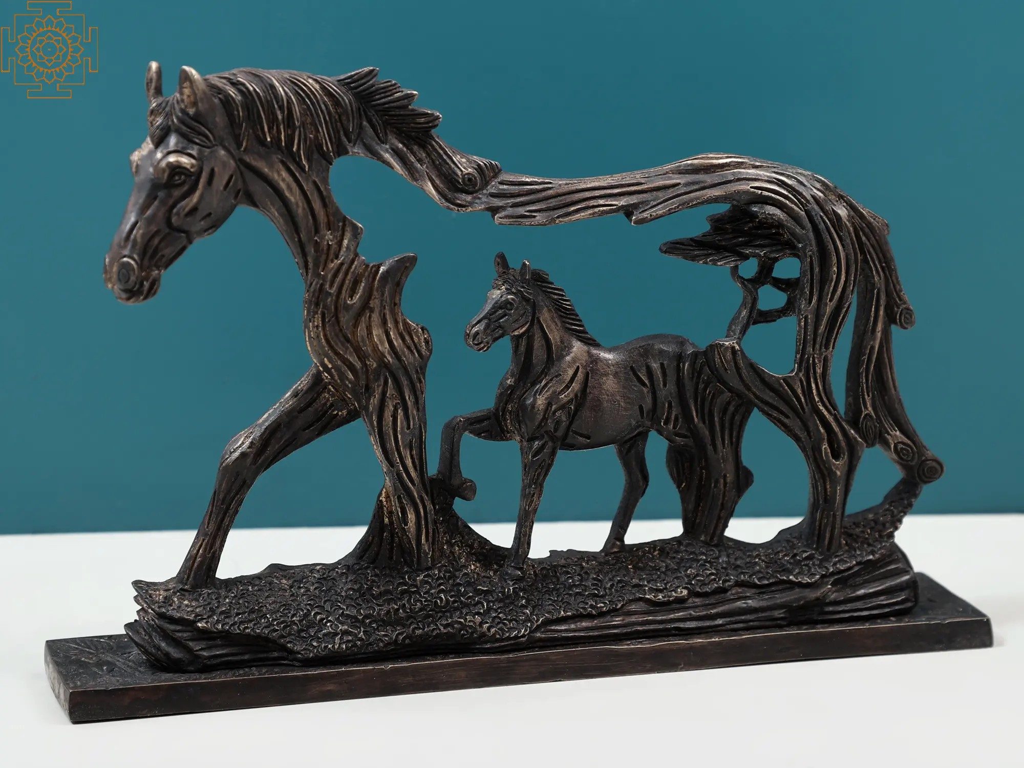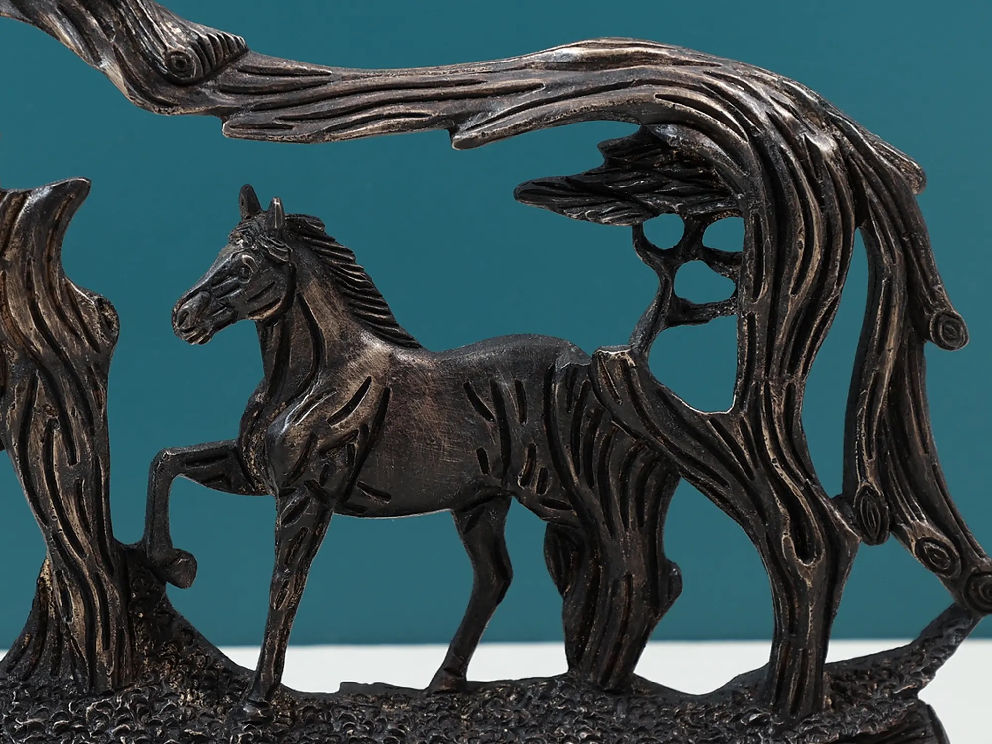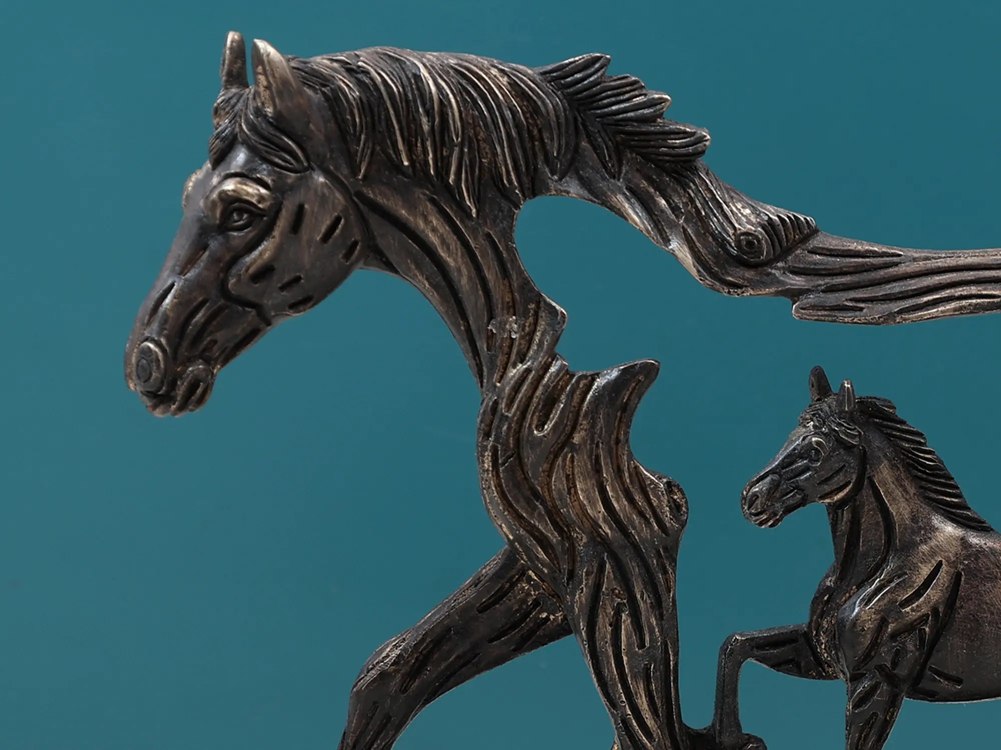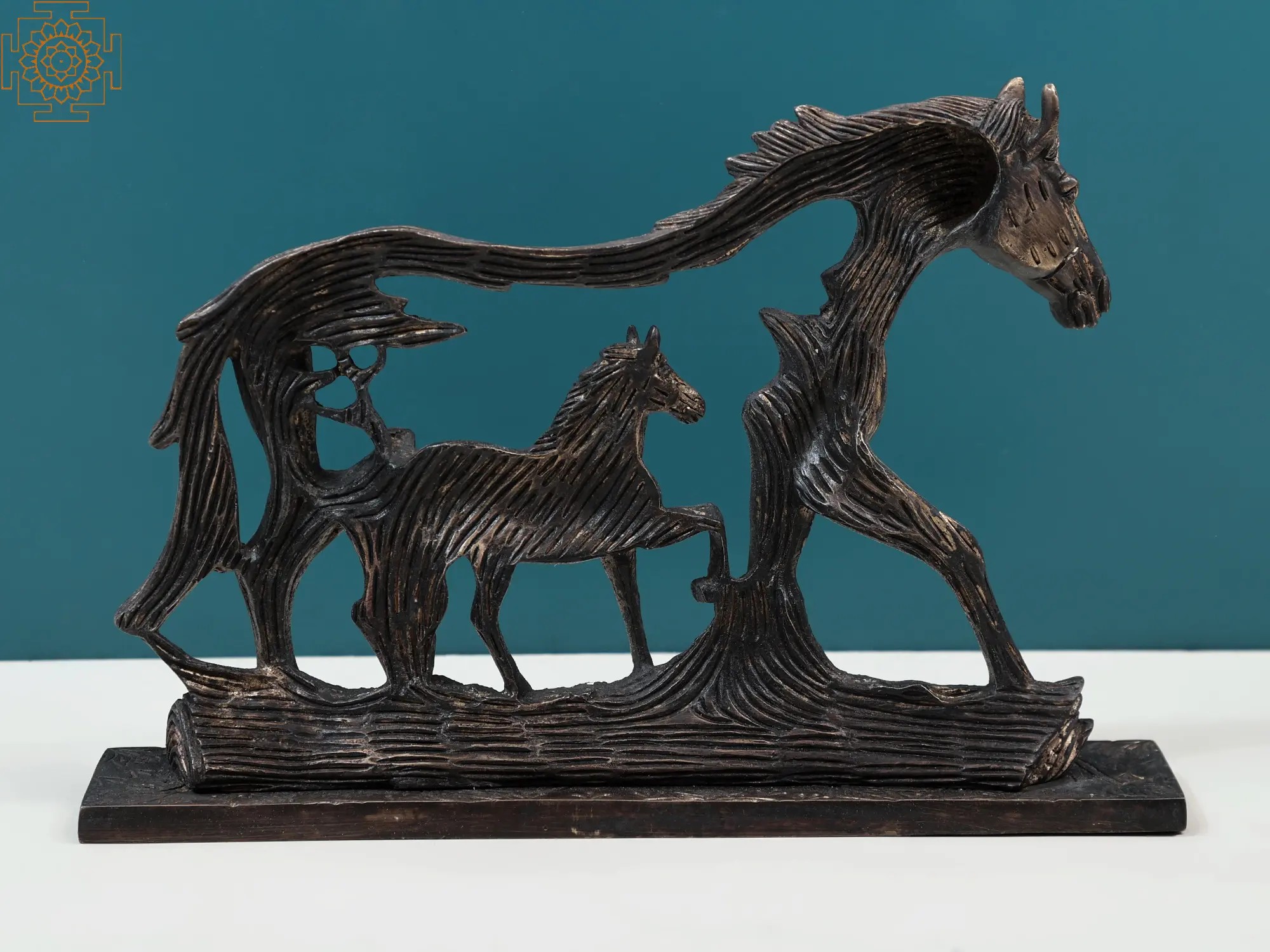 In many cultures, it is considered that a Horse carries the whole universe. This unique piece of brass shows a Horse under a Horse symbolizing the play of nature. The stylized depiction of a horse beneath another layer of equine imagery adds depth and intrigue to the visual narrative. If you look closely, the bigger horse is an extension of the natural elements and resembles the bark of a tree. It contains a horse, tree, and shrubs inside it, symbolizing the horse carries nature inside it. The smaller horse is the symbol of fauna.
