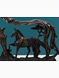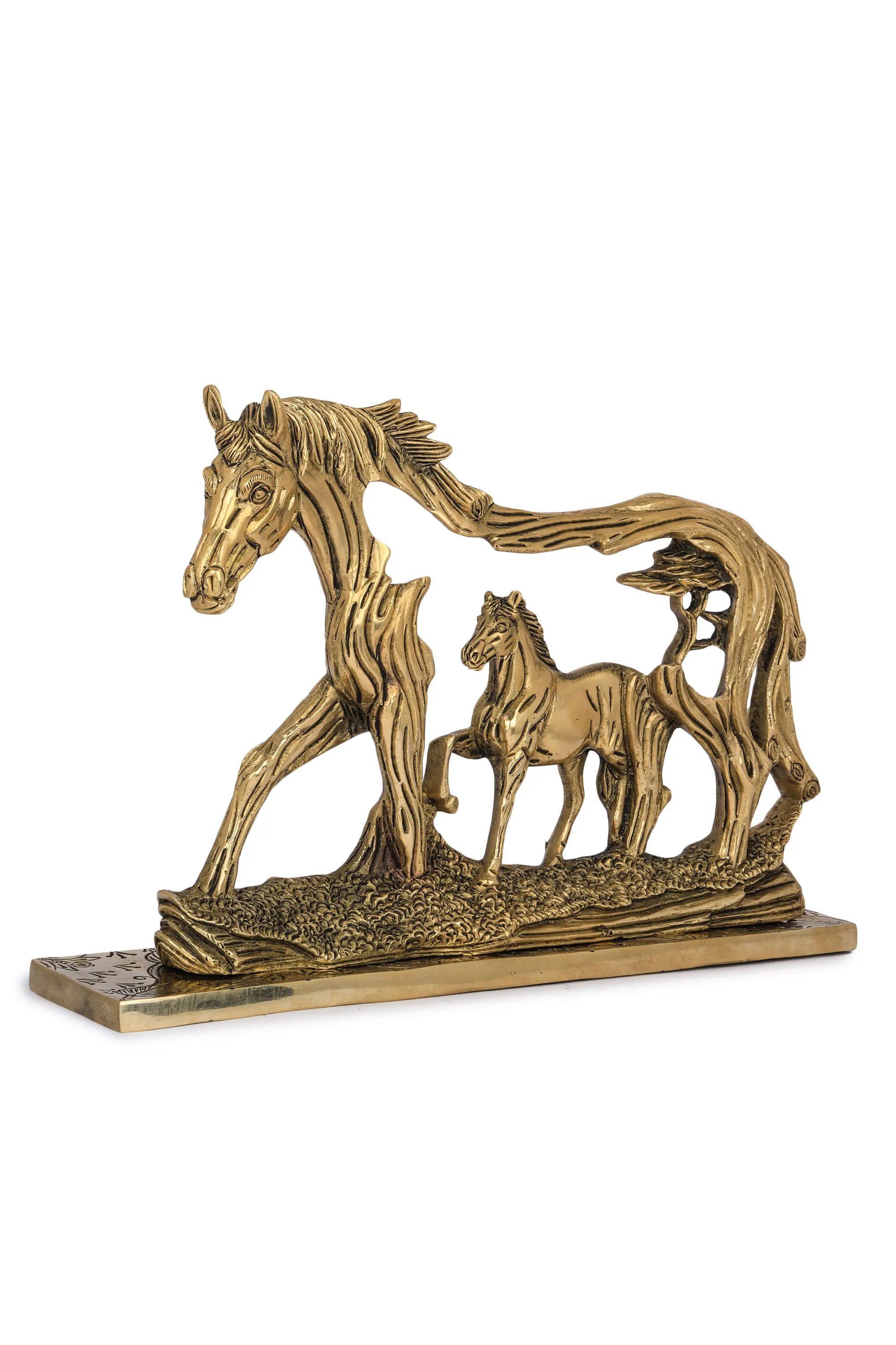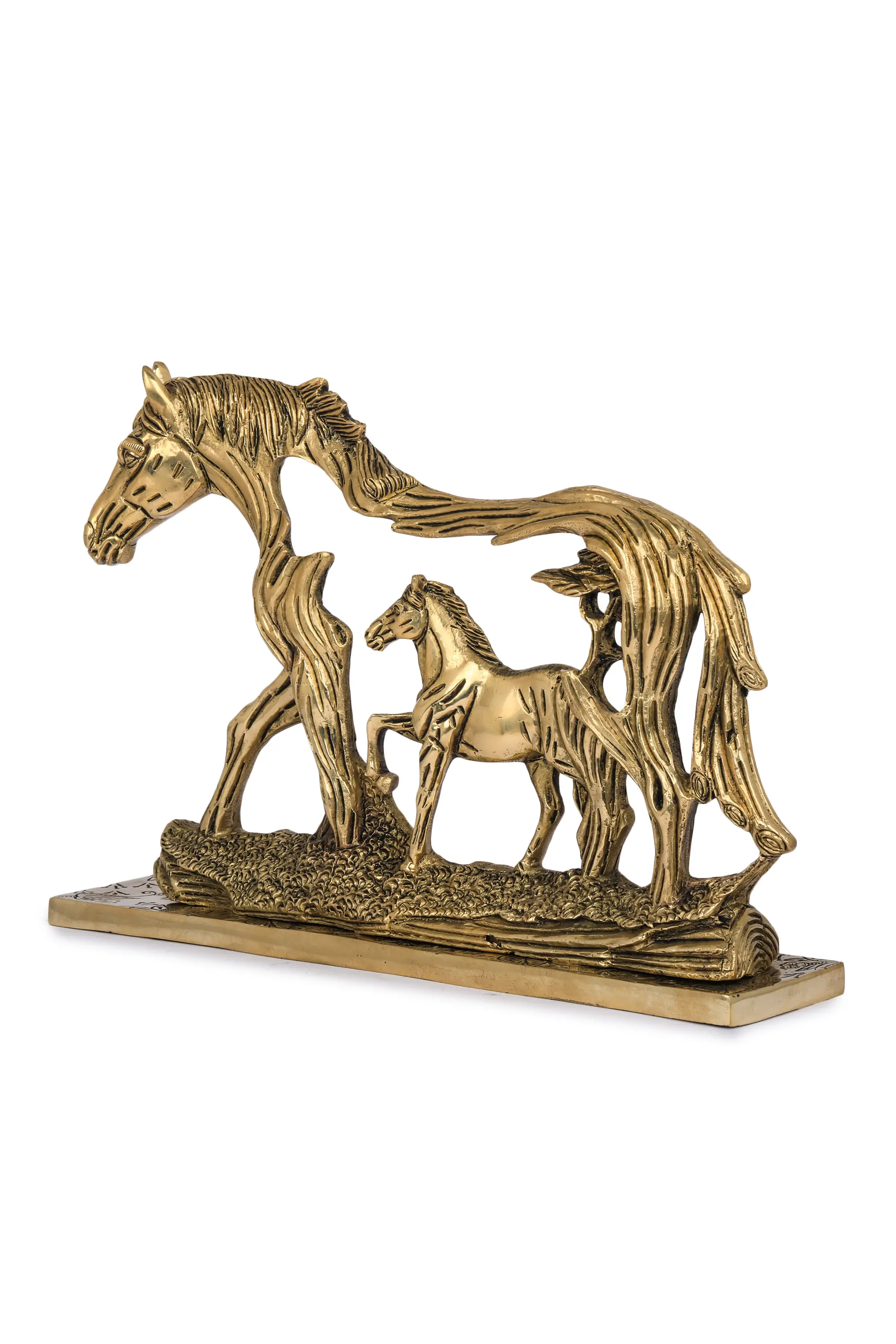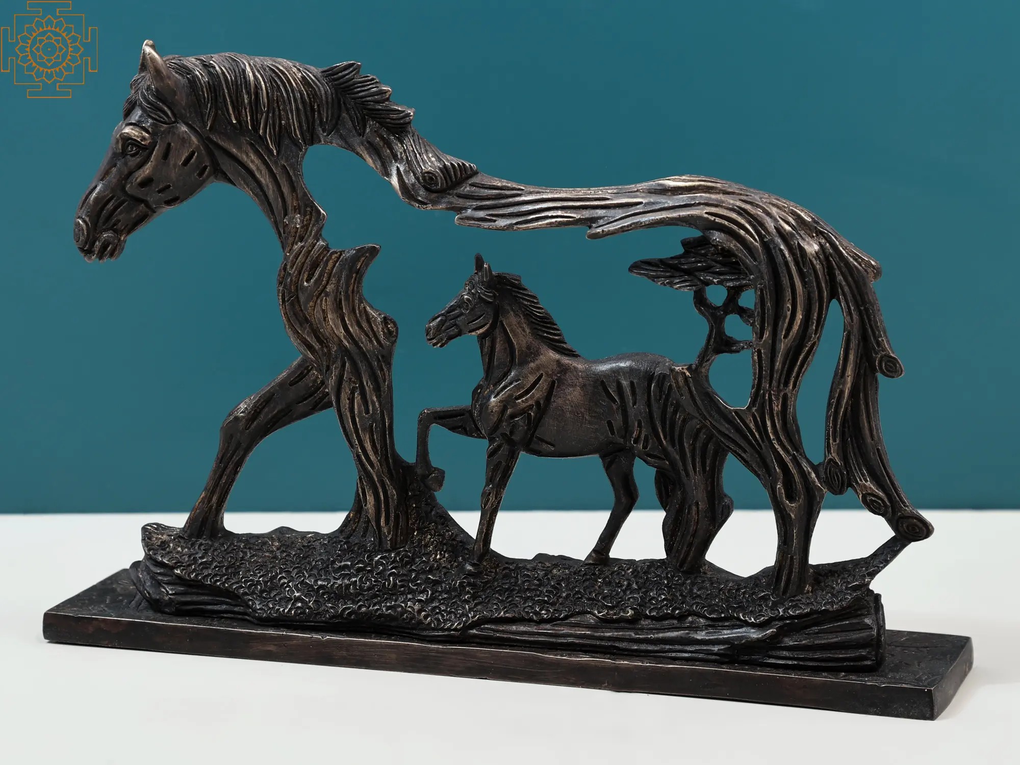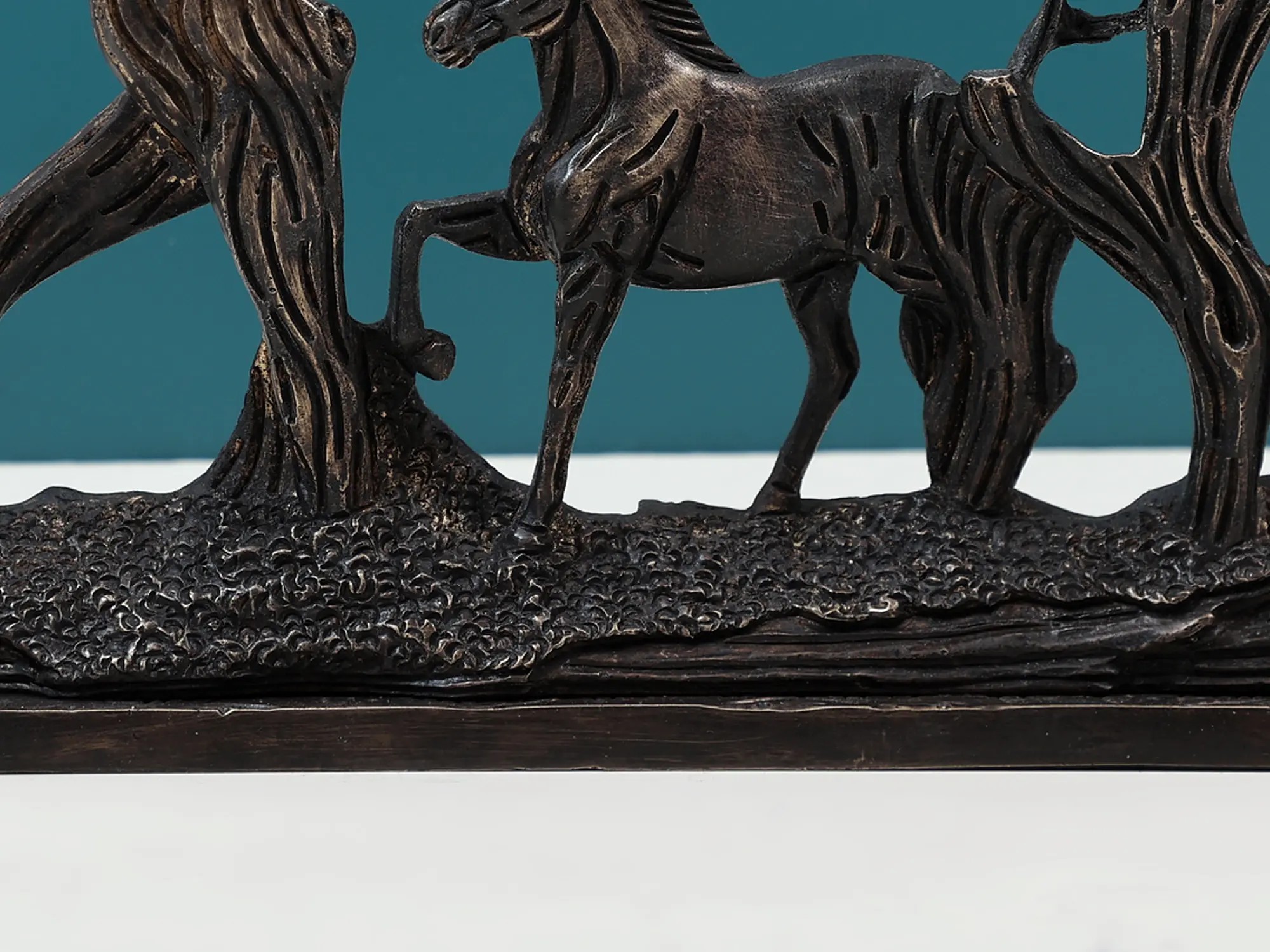 In many cultures, it is considered that a Horse carries the whole universe. This unique piece of brass shows a Horse under a Horse symbolizing the play of nature. The stylized depiction of a horse beneath another layer of equine imagery adds depth and intrigue to the visual narrative. If you look closely, the bigger horse is an extension of the natural elements and resembles the bark of a tree. It contains a horse, tree, and shrubs inside it, symbolizing the horse carries nature inside it. The smaller horse is the symbol of fauna.