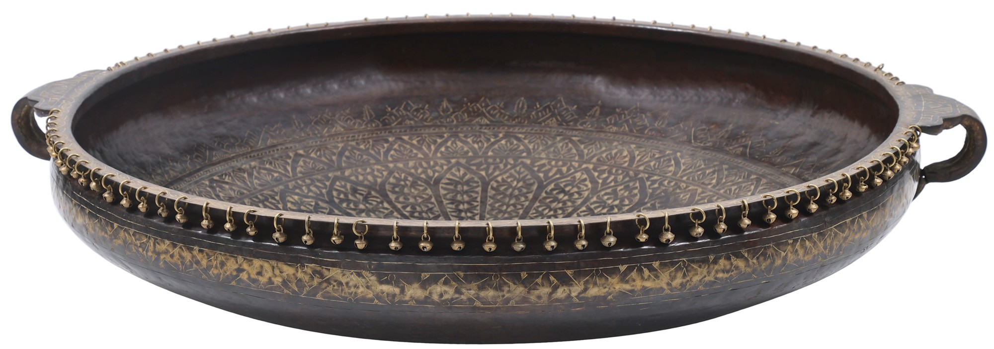Outer body is chiselled in a thin golden coloured border of beautiful patterns. As you look inside, you will be amazed by the extensive and précised carvings that contribute beautifully together to form a large flower in the centre along with its smaller version inside it. Note the aligned spiral formations in each petal, indicating the sculptor’s precision of skills and the laborious time taken to carve this masterpiece. The pattern of flowers etched along the two inner borders give an essence of completeness to the entire carving. Small-sized ghunghroos hung at the slightly extended hem add to the ethnic touch of this urli. You can decorate your large office halls or reception areas with this brass urli by filling it with water and having lotus petals floating over it or by decorating it with scented floating candles or both and keep it anywhere in the open space for a view to woo over.
