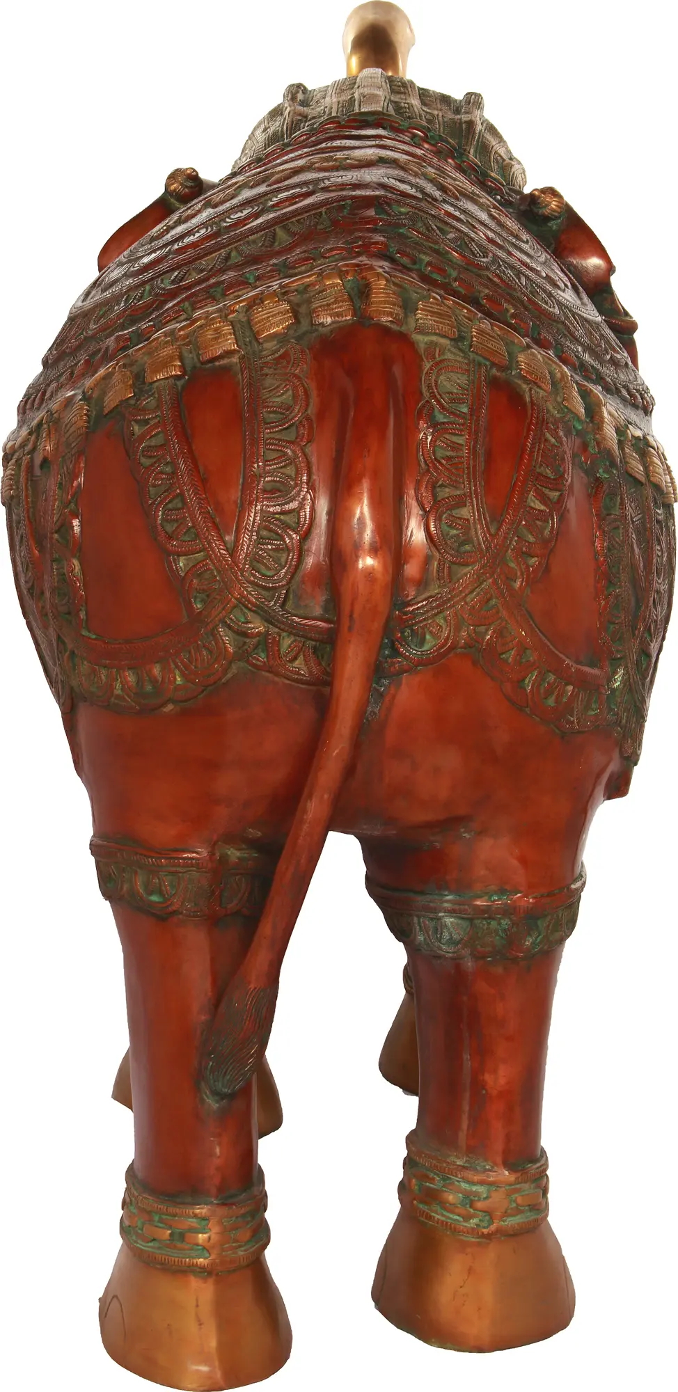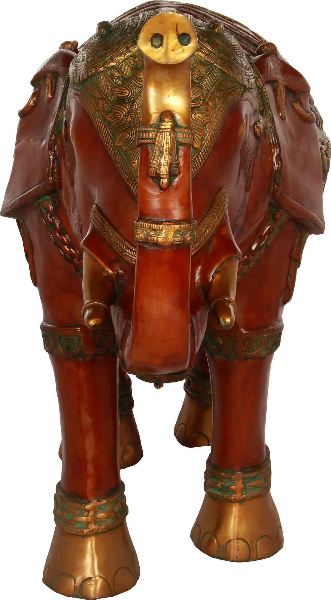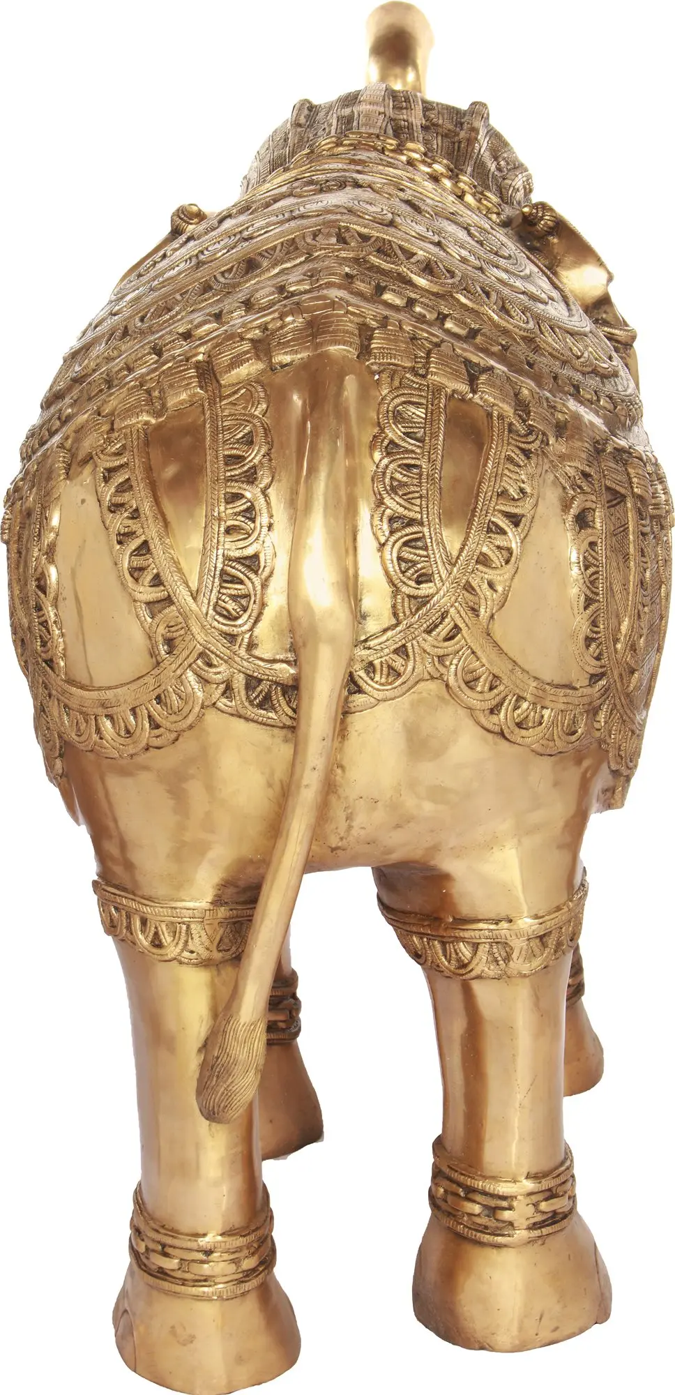 This statue of elephant has a beautifully carved back. It appears to be having an oval shaped wondrous looking carpet laid on its back. Marvelous circular embellishments are adding to its charm. It is wearing thick and phenomenal anklets in all four legs. A bell is hanging in the front. The two big floppy ears at the sides are shown as wearing a ring like structure. The trunk, which is raised upwards, is magnificently decorated with three bands, wrapped at a distance highlighting its uniqueness. Mouth of the elephant is open and it seems as if it is giving a smiling expression or enjoying its beauty by singing a sweet song. The carvings cover the forehead in a neat triangular pattern. The small tail at the back is slightly tilted towards the left leg. Two teeth peeping out from sides are very valuable. Many ornaments and decorative items are made from them.