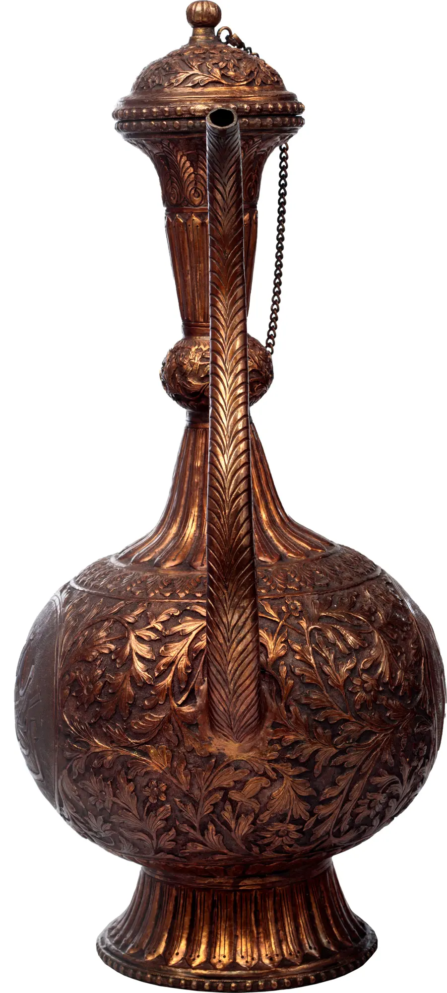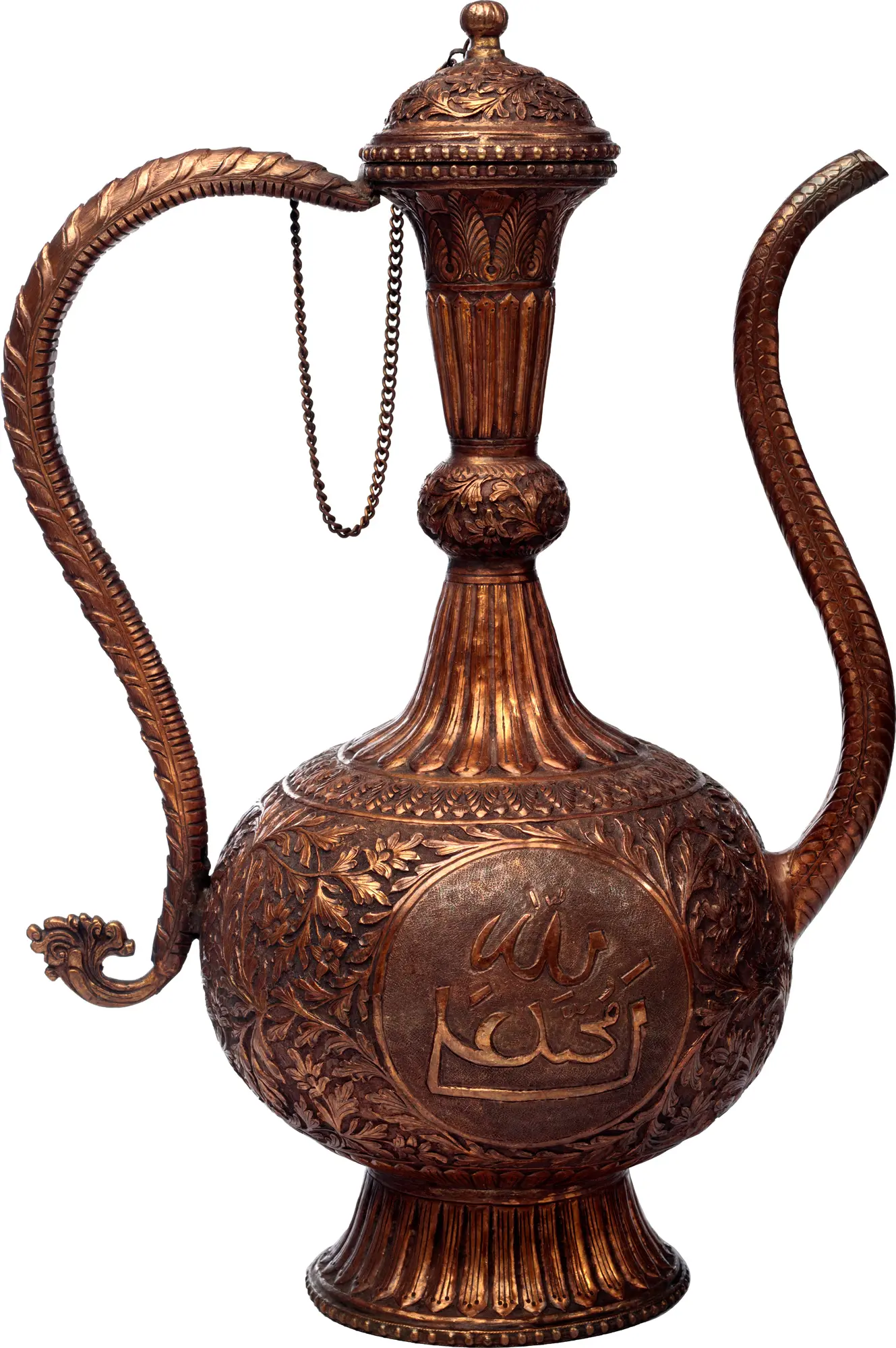 The surface of this exceptional piece is a canvas of breathtaking detail. Delicately etched floral motifs cascade across its rounded body, interweaving to create a mesmerizing tapestry of organic beauty. The raised elements catch the light, accentuating the depth and dimension of the design. The meticulous attention to detail is further exemplified by the graceful curves of its spout and handle, their surfaces adorned with a unique texture that provides a tactile delight. A medallion featuring exquisite Islamic calligraphy adds a layer of profound meaning and cultural significance to this already remarkable work of art. Each carefully sculpted element tells a story, whispering tales of tradition and artistic dedication.