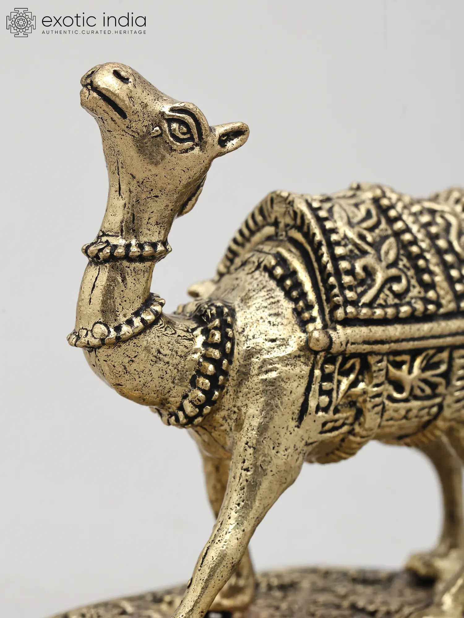 The camel stands upon a circular base that is as much a work of art as the creature it supports. The base is adorned with a repeating floral pattern, bordered by a decorative rim that incorporates finely detailed elements, possibly inspired by traditional Indian architectural friezes or textile designs. This elaborate foundation not only provides stability but also elevates the entire piece, giving it a sense of importance and presence. The overall design of the base complements the camel, creating a harmonious and visually appealing composition that draws the eye and invites closer admiration.
