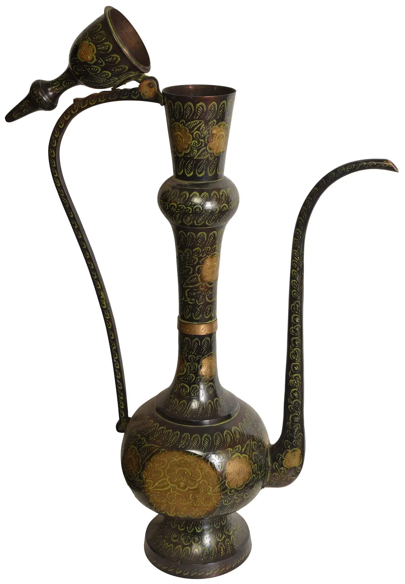 Carefully sculpted from brass, this artwork showcases the artisan's mastery. The smooth curves, the slender spout, and the thoughtfully placed handle all contribute to its striking form. The detailed floral patterns, rendered in contrasting tones, add layers of depth and visual intrigue. Each delicate swirl and petal is a testament to the meticulous attention given to every aspect of its design. The juxtaposition of the dark foundation with the lighter, floral accents creates a captivating visual harmony that is both elegant and eye-catching.