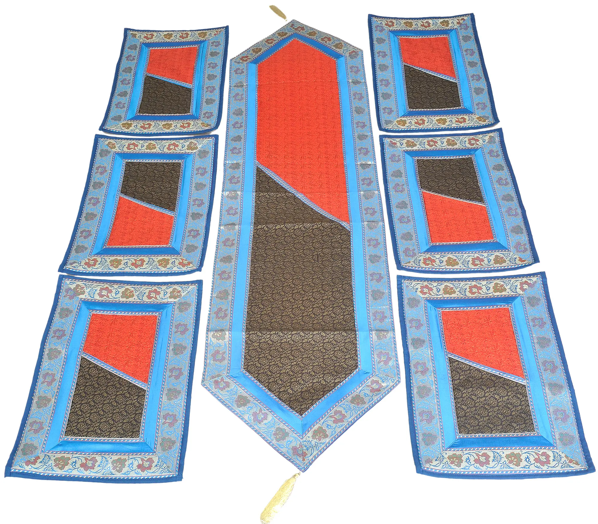 Elevate your dining experience with the Swedish-Blue Seven Piece Brocaded Dining Table Runner Set from Banaras. Each piece tells a story of intricate brocade weaving, reflecting Banaras' rich textile tradition. The serene blue hue adds a touch of sophistication to your table setting, while the brocaded design exudes timeless elegance. Let the set of table runners and mats be the centerpiece of your gatherings, where every meal is a celebration of refinement.