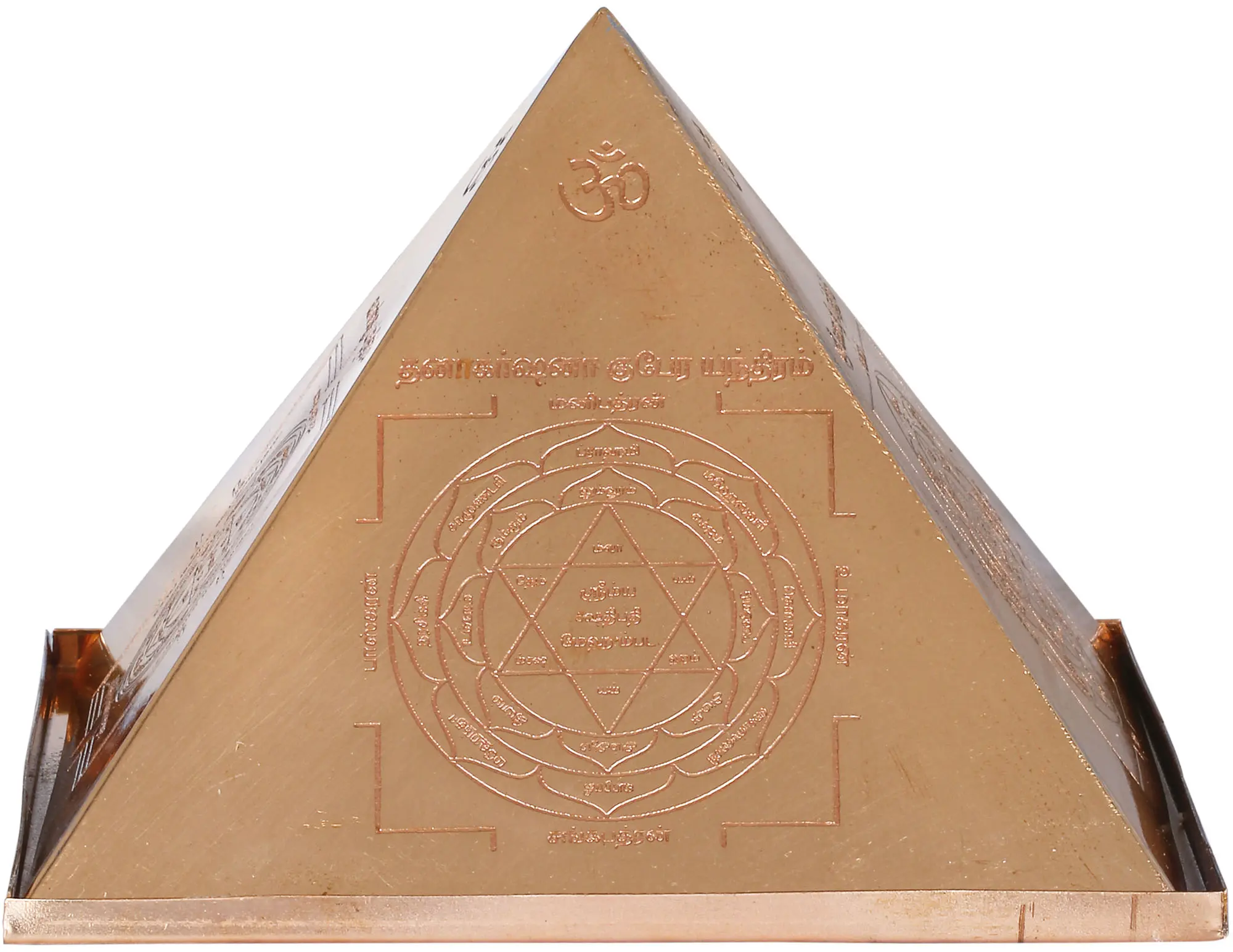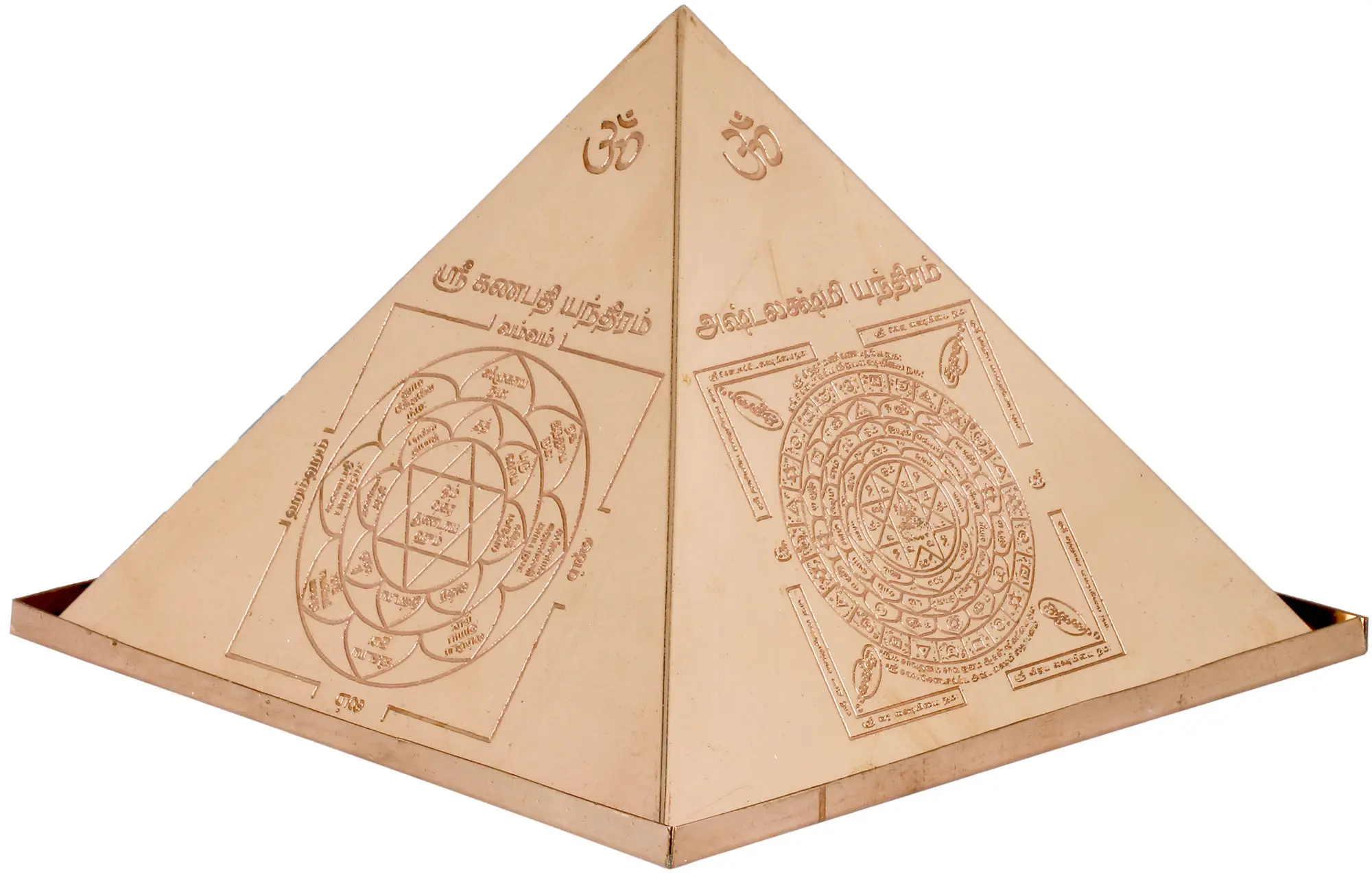 This item is made of copper, a metal highly regarded in Vastu and Ayurveda for its purifying and energy-conductive properties. Each detail, including the inscriptions in Tamil, are thoughtfully incorporated to align with the principles of Vastu. The precision and care taken in its creation ensure that it not only serves as an aesthetic addition to your space but also functions as a powerful tool for harmonizing your environment. The pyramid shape itself is significant, known to amplify and focus energy.