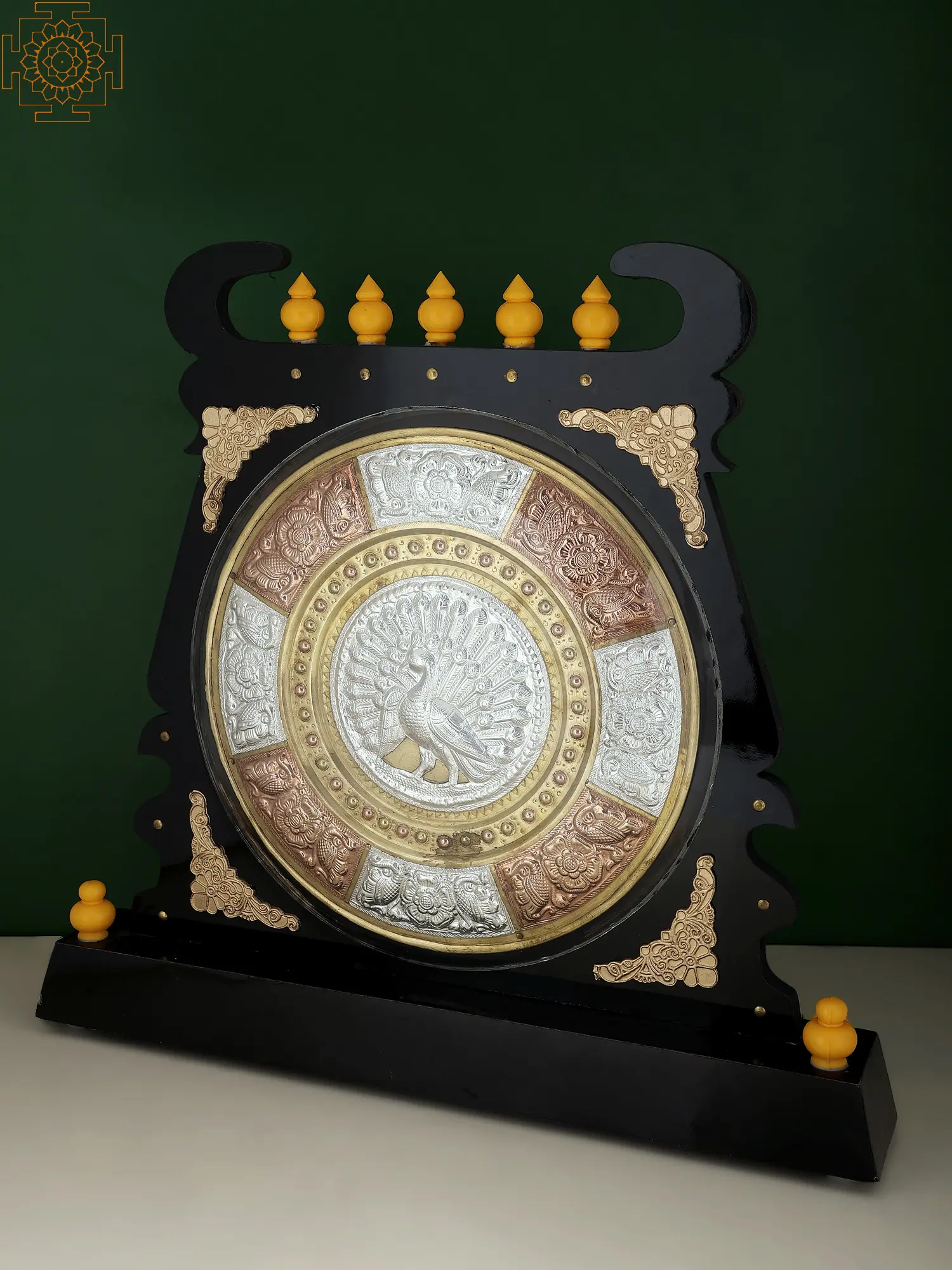 This Tanjore Art Plate in Temple Stand, crafted from Brass with Copper accents, is a divine masterpiece. Adorned with blessed images, a pair of golden peacocks grace the corners, while a central silver peacock takes a prominent position. The plate is elevated with wooden Kalash motifs on the top and bottom sides, enhancing its sacred allure.