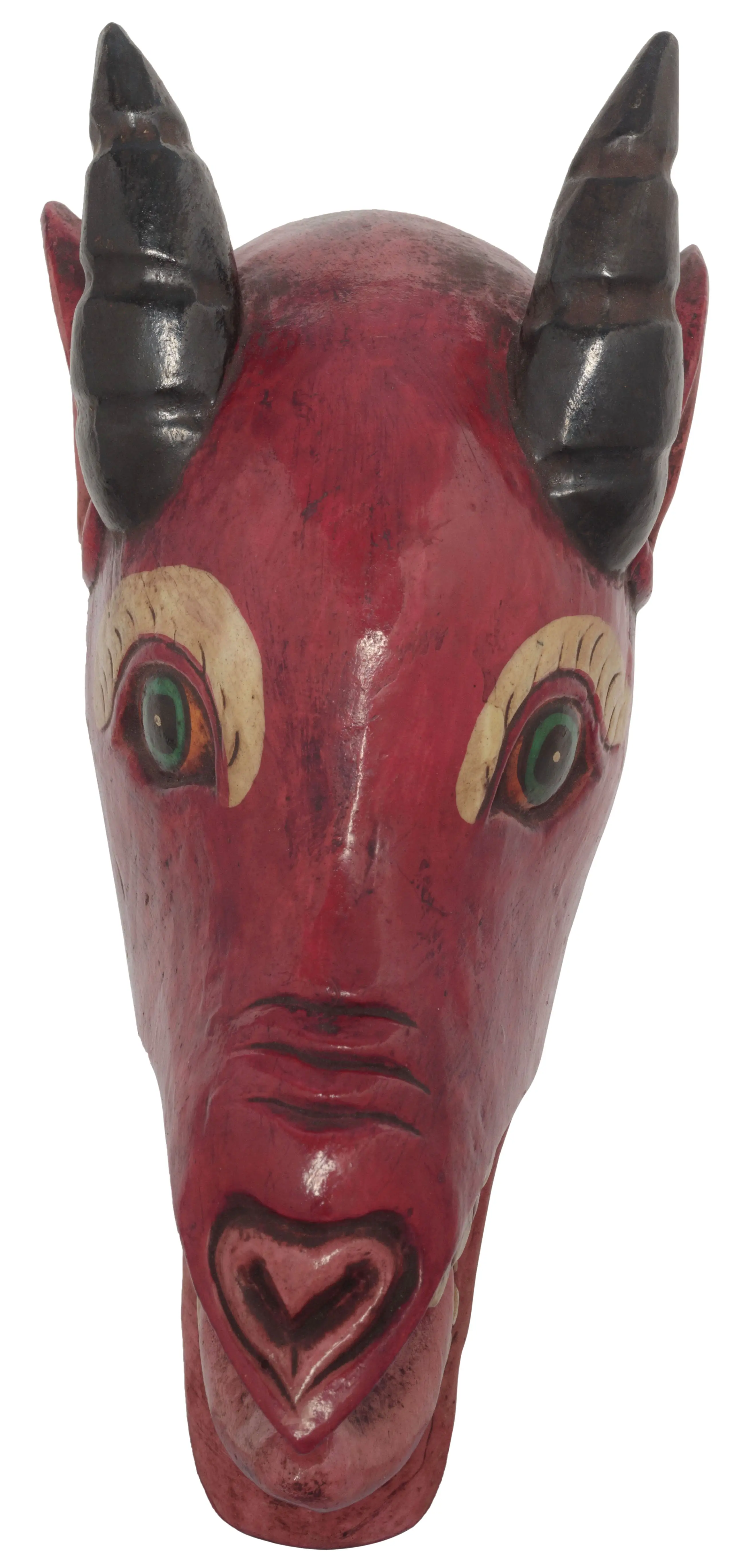 The mask presents a striking blend of vivid color and intricate features. Its reddish hue forms the base, which is then contrasted by the dark, sharply defined horns. A creamy, eye-shaped patch accentuates the eye itself, which is painted with concentric rings of green and black, creating a captivating focal point. The mask also features a partially open mouth, revealing a row of painted teeth and a protruding tongue. The heart-shaped nose adds another layer of visual interest, enhancing the mask's distinctiveness. The expressive features evoke a sense of both power and mystery, making it a captivating piece of art.