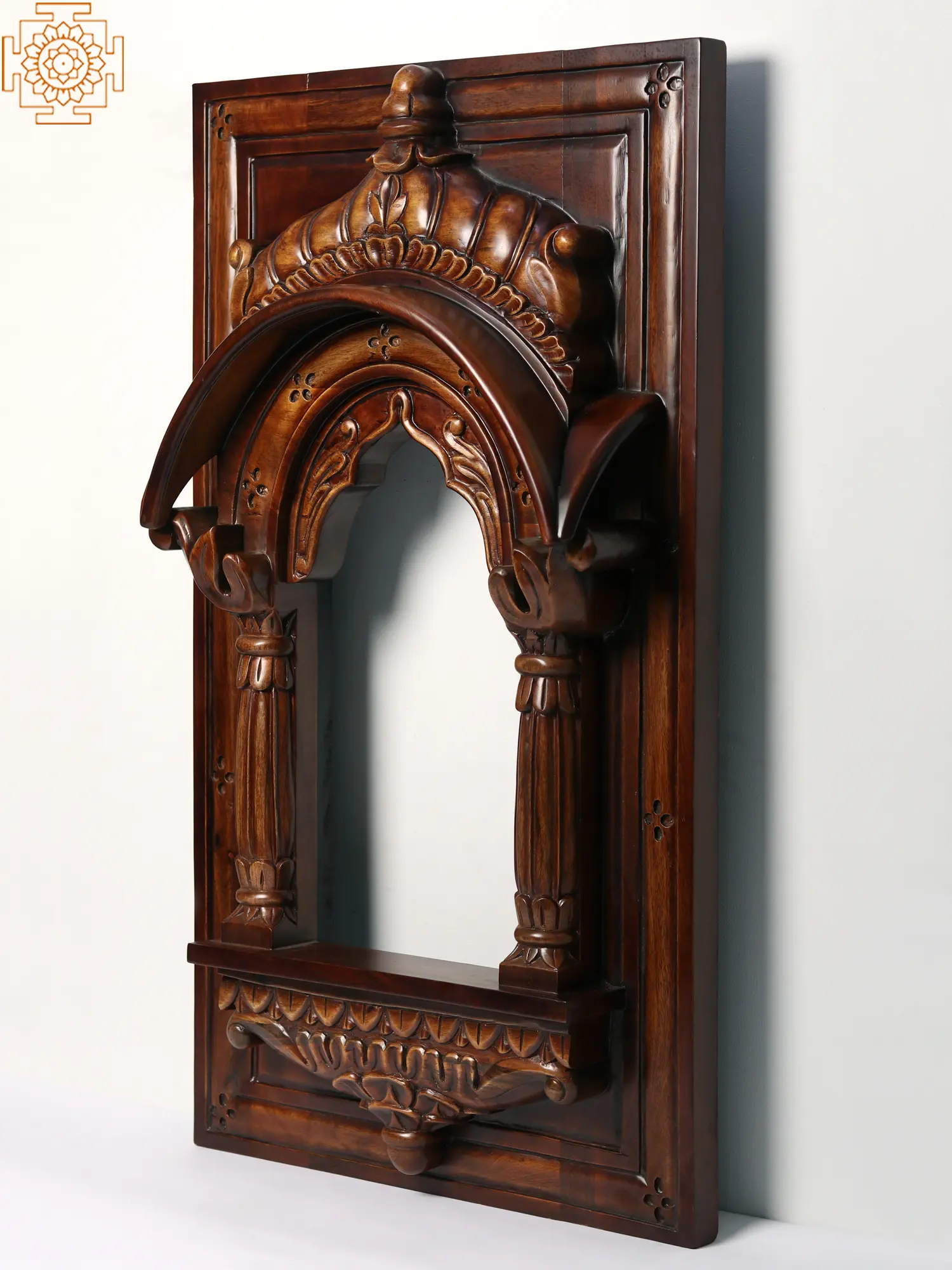 This Teakwood Designer Jharokha is a stunning embodiment of traditional Rajasthani architecture, resembling the intricate windows found in palaces and forts. Its design pays homage to the cultural richness of Rajasthan, showcasing the fine craftsmanship associated with this region. This exquisite piece can transform any plain wall into a focal point of aesthetic charm, commanding attention and infusing a sense of regality into the space.