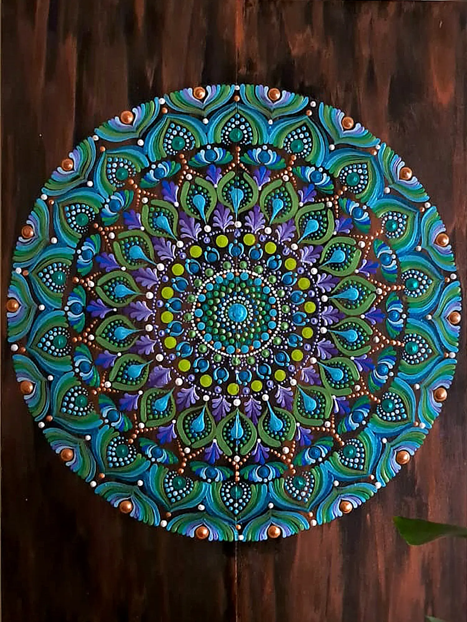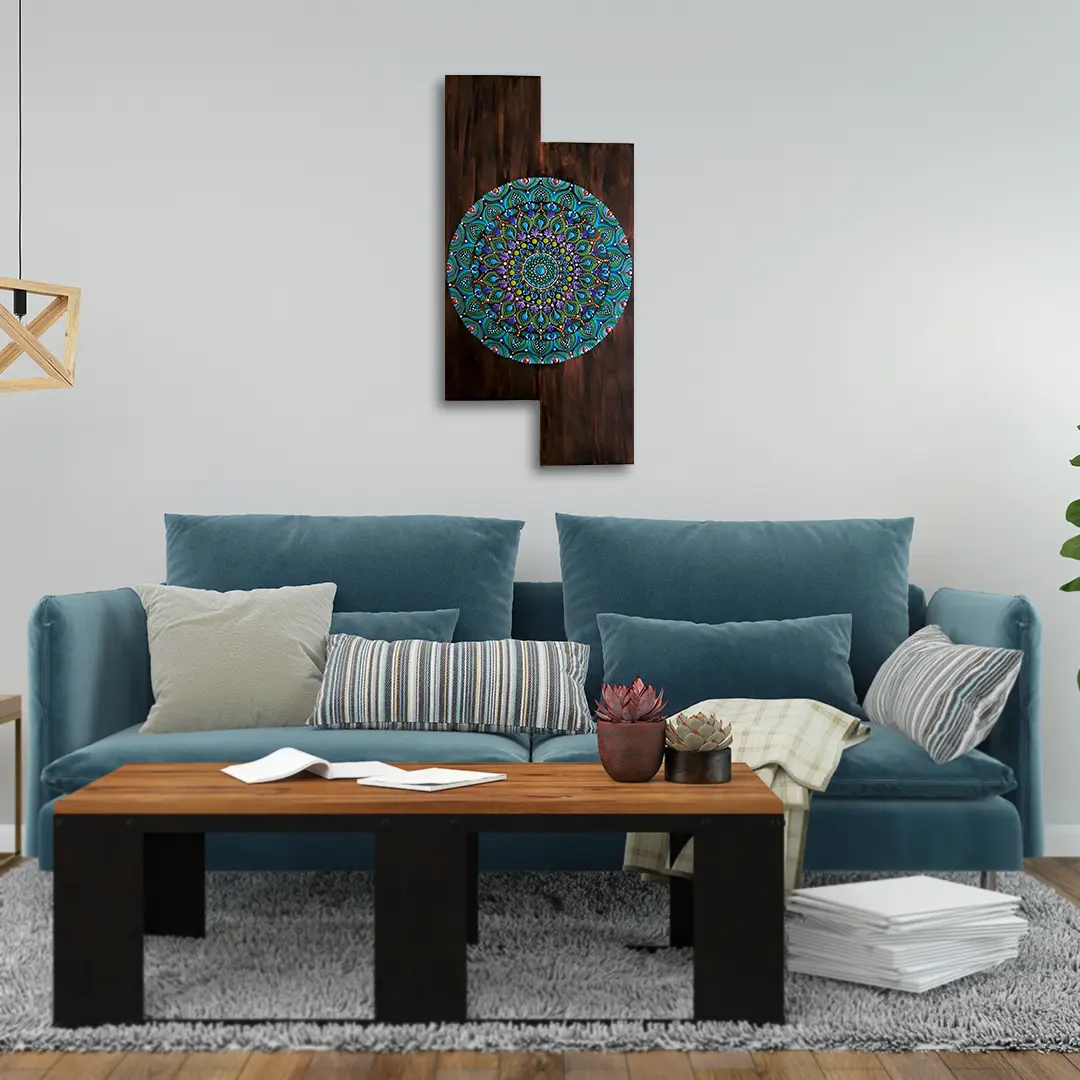This acrylic artwork on MDF board unveils the beauty of the Teal Cremon, harmonizing dots and colored lines on a wooden panel. The asymmetrical framing introduces a unique dimension, enhancing the visual impact. A captivating floral pattern, intricately rendered, exudes beauty, drawing the eye into a mesmerizing dance of colors.