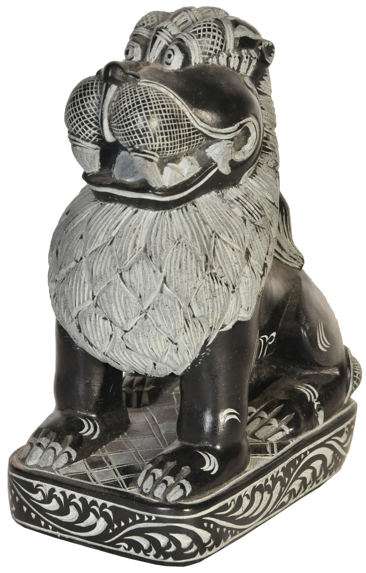 Each detail of this magnificent creature is lovingly carved by skilled artisans in Mahabalipuram, India, a region renowned for its rich history of stone carving. The statue is created from Katappa Stone, a durable and beautiful material that lends a unique texture and character to the piece. The distinct coloring of the stone adds depth and dimension, highlighting the intricate details of the lion's mane, face, and powerful paws. Observe the detailed etchings that bring the figure to life. From the texture of the fur to the intensity of the gaze, every element is thoughtfully executed, showcasing the artisan's mastery. The base is carved with an alternating triangular, leaf-like floral design, adding a layer of beauty and texture to the overall design.