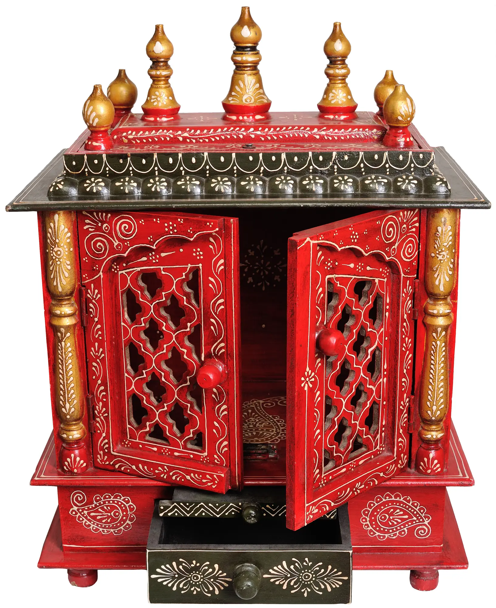 The temple's double doors feature a delicate latticework pattern, allowing glimpses of the divine images within while adding an element of artistic charm. Surrounding the doors are swirling white patterns, adding a touch of elegance and visual interest. Flanking each door are ornate golden pillars, which add both visual appeal and structural support. At the base of the temple, a charming drawer provides storage for prayer beads, incense, or other sacred objects, keeping your spiritual essentials neatly organized. The drawer is adorned with its own unique floral design. Crowning the temple are decorative finials, further enhancing its regal appearance. The top is accented with an eave that is designed with elegant detailing as well.