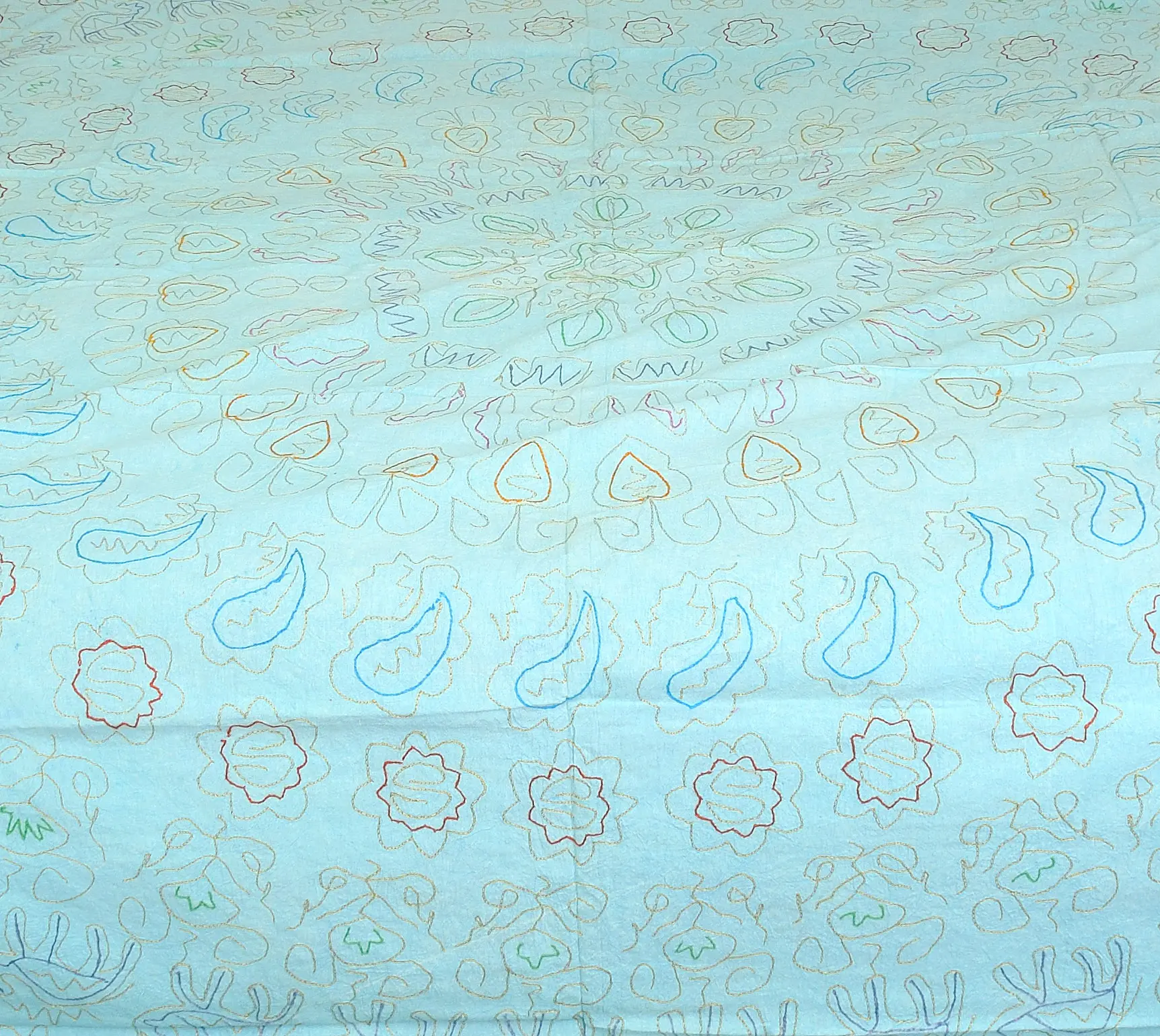 The beauty of this bedspread lies in its details. Delicately embroidered with zari work, shimmering threads catch the light, adding a subtle touch of opulence and visual interest. The intricate patterns, inspired by nature and traditional motifs, create a mesmerizing tapestry that invites closer inspection. Every stitch tells a story, reflecting the dedication and skill of the artisans who poured their hearts into creating this masterpiece. The stonewashed finish provides a lived-in look, enhancing the softness of the fabric and lending it a unique character.