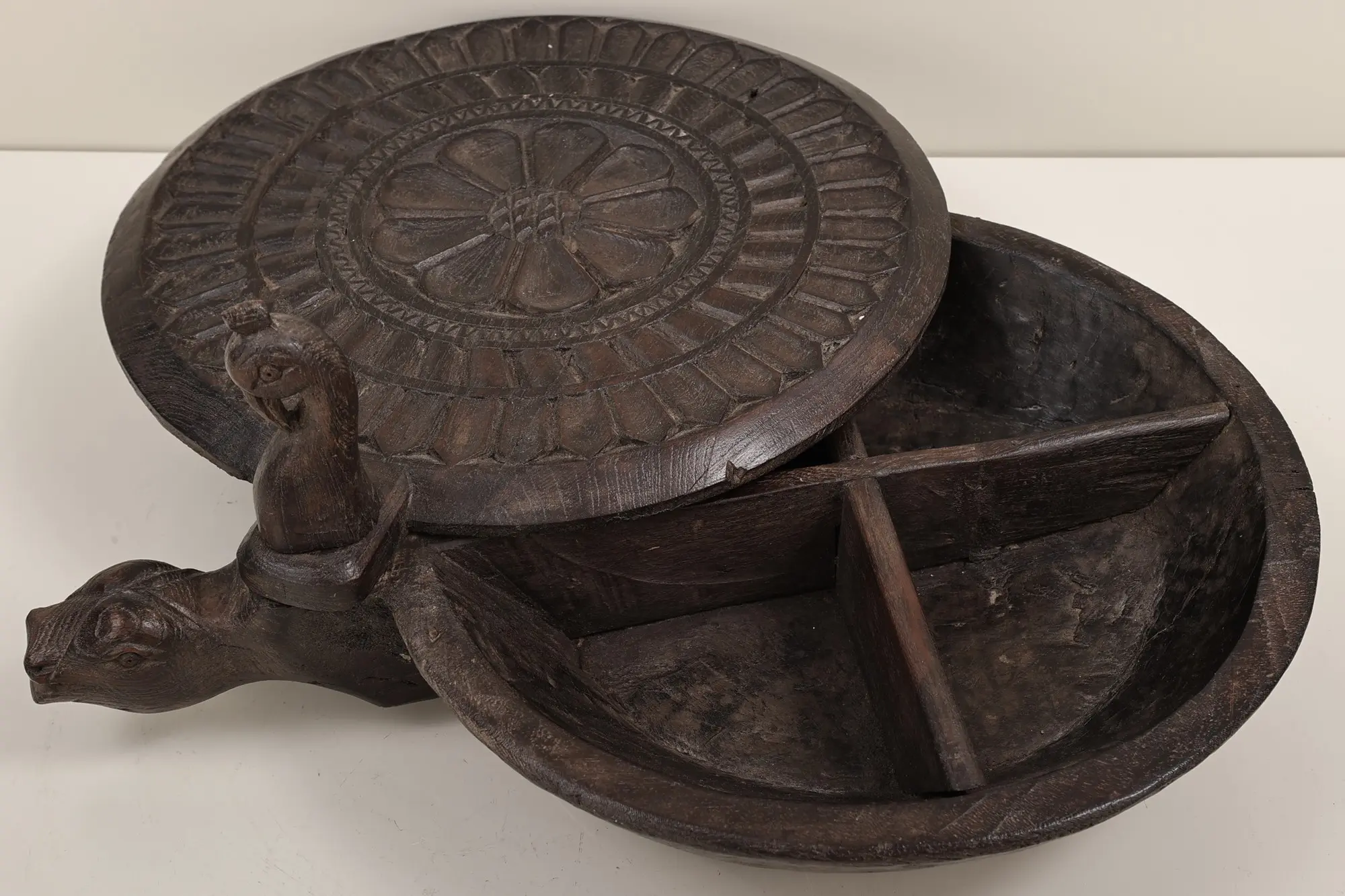 More than just functional, this item is a statement piece. Whether you're hosting a gathering or simply enjoying a quiet evening at home, this dry fruit box elevates the experience. The playful yet refined design makes it suitable for a variety of interior styles, from rustic and bohemian to eclectic and contemporary. It's a versatile piece that adds character to any space. The tortoise head stretches out as the handle to lift the lid, on the oppossite end, a peacok shaped neck is carved onto the wood. This handmade art piece is made in India, showcasing the rich cultural heritage and craftsmanship of the region. Add a touch of Indian artistry to your home and enjoy a unique piece that blends beauty and practicality.