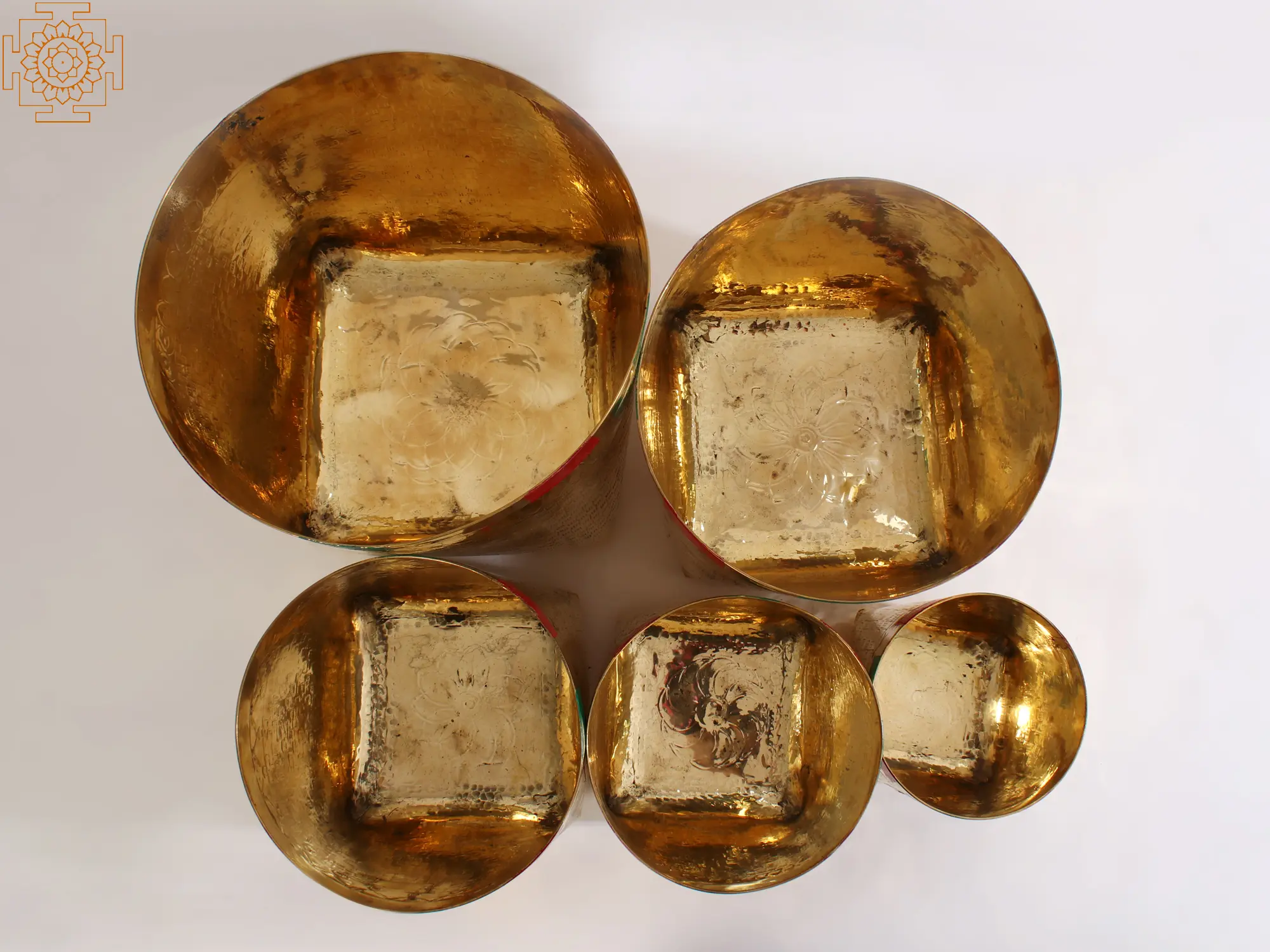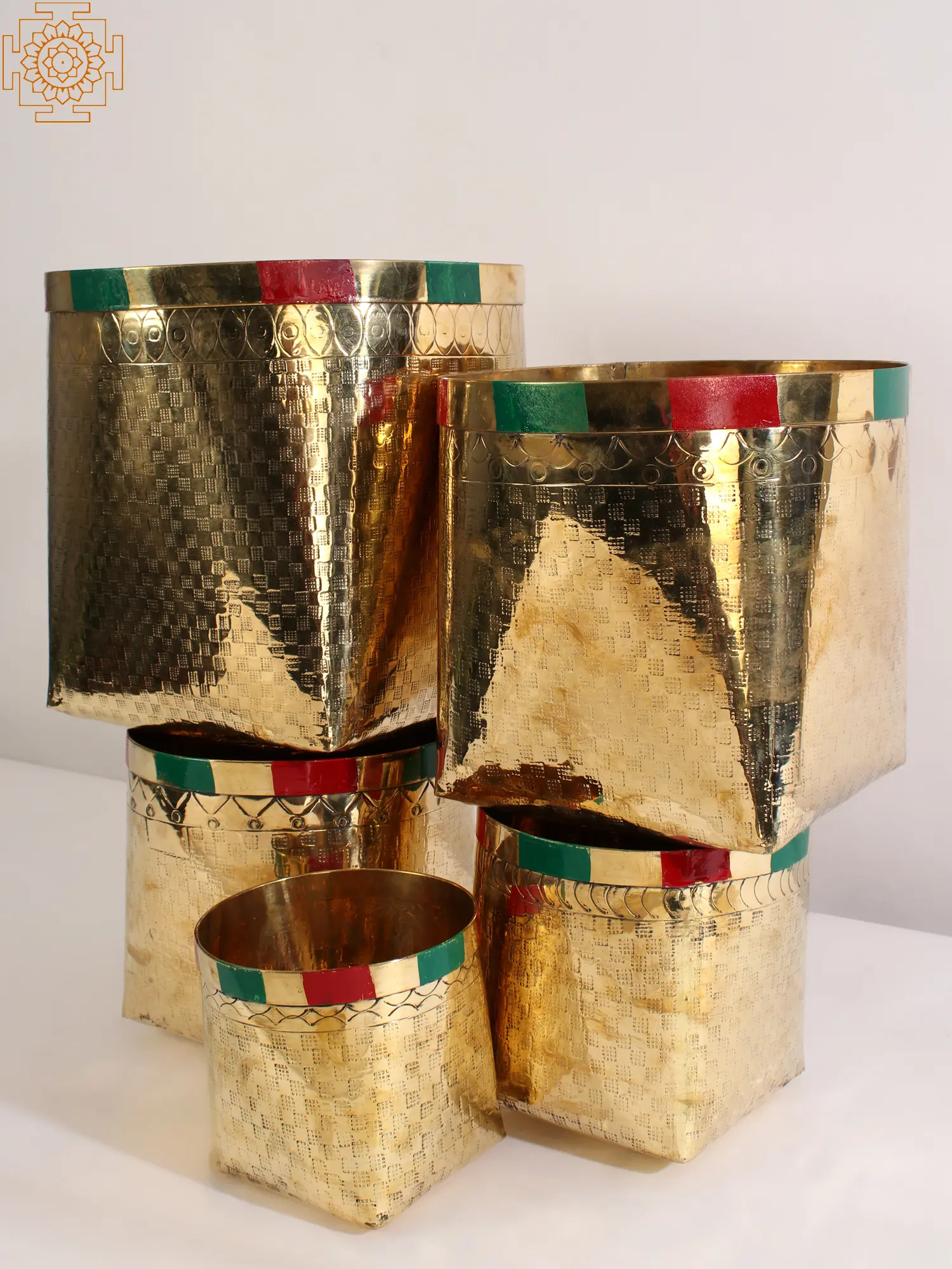 This Traditional Basket for Temple made in Brass comprises a collection of five meticulously crafted brass baskets designed to resemble traditional bamboo baskets. These ornate pieces of religious art feature square-shaped bases and wide-mouthed openings. The baskets are adorned with vibrant red and green paint, adding a splash of color and cultural significance. Primarily intended for use in temple settings, these brass baskets hold immense symbolic value in various religious ceremonies and offerings. They serve as vessels to present offerings to deities, symbolizing devotion, and cultural traditions. These sets embody the fusion of aesthetics, spirituality, and craftsmanship, enhancing the sacred ambiance within temples.