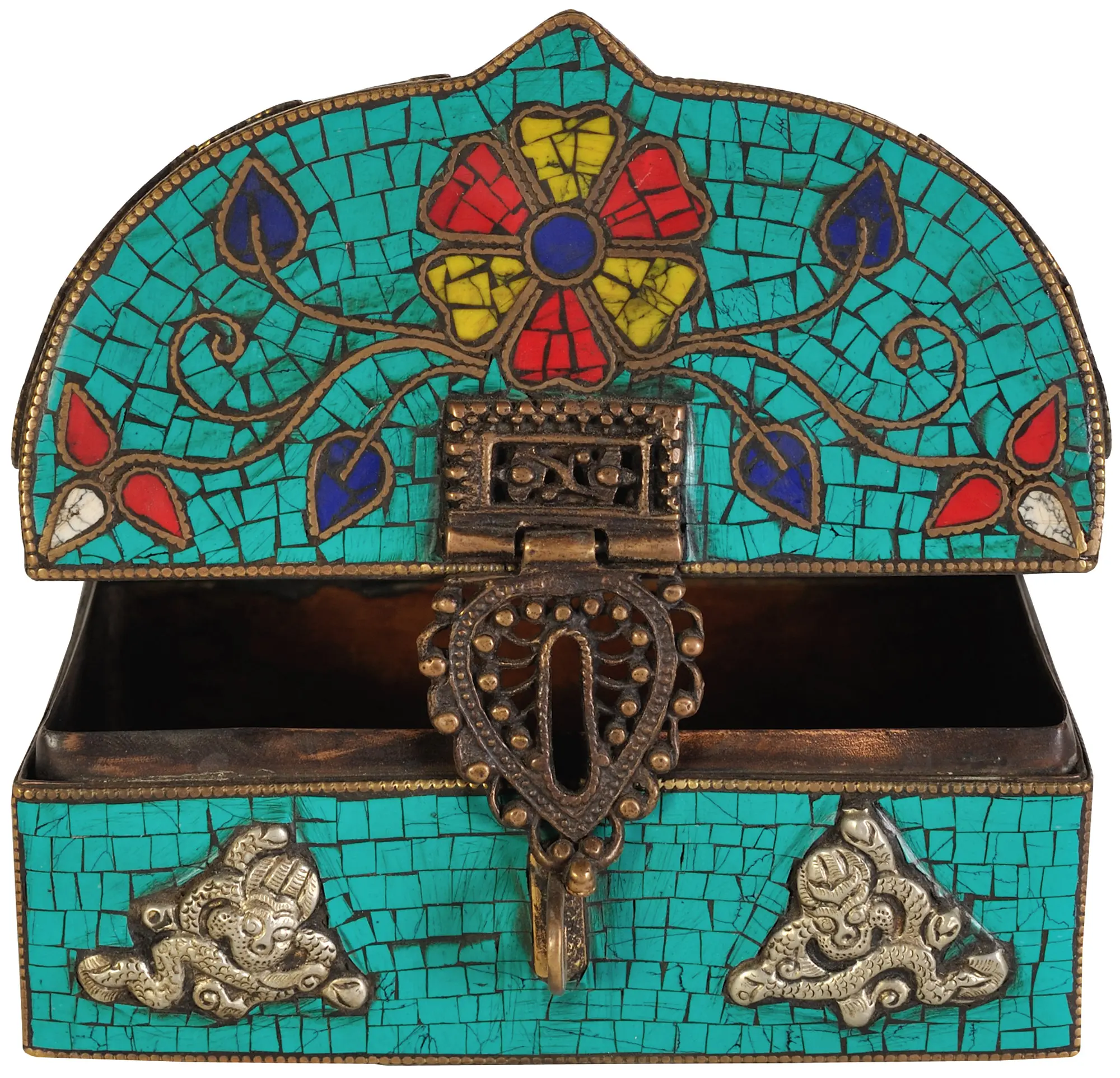 This box is built to last, crafted from high-quality materials that have been selected for both their durability and aesthetic appeal. The rich tones of the metalwork create a stunning contrast against the mosaic background, enhancing the overall visual impact. The metal trim adds a touch of refinement and structure to the design. The blend of materials not only contributes to the box's visual allure but also ensures its long-lasting beauty.