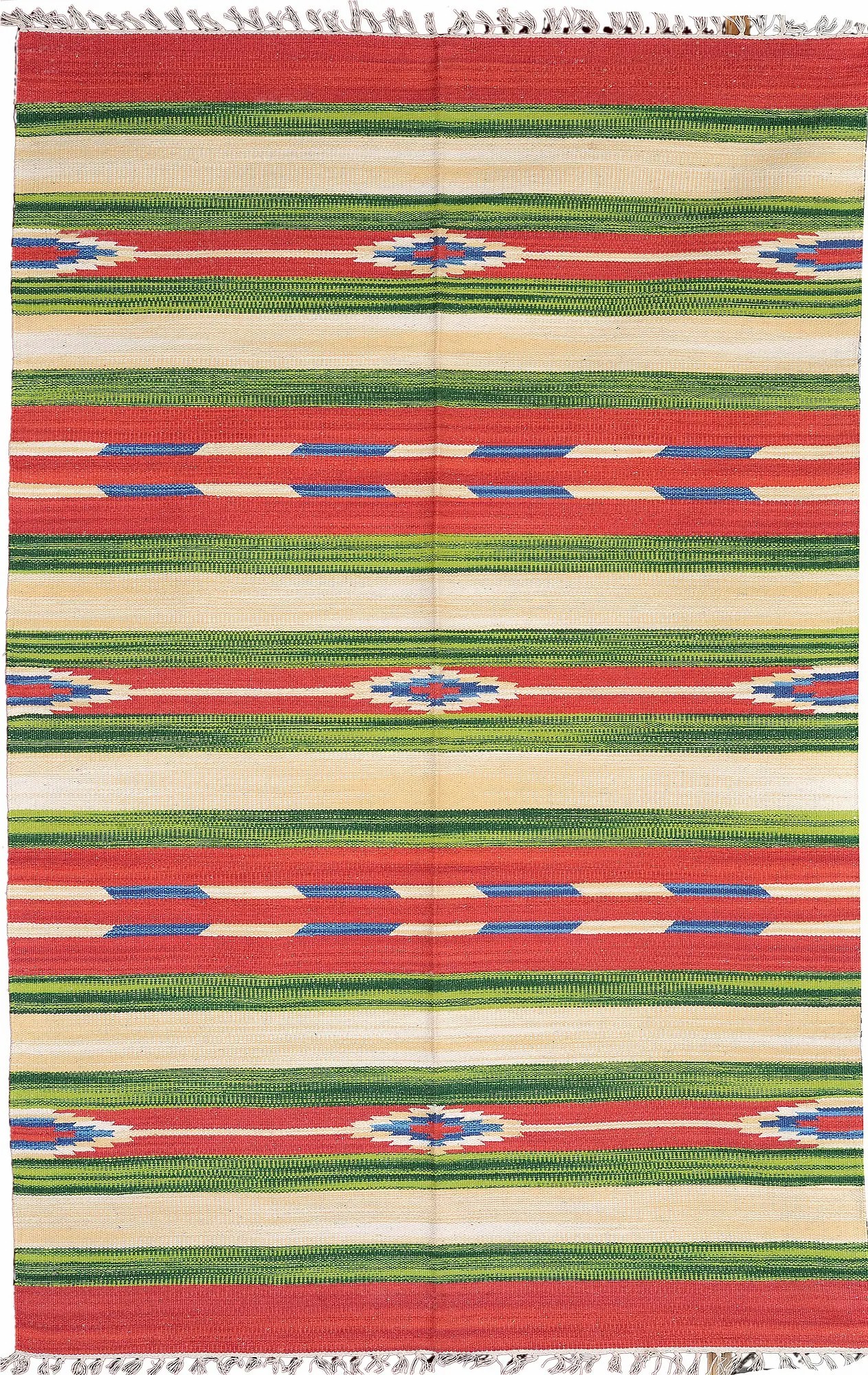 Woven from pure cotton, this dhurrie offers a soft and comfortable feel underfoot. Cotton's natural breathability makes it a great choice for any climate, ensuring year-round comfort. The flatweave construction provides durability, ensuring the rug can withstand daily use in high-traffic areas. The tightly woven fibers create a sturdy and long-lasting piece that will bring joy for years to come. The fringes at each end add a delicate touch of texture and visual interest, completing the rug's distinctive look.