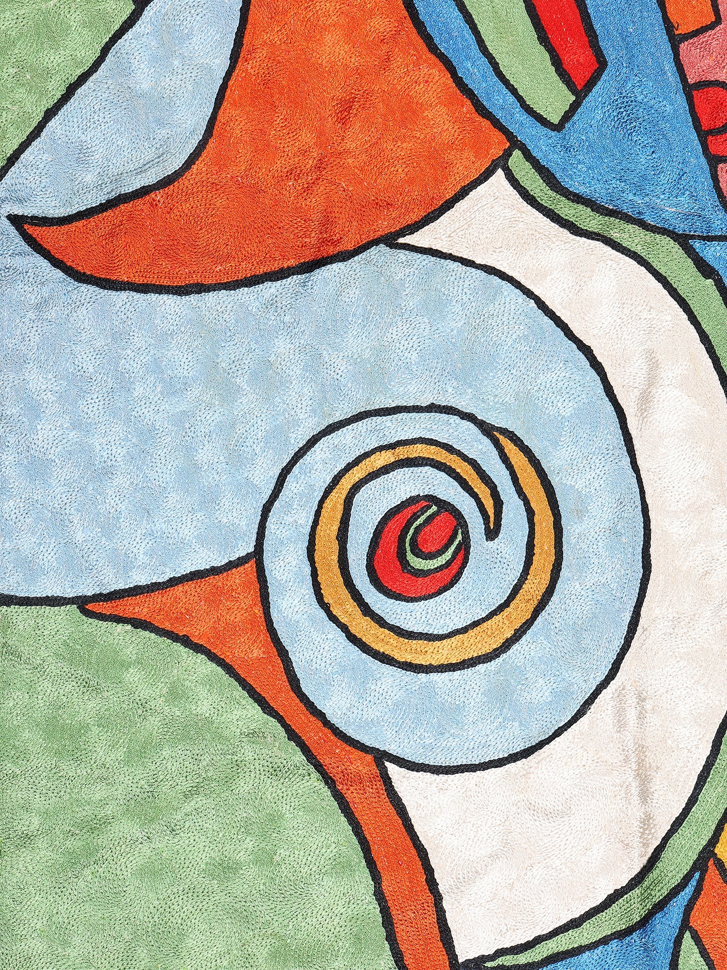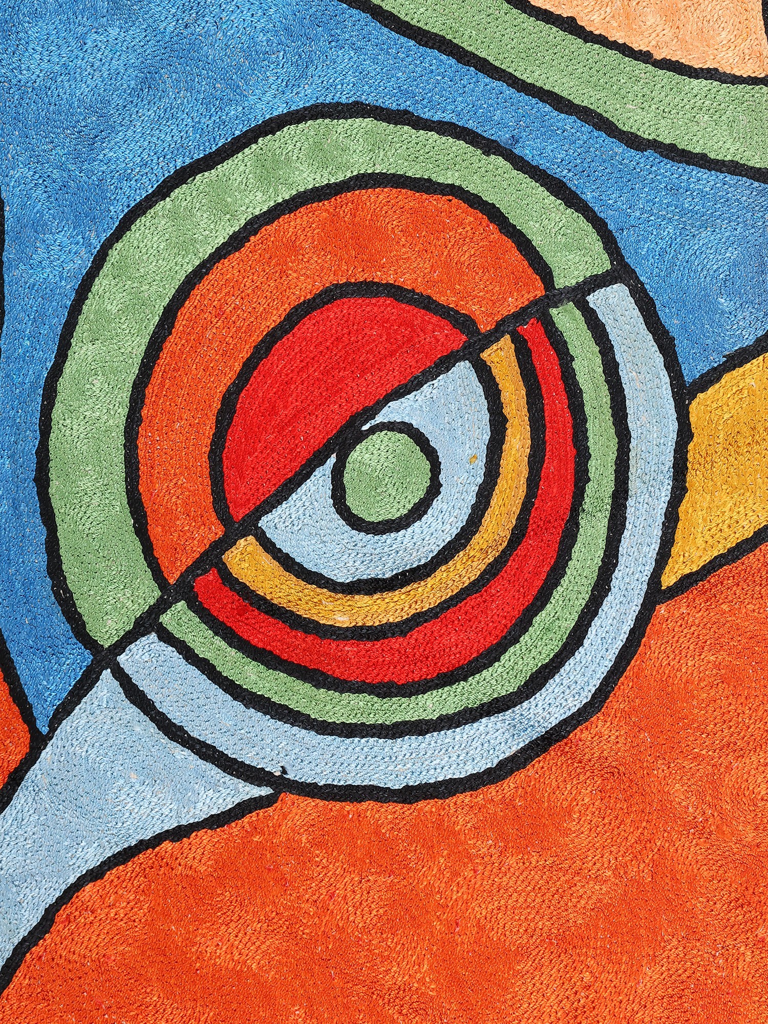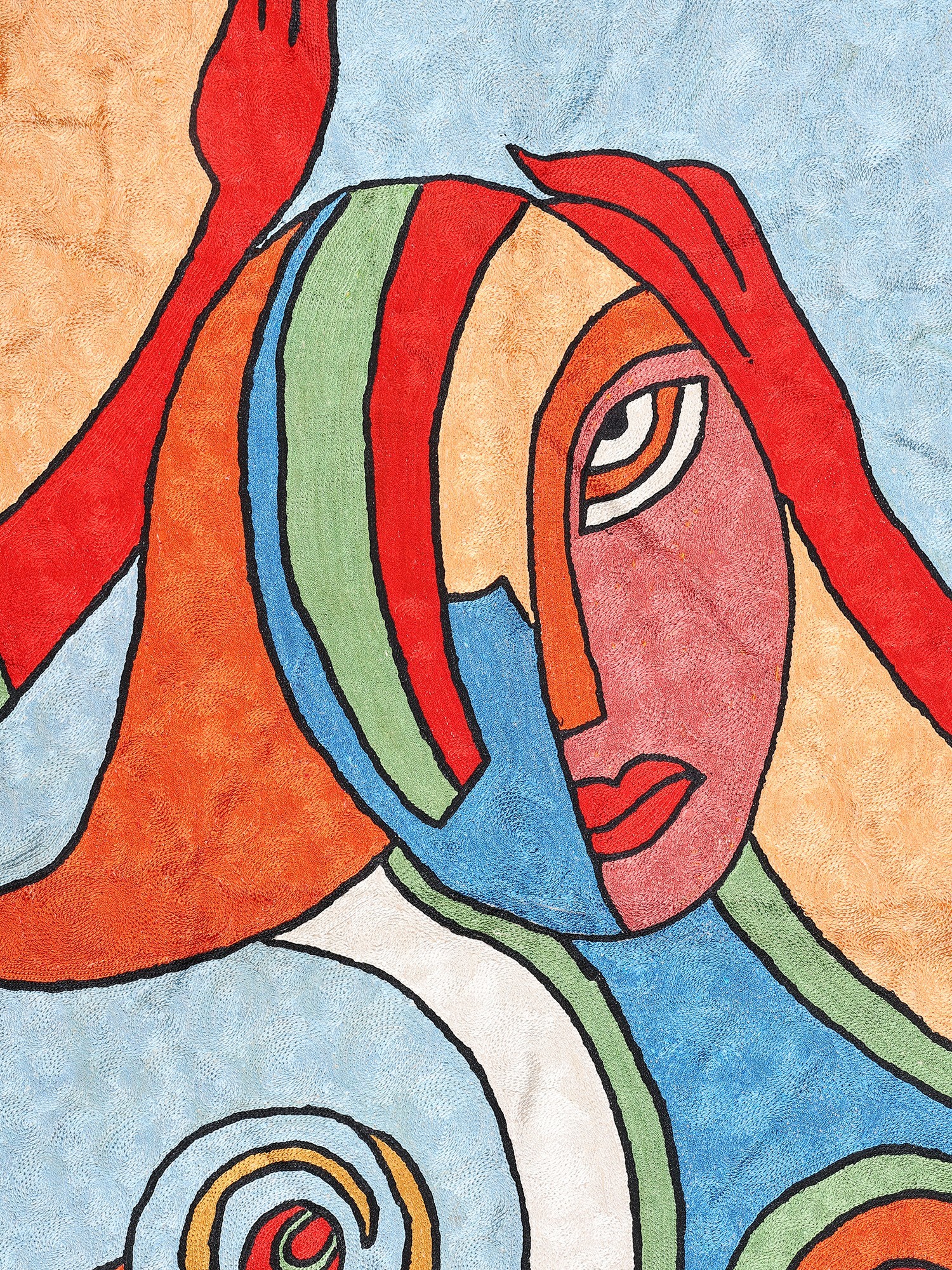 The design itself is a captivating exploration of form and color. Bold lines define abstract shapes that suggest a human profile, enveloped in a symphony of blues, oranges, reds, greens, and subtle creams. The use of silk threads imbues the embroidery with a subtle sheen, catching the light and adding depth to the tactile quality of the artwork. The textured background, achieved through the precise chain stitch, provides a grounding contrast to the fluidity of the depicted forms. This piece is not merely decorative; it’s an invitation to contemplate, to feel, and to engage with art on a visceral level. Whether hung on a prominent wall or used as a unique floor accent, it promises to spark conversation and elevate the aesthetic of any room.