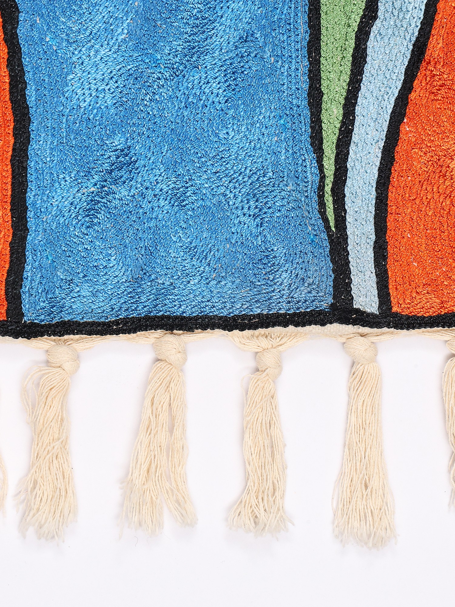 Immerse your living space in the vibrant artistry and rich heritage of Kashmir with this exquisite wall-hanging cum carpet. Crafted with meticulous attention to detail, this piece transcends the ordinary, offering a unique blend of traditional craftsmanship and contemporary design. The intricate chain stitch embroidery, a hallmark of Kashmiri artistry, brings to life a striking abstract composition, making it a true statement piece for any discerning home.