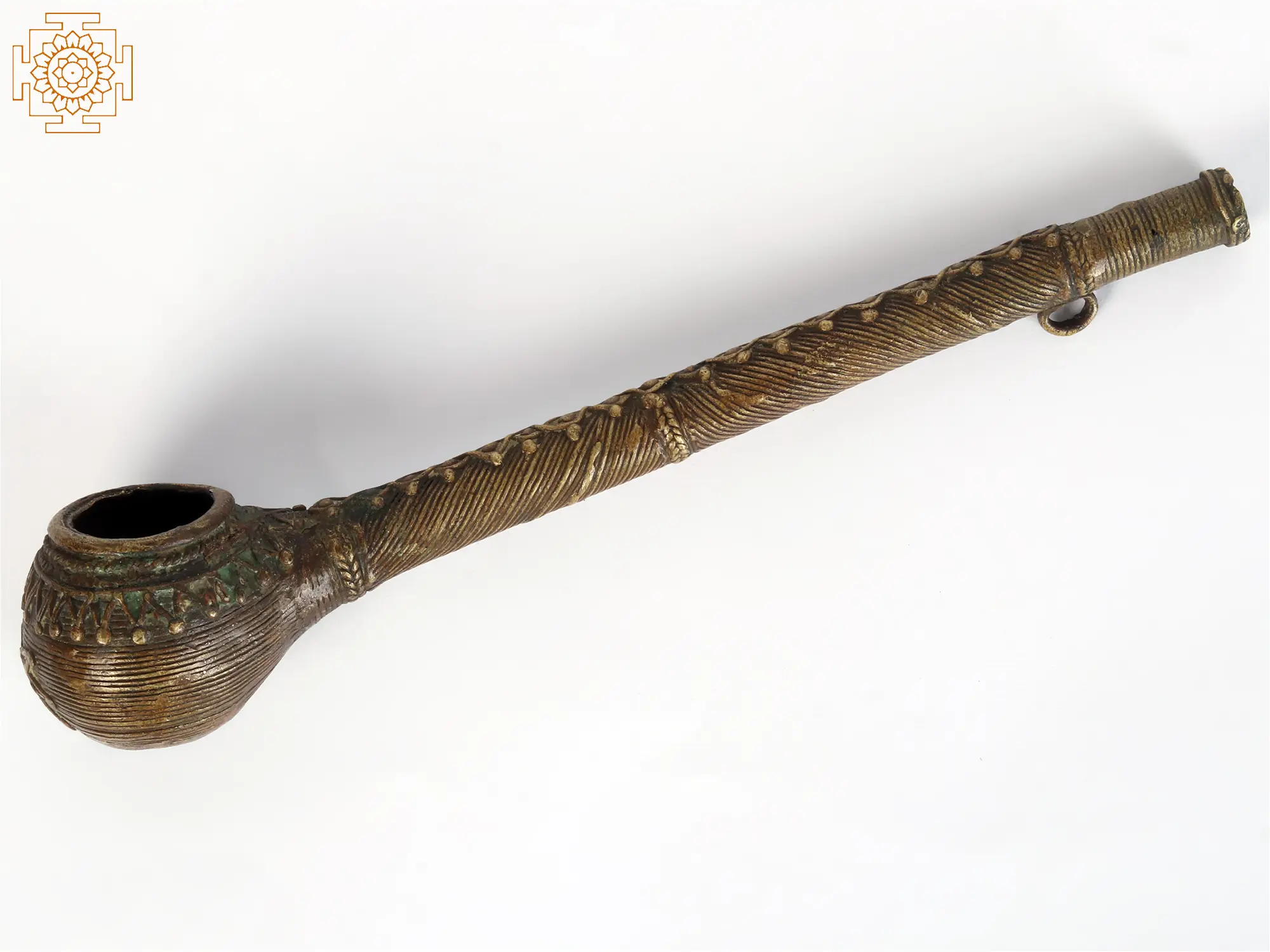This Tribal Small Pipe in Brass, identified as a Dumuni or Smoking Pipe and housed in the Odisha State Museum, is a rare collectible that exemplifies traditional craftsmanship. Adorned with the intricate Dhokra pattern manifested through lines, this pipe becomes a visual testament to the rich cultural heritage.