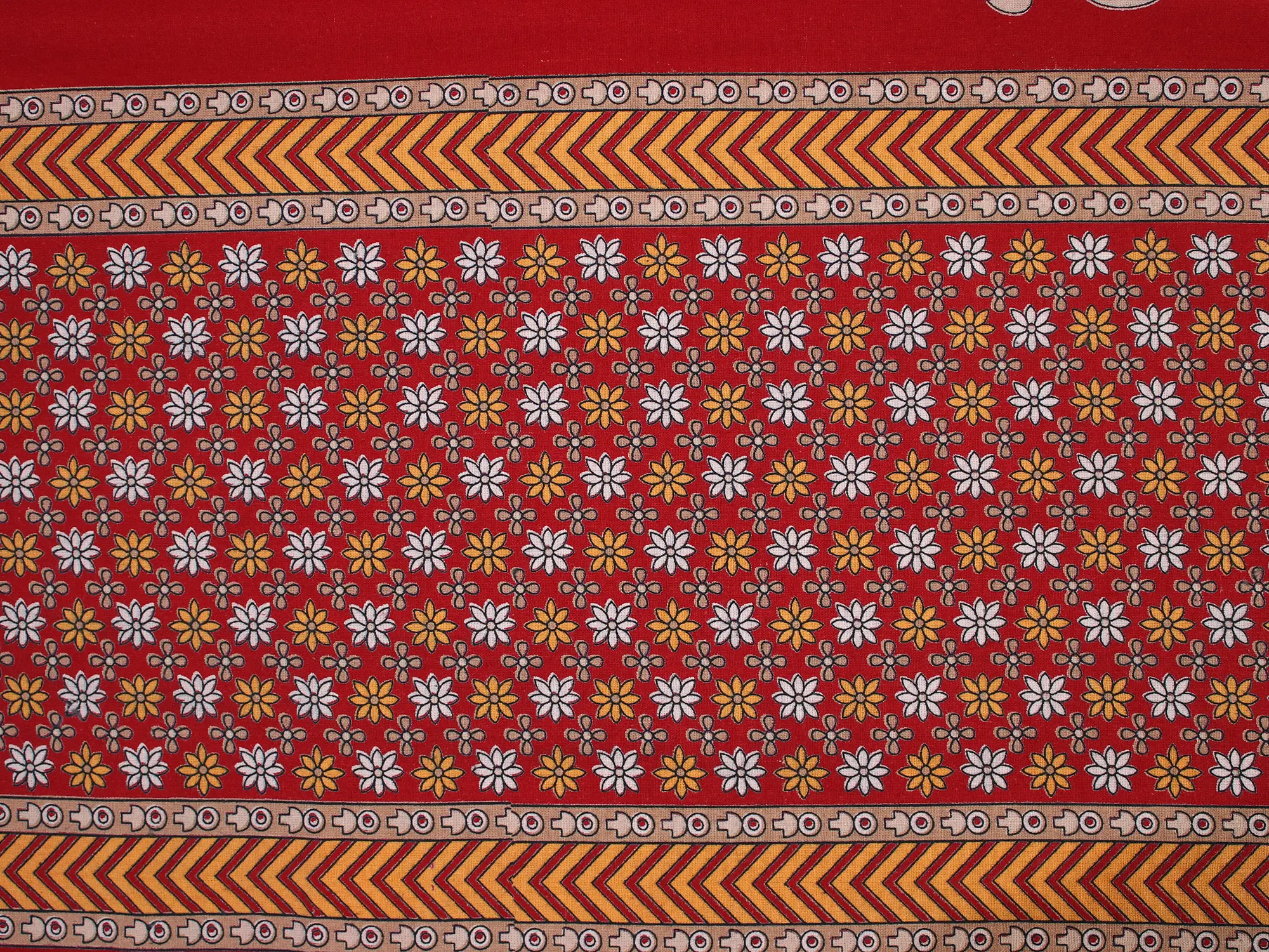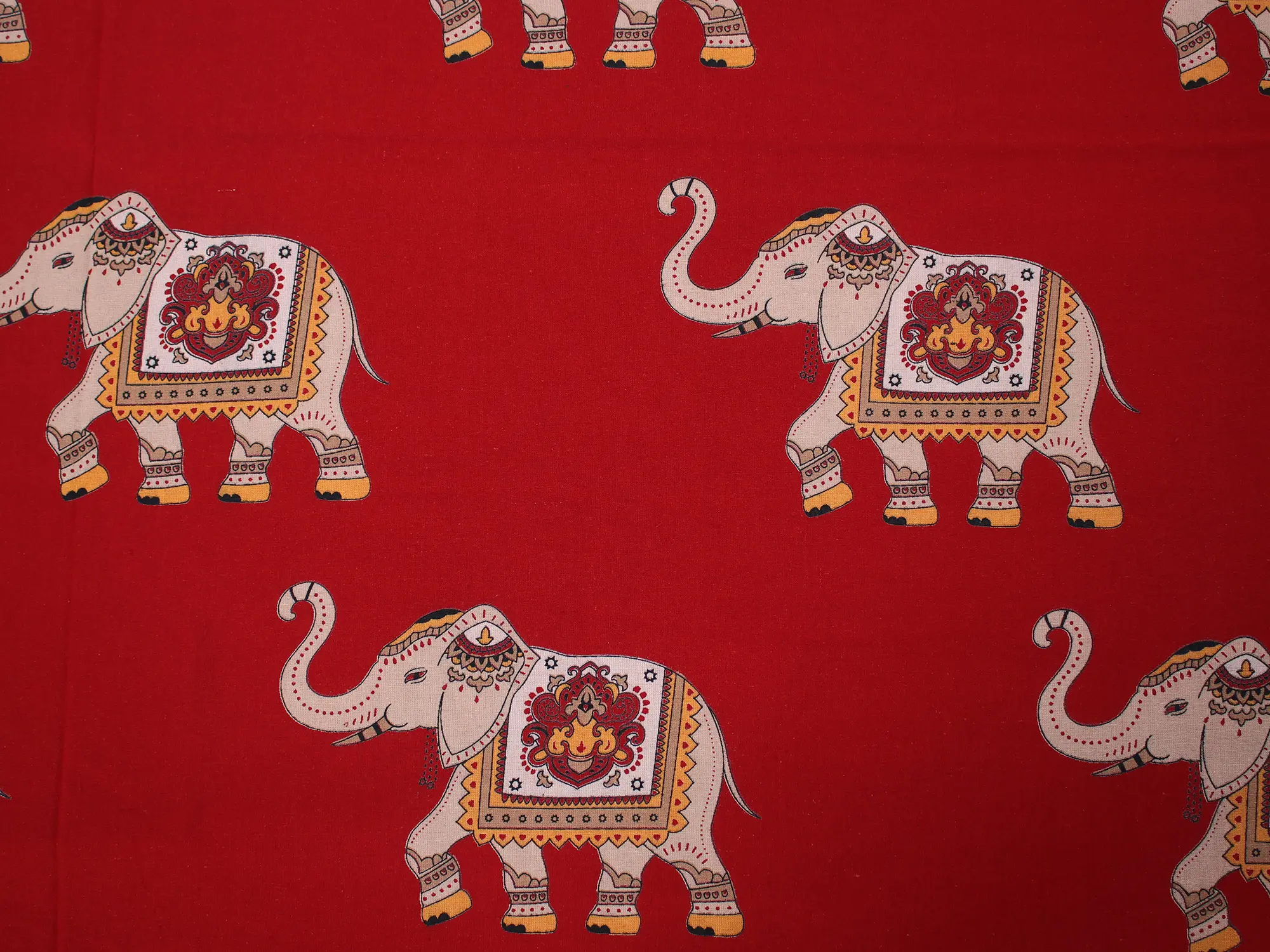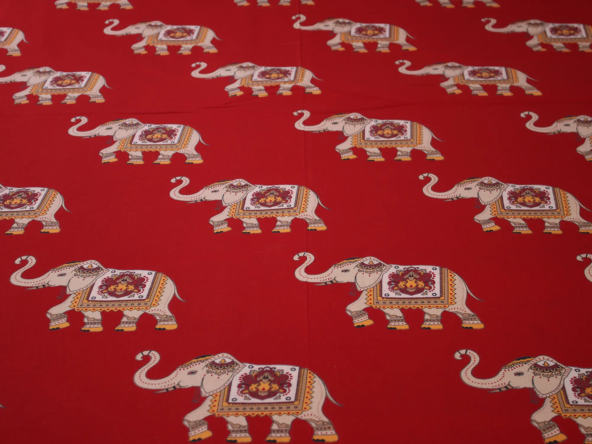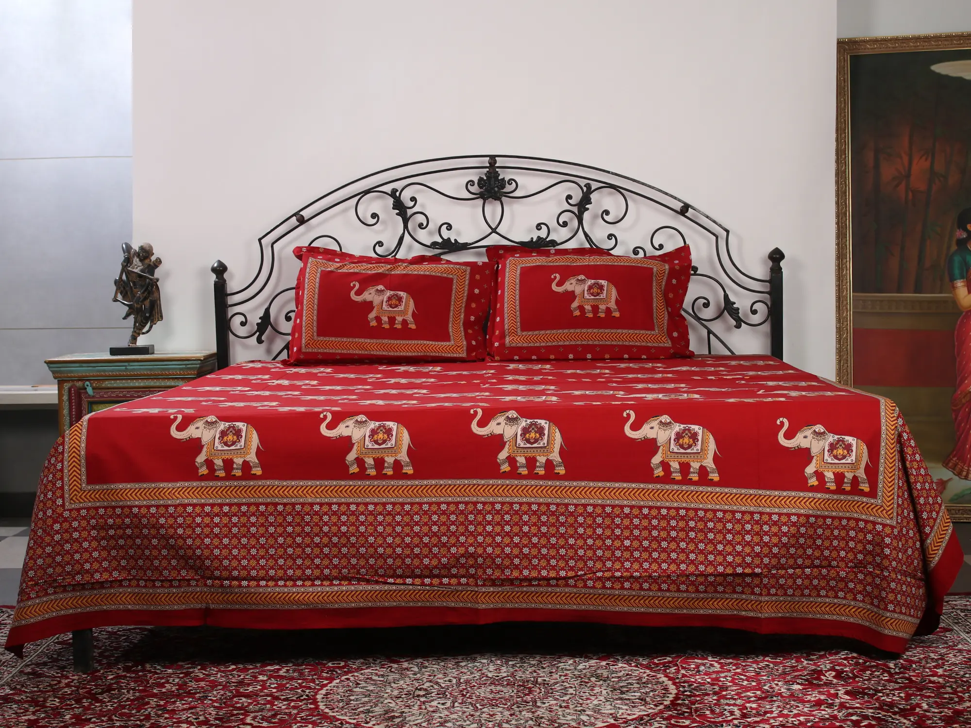 True-Red Color Cotton Handblock Printed Double Bedsheet With All-Over Elephant-Floral Motif And Two Pillow Cover